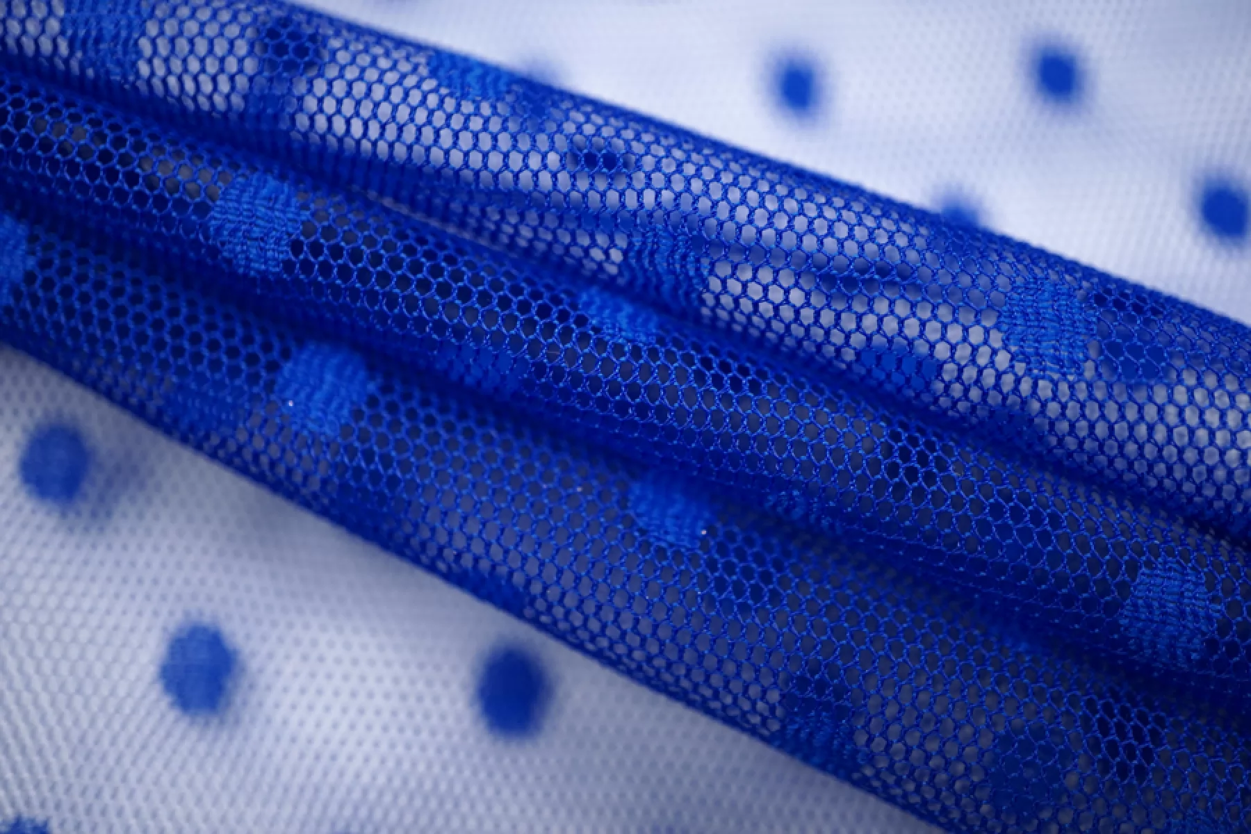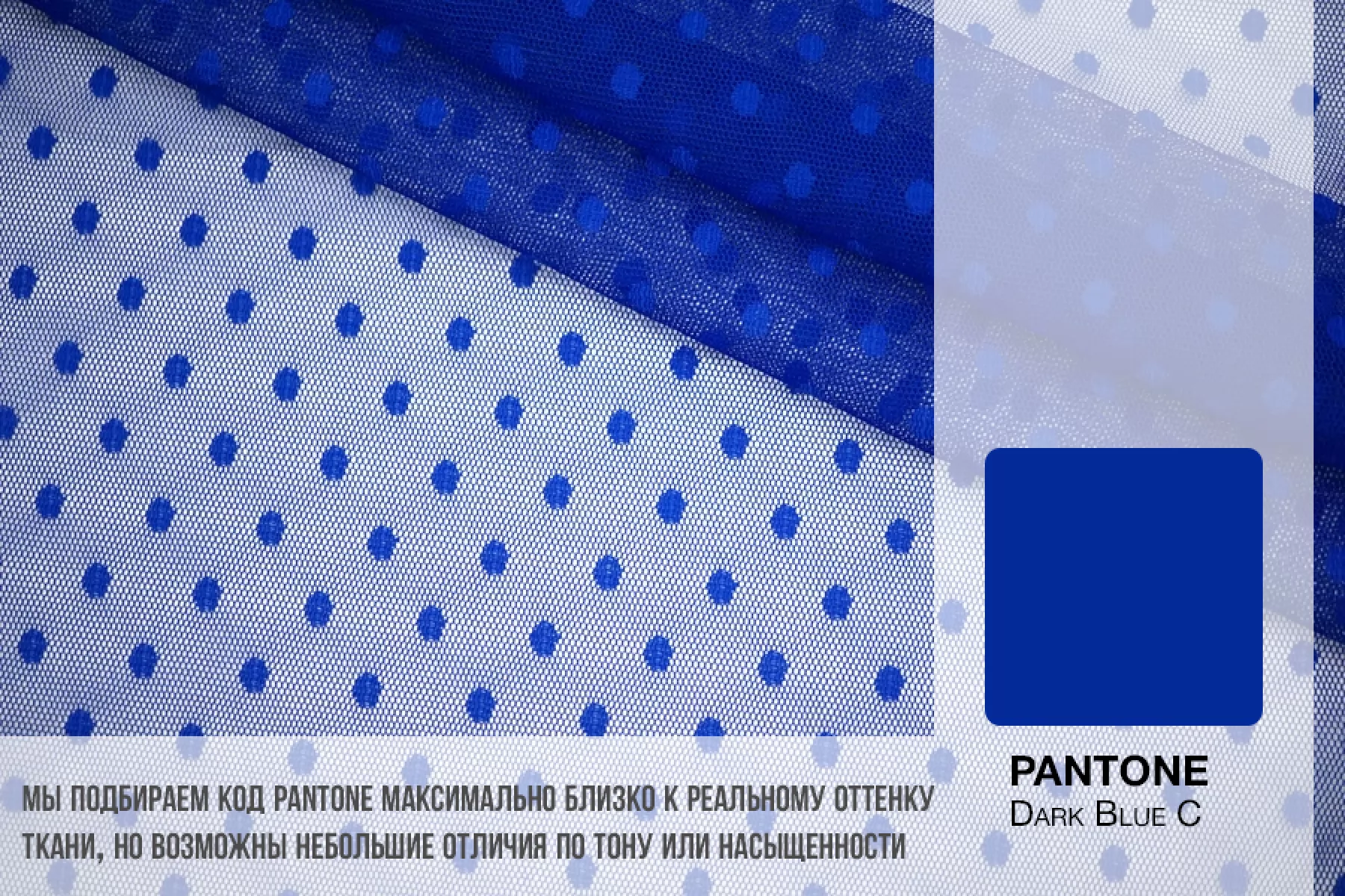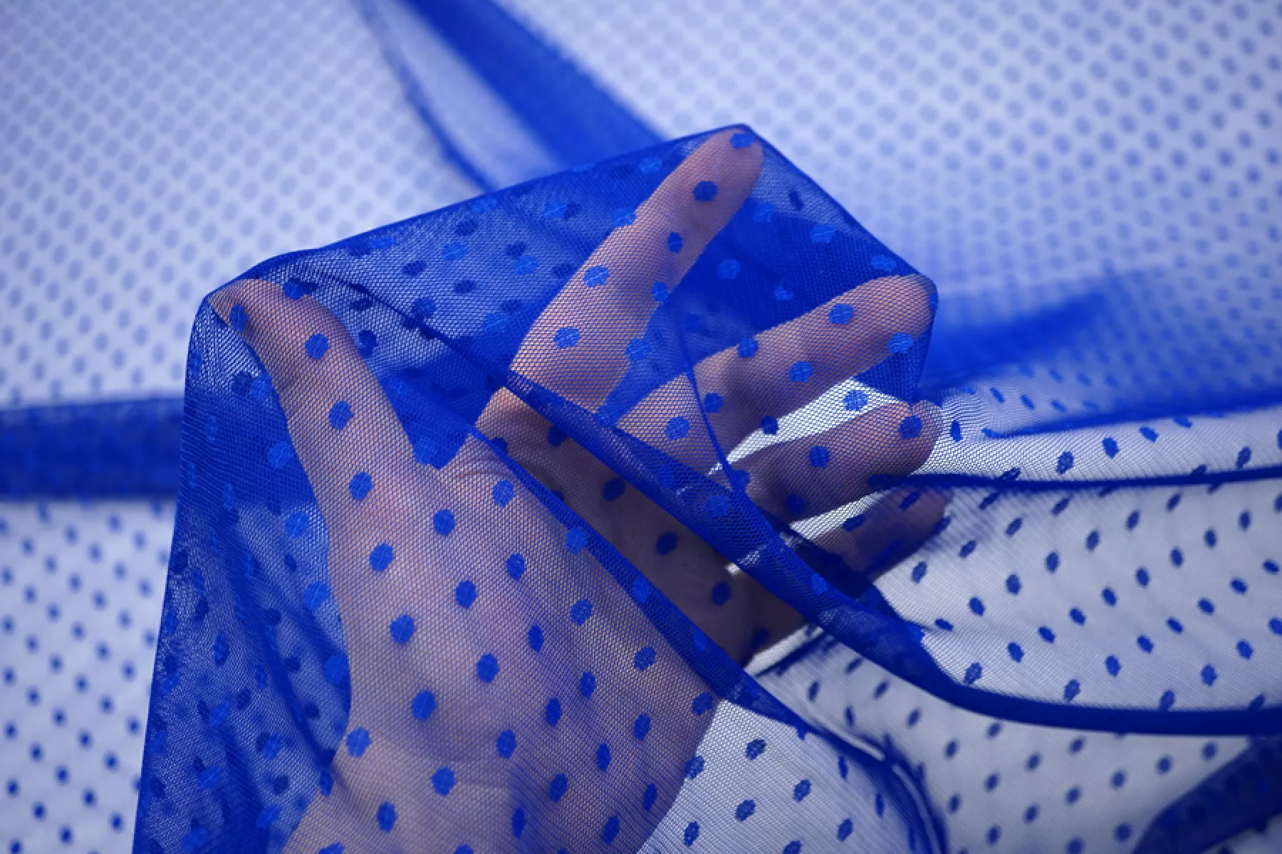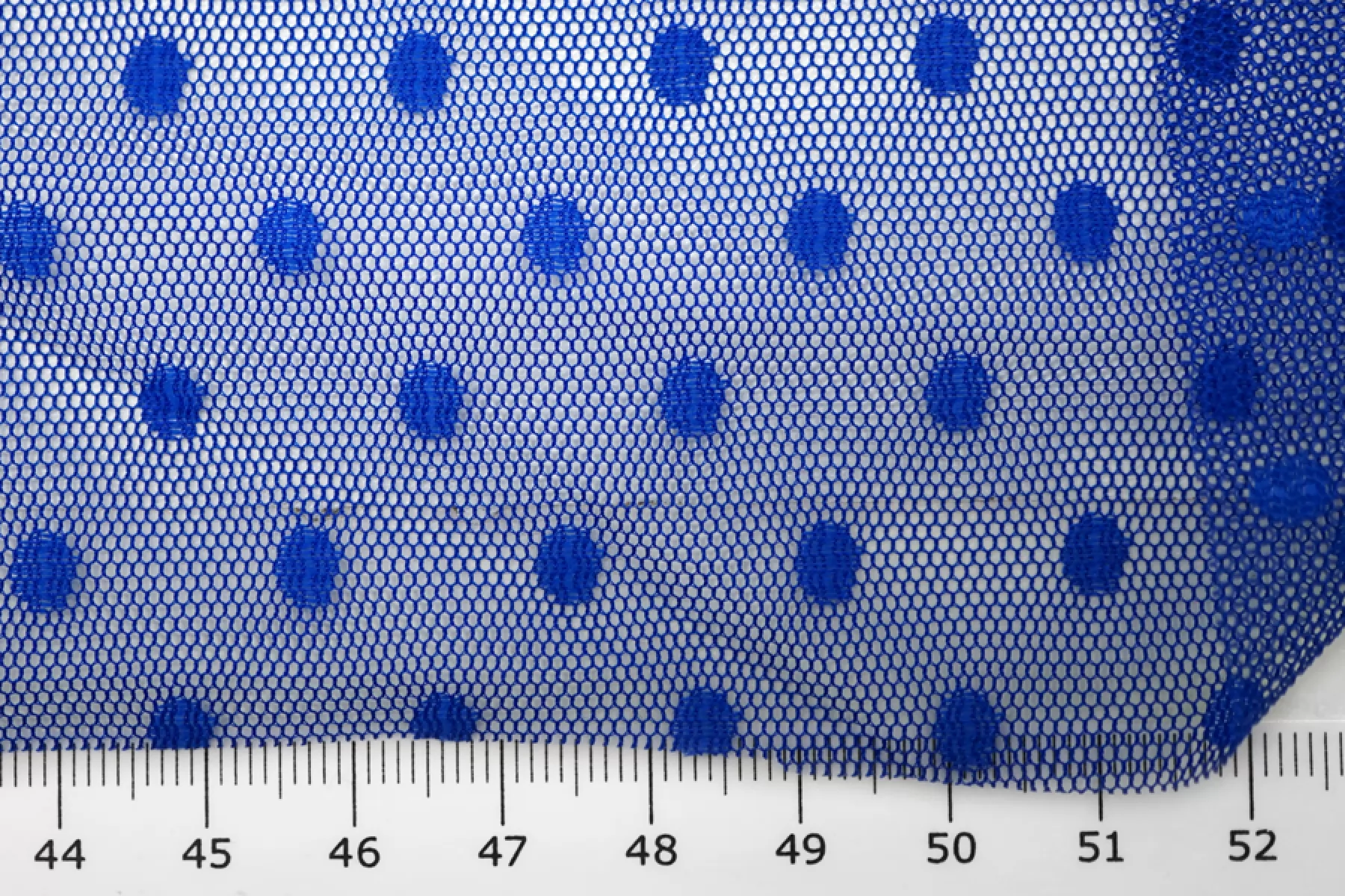 Мягкая итальянская сетка синего цвета в горошек. Тонкая, пластичная, тянется, приятная тактильно. Хорошо подойдет для пошива и декора одежды и белья.