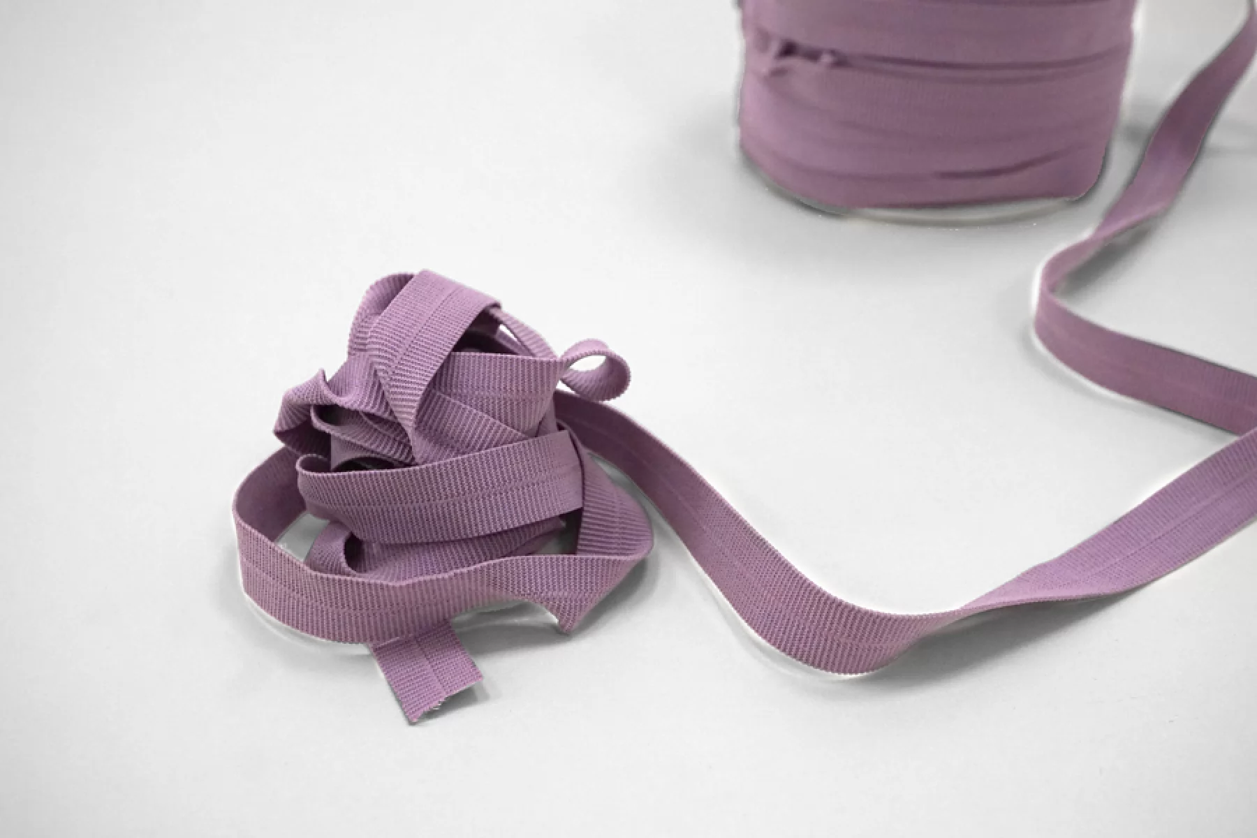 Окантовочная резинка репсового плетения эластичная мягкая, в центре расположен сгиб по всей длине, в лиловом цвете. Подойдет для декоративной обработки края и открытых срезов тканей.