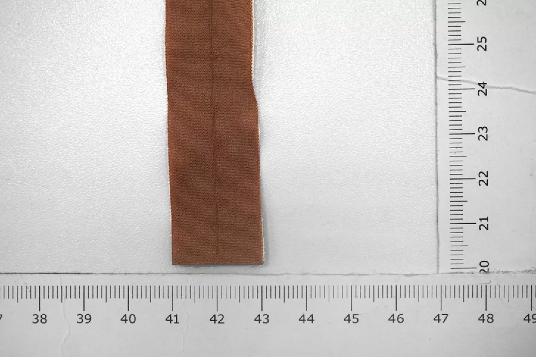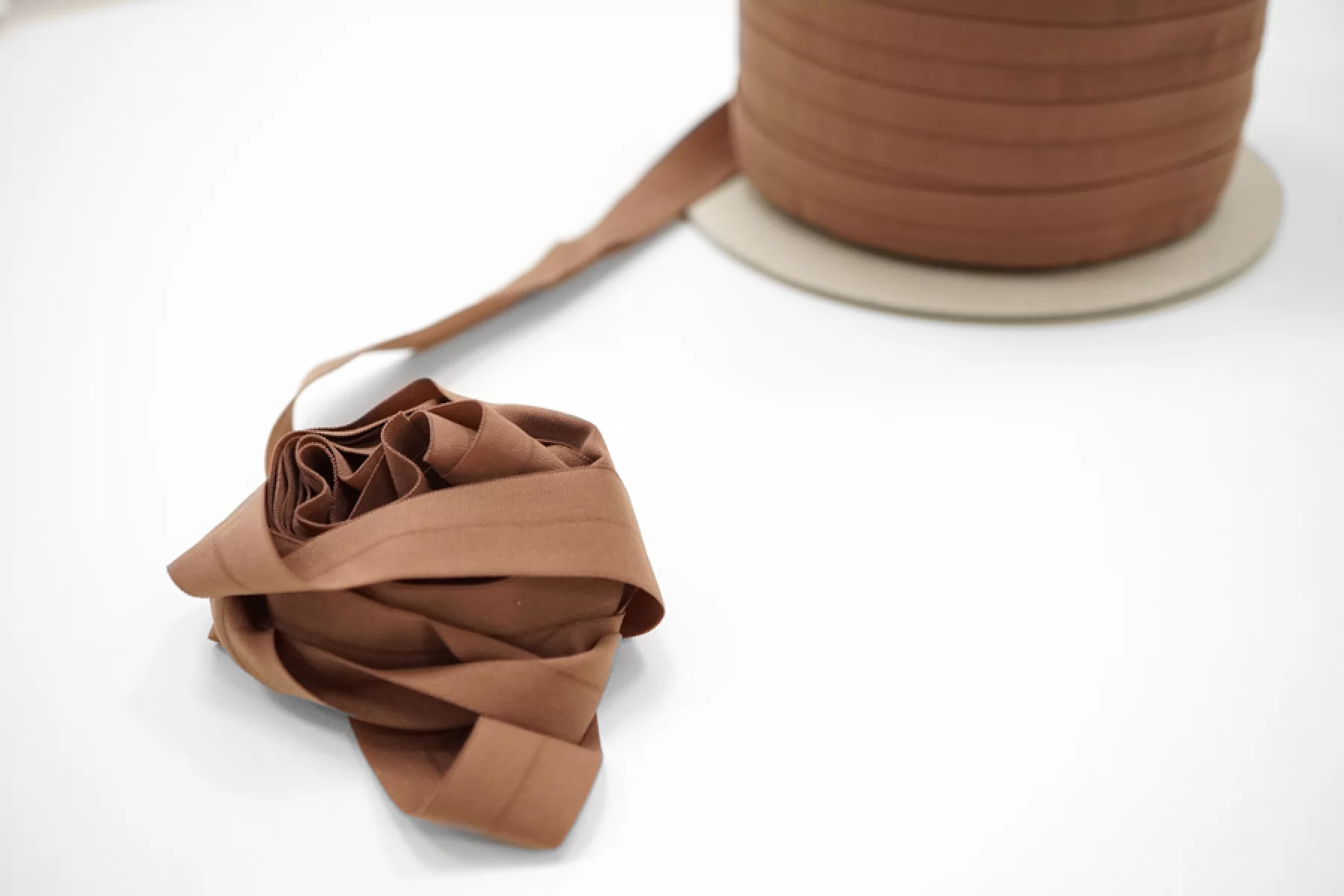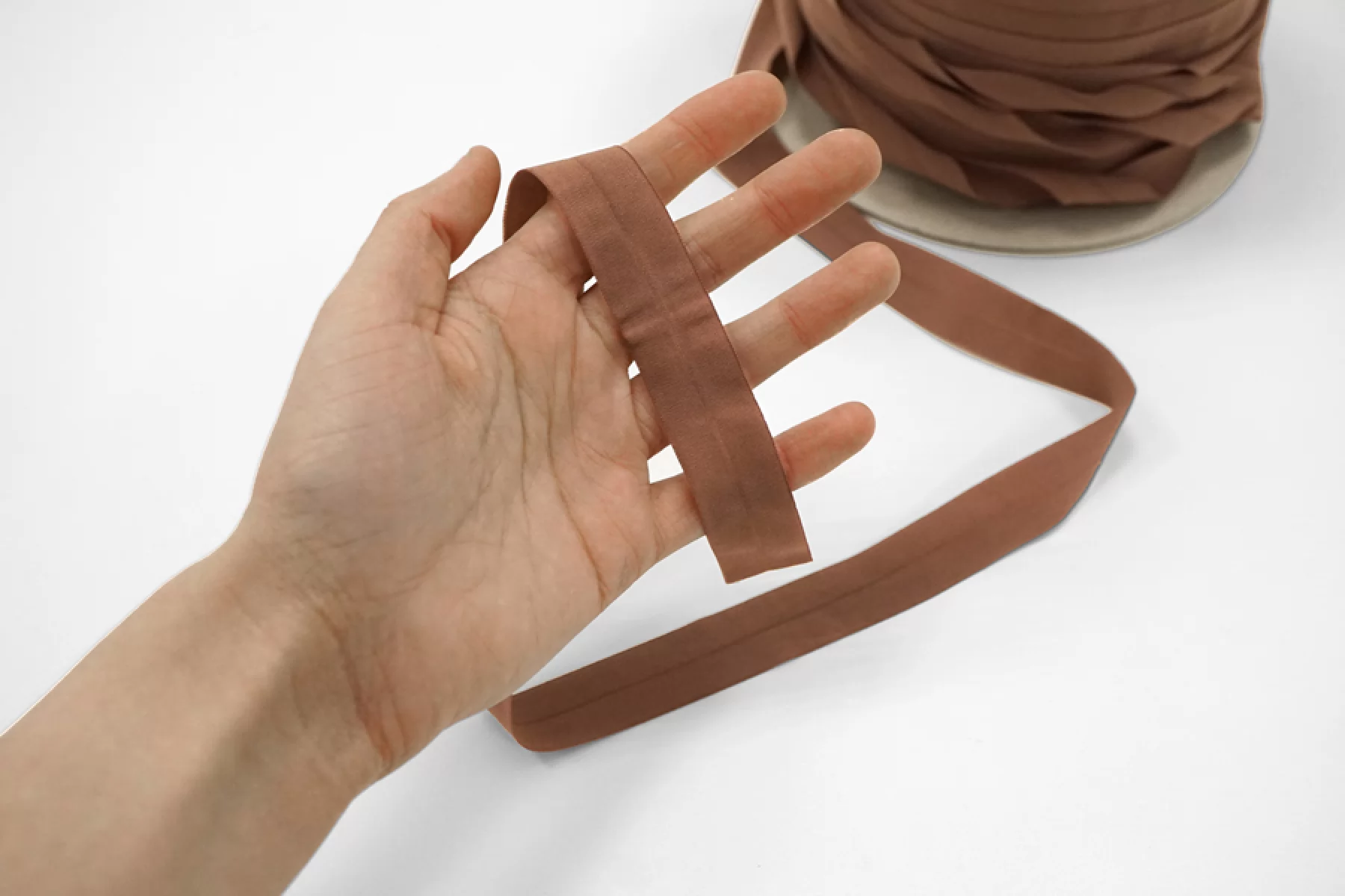 Окантовочная резинка эластичная мягкая, в центре расположен сгиб по всей длине, в коричневом цвете. Подойдет для декоративной обработки края и открытых срезов тканей.