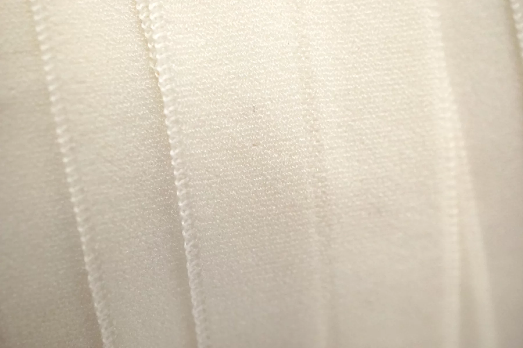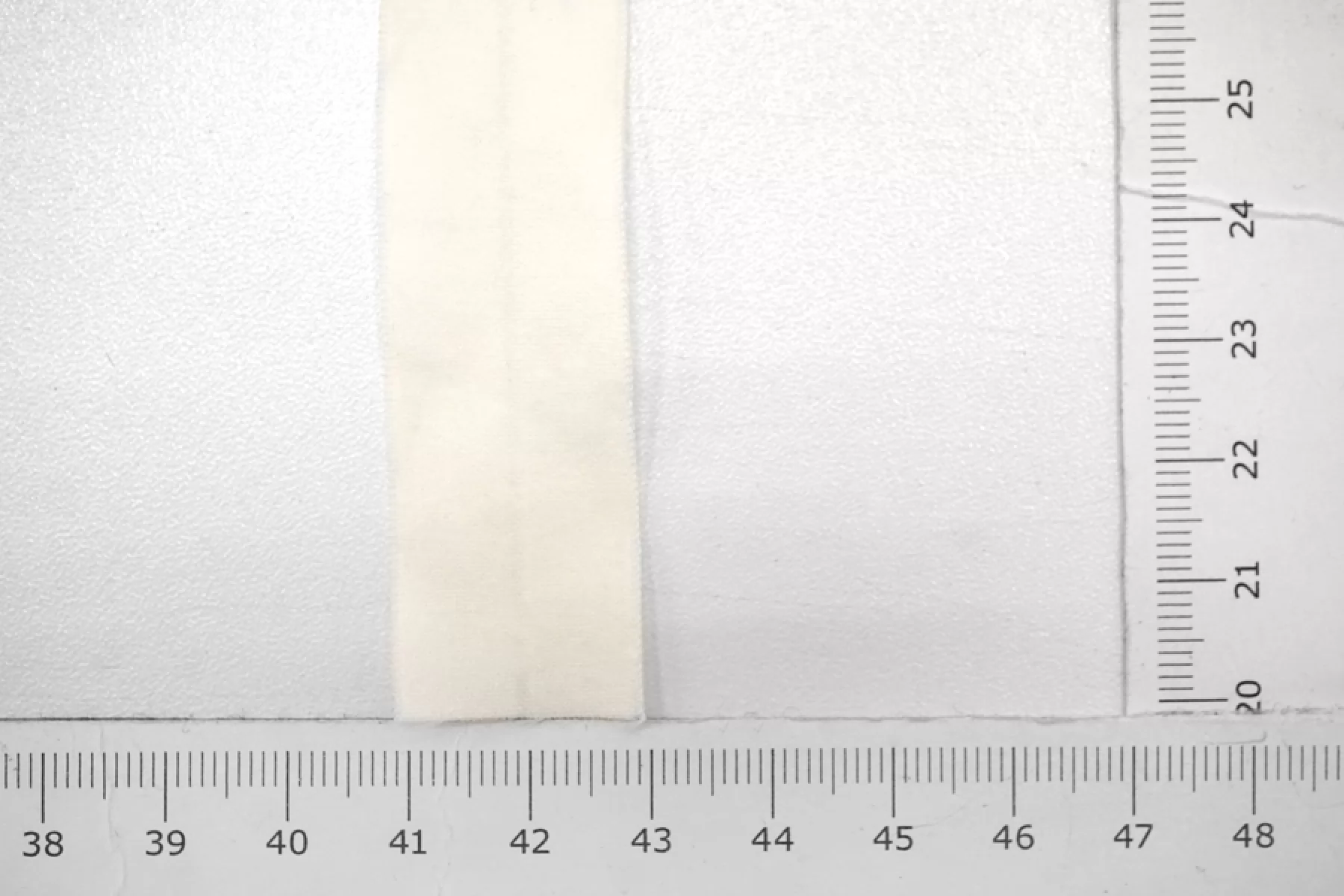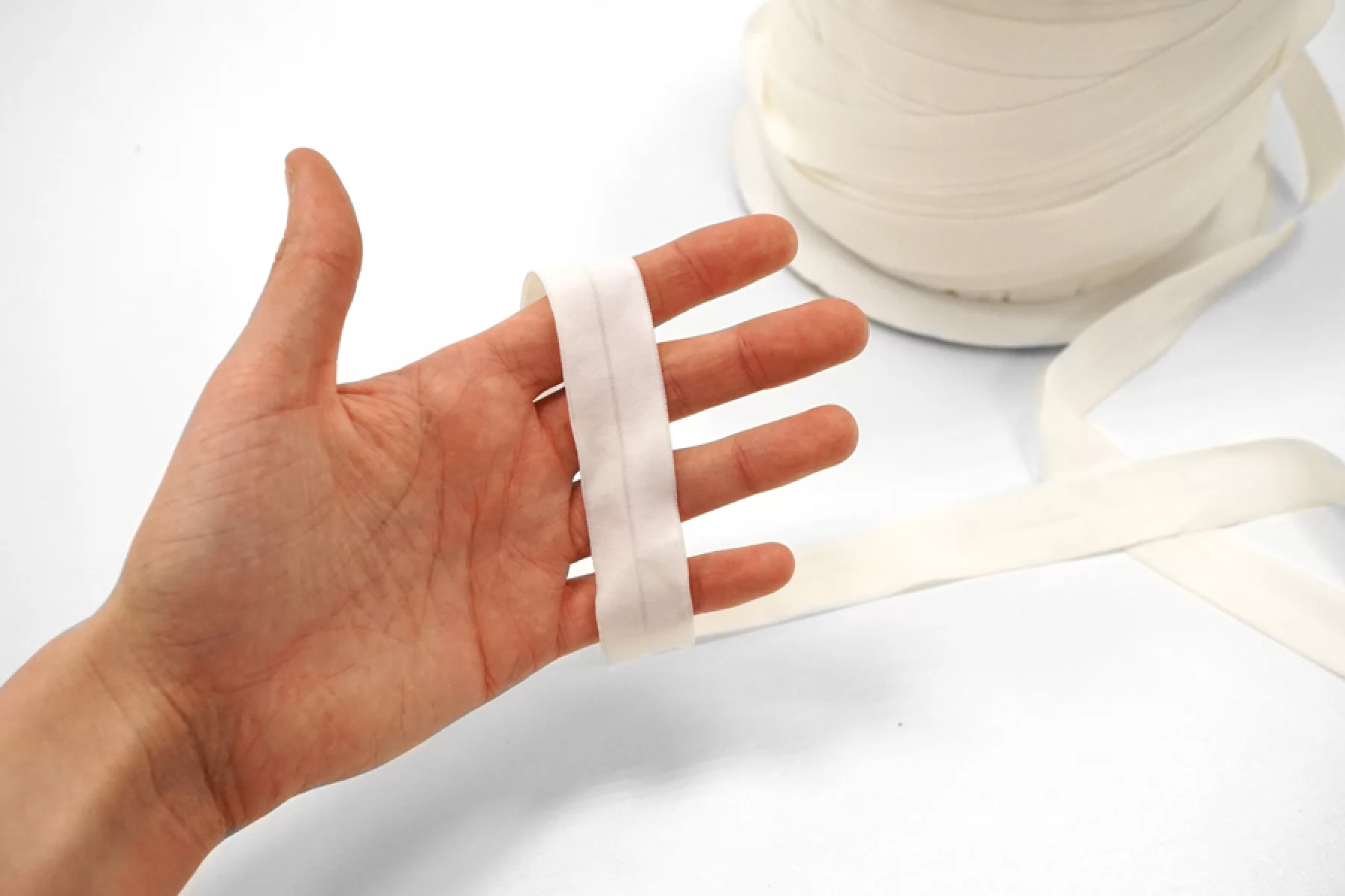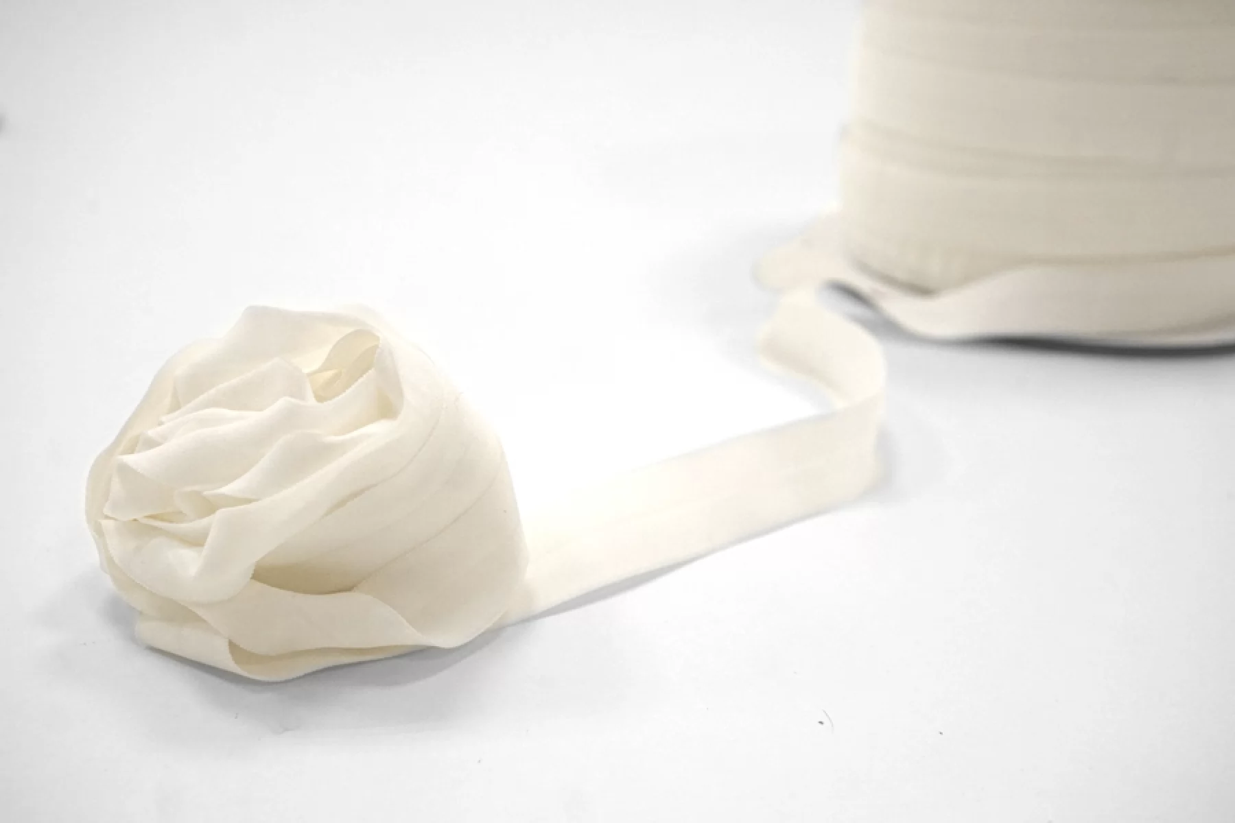 Окантовочная резинка эластичная мягкая, в центре расположен сгиб по всей длине, в молочном цвете. Подойдет для декоративной обработки края и открытых срезов тканей.