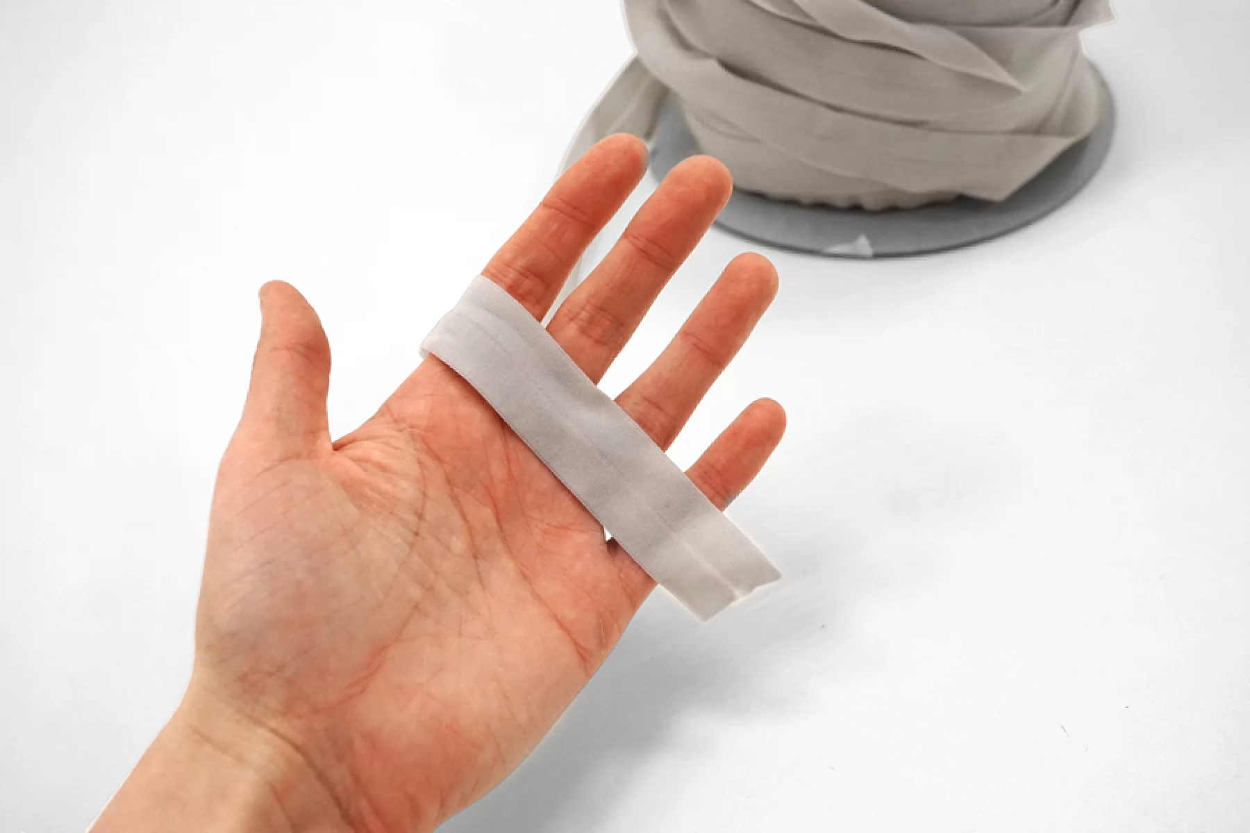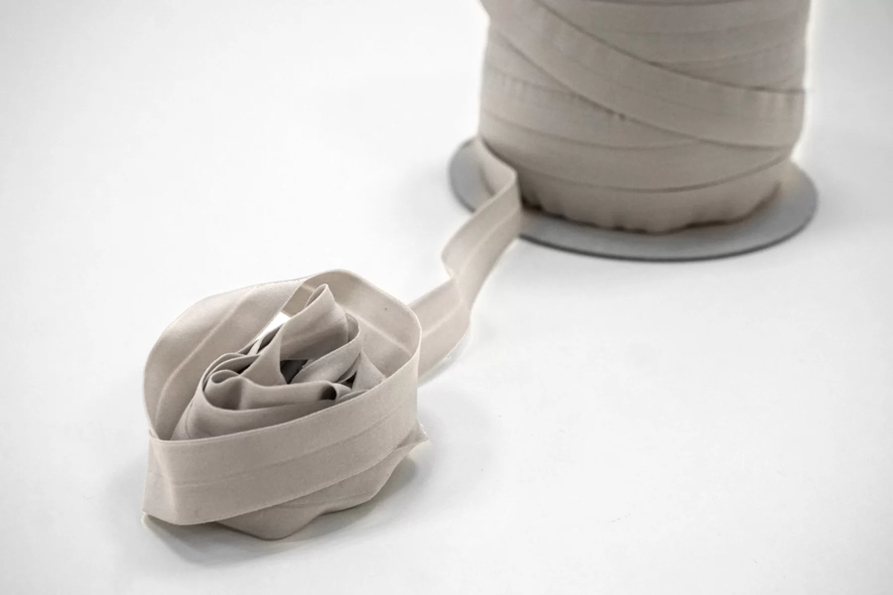 Окантовочная резинка эластичная мягкая, в центре расположен сгиб по всей длине, в сером цвете. Подойдет для декоративной обработки края и открытых срезов тканей.