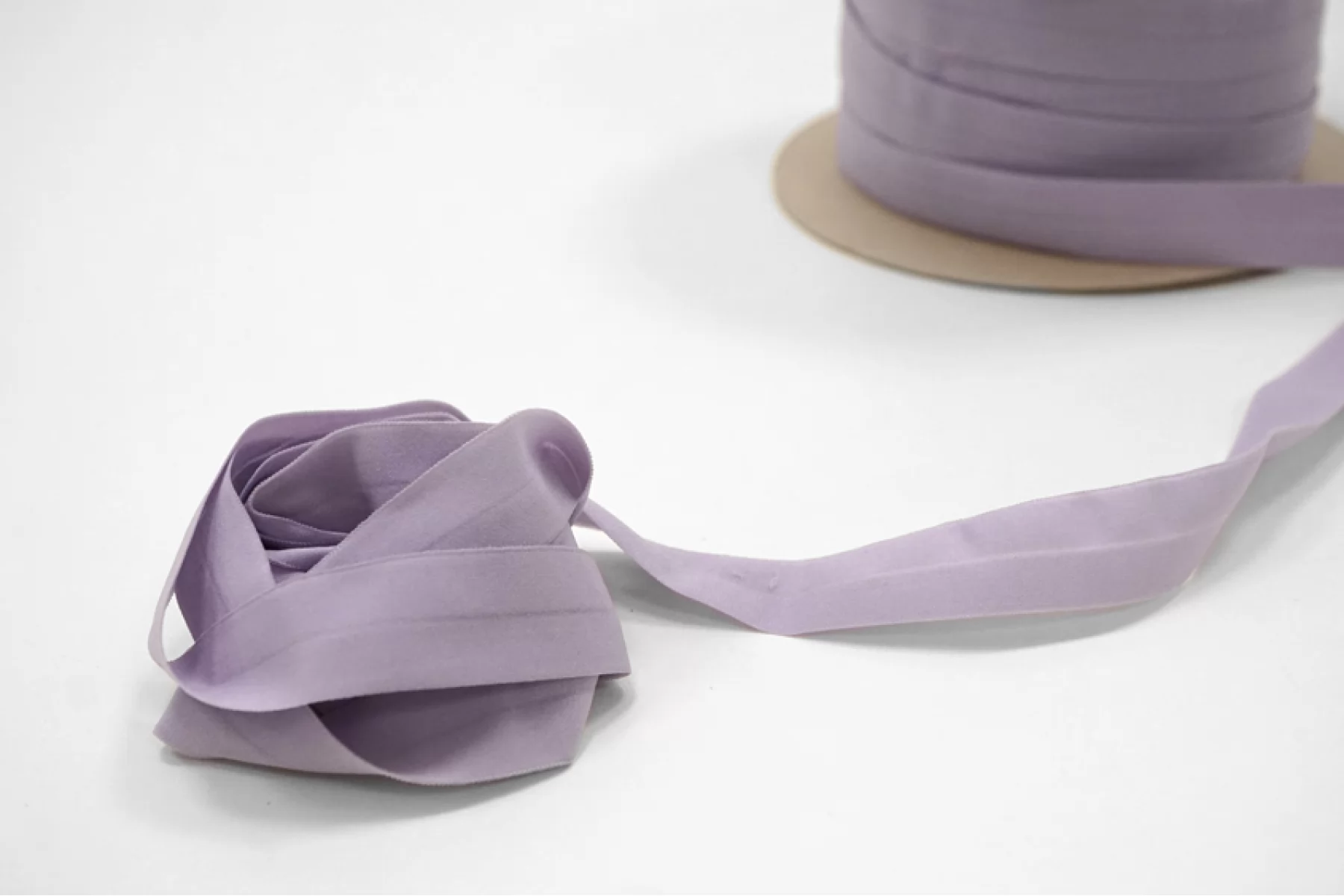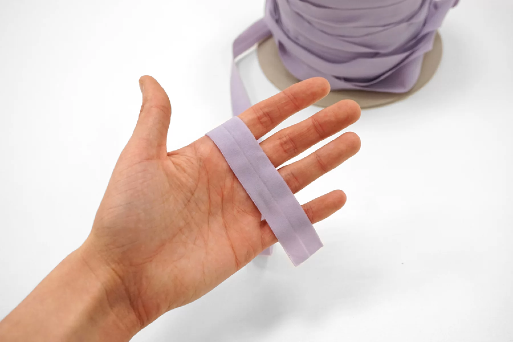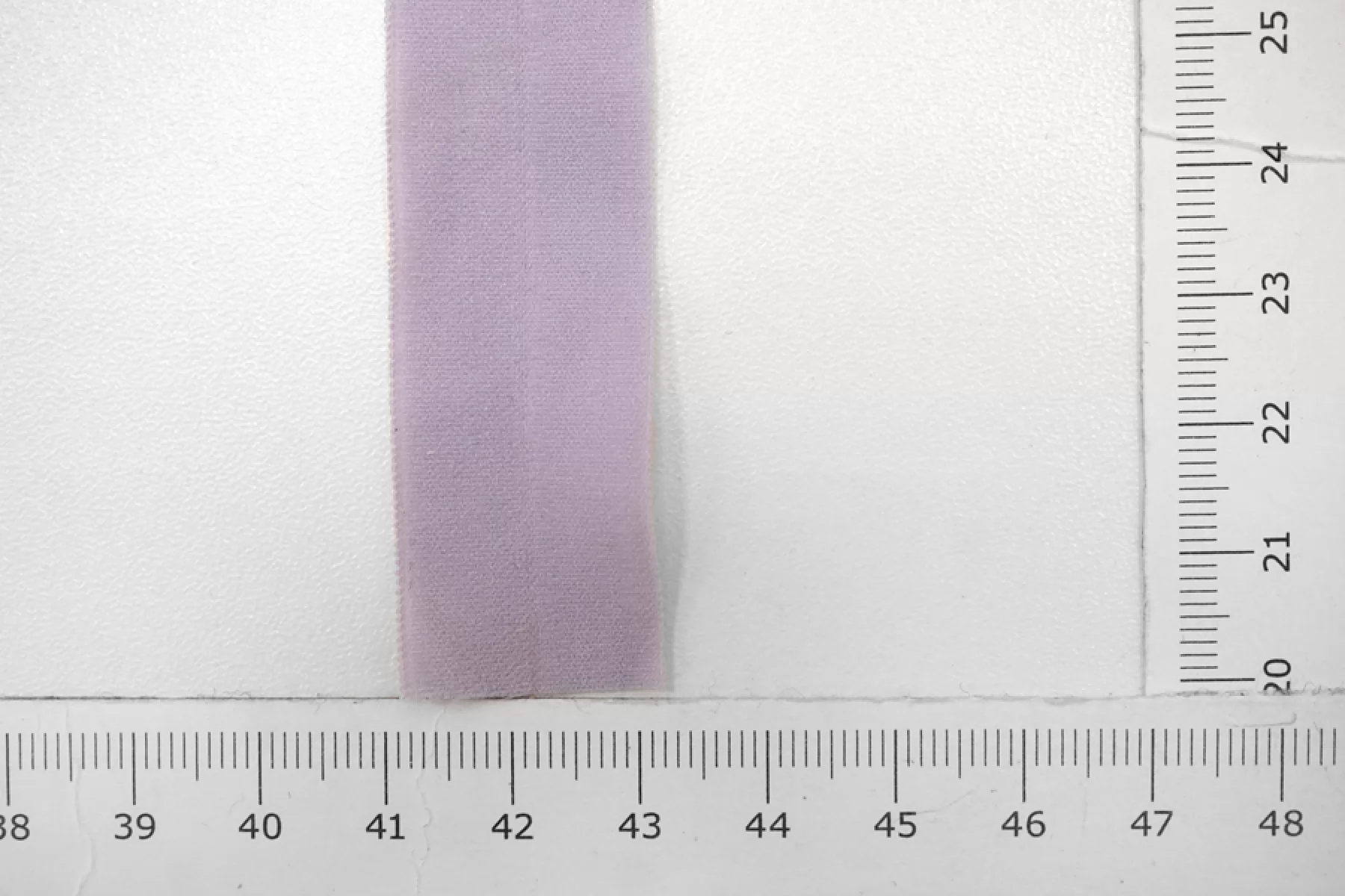 Окантовочная резинка эластичная мягкая, в центре расположен сгиб по всей длине, в сиреневом цвете. Подойдет для декоративной обработки края и открытых срезов тканей.
