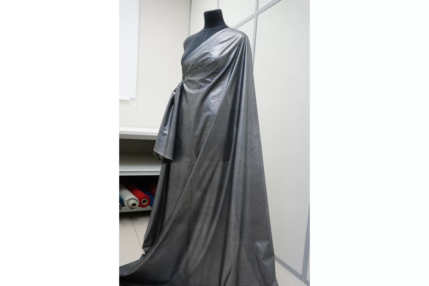 Шикарная шелковая органза чёрного цвета, с серебристым накатом. Тонкая, обладает умеренной жесткостью органзы. Гладкая и приятная. Держит форму и округлые воздушные складки. Полупрозрачная но благодаря блеску это не сильно заметно. Мнется и не тянется. Отличный вариант на нарядное платье, блузку и юбку. При необходимости используйте подкладочный материал. Уход, как и за любым шелком, деликатный.