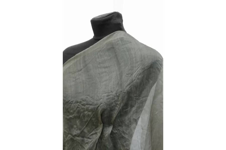 Внимание! Полосит, а так же присутствуют замятости и заломы см. фото. Прекрасная шелковая органза серо-зеленого оттенка хаки. Тонкая, легкая и летящая, обладает несильной жесткостью органзы и легким лоском. Гладкая и приятная. Прекрасно держит форму и округлые воздушные складки. Прозрачная. Мнется и не тянется. Отличный вариант на нарядные и повседневные платье, блузку и юбку. При необходимости используйте подкладочный материал. Уход, как и за любым шелком, деликатный.