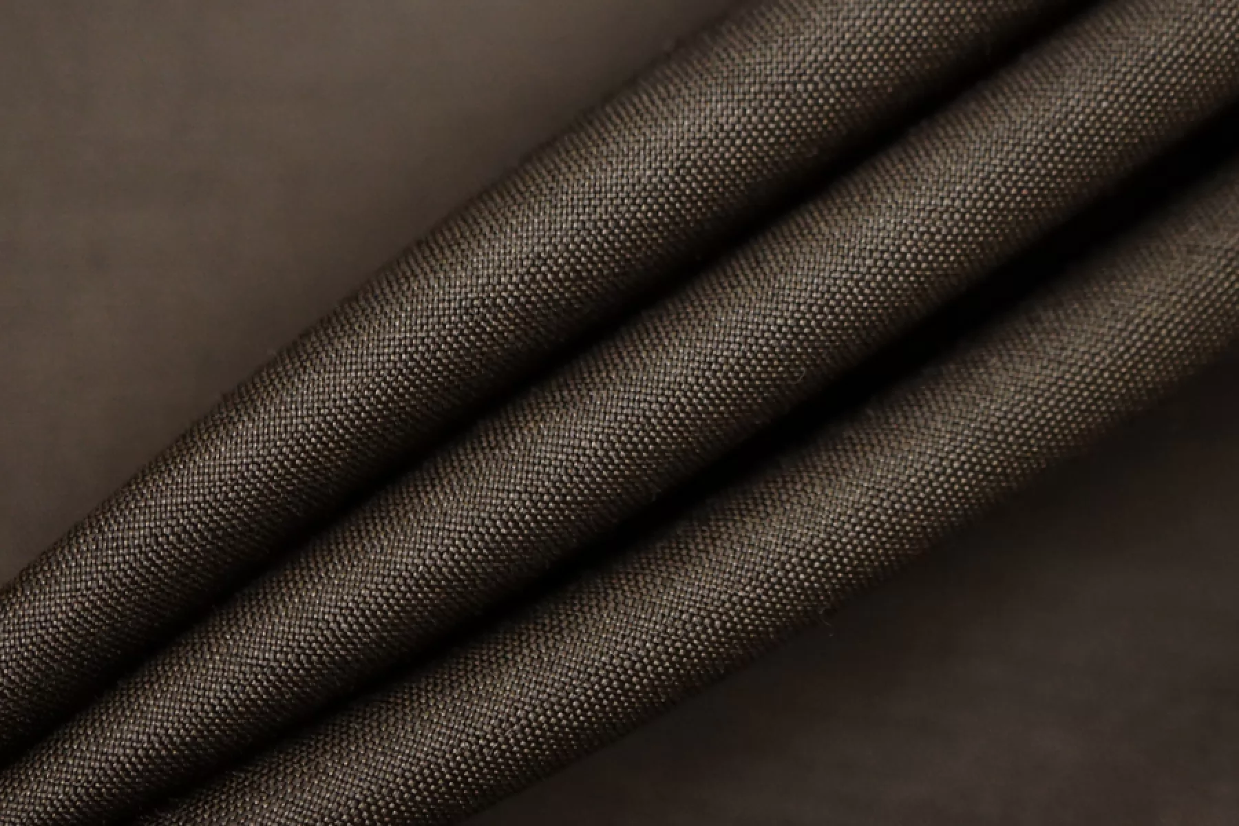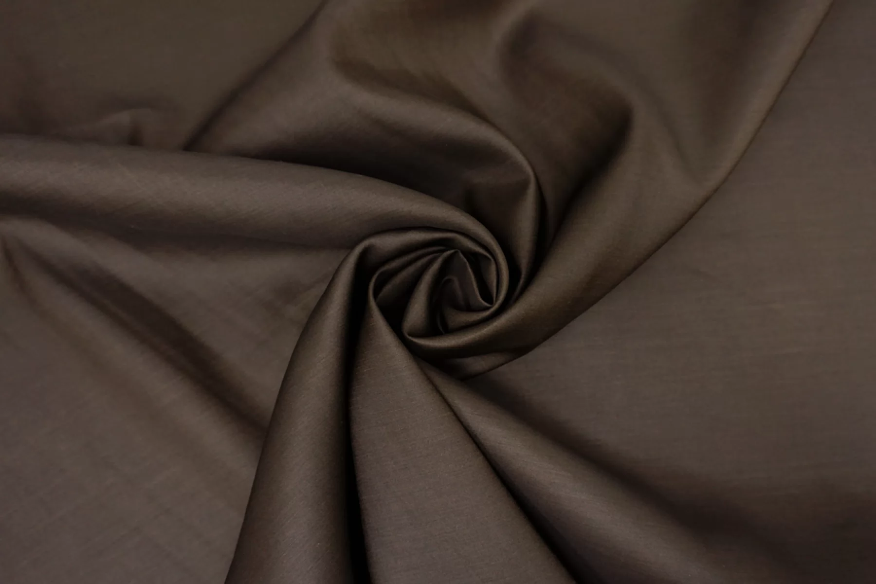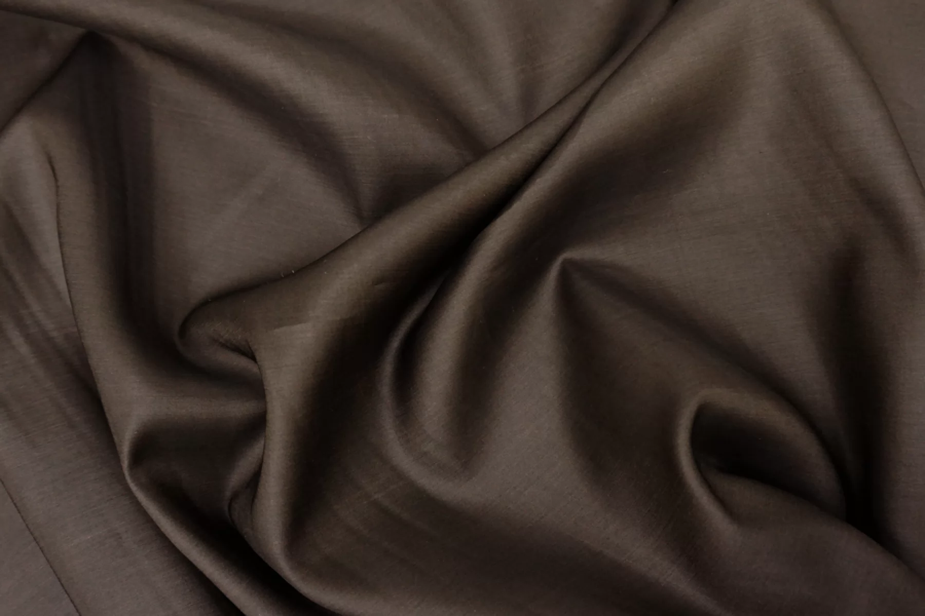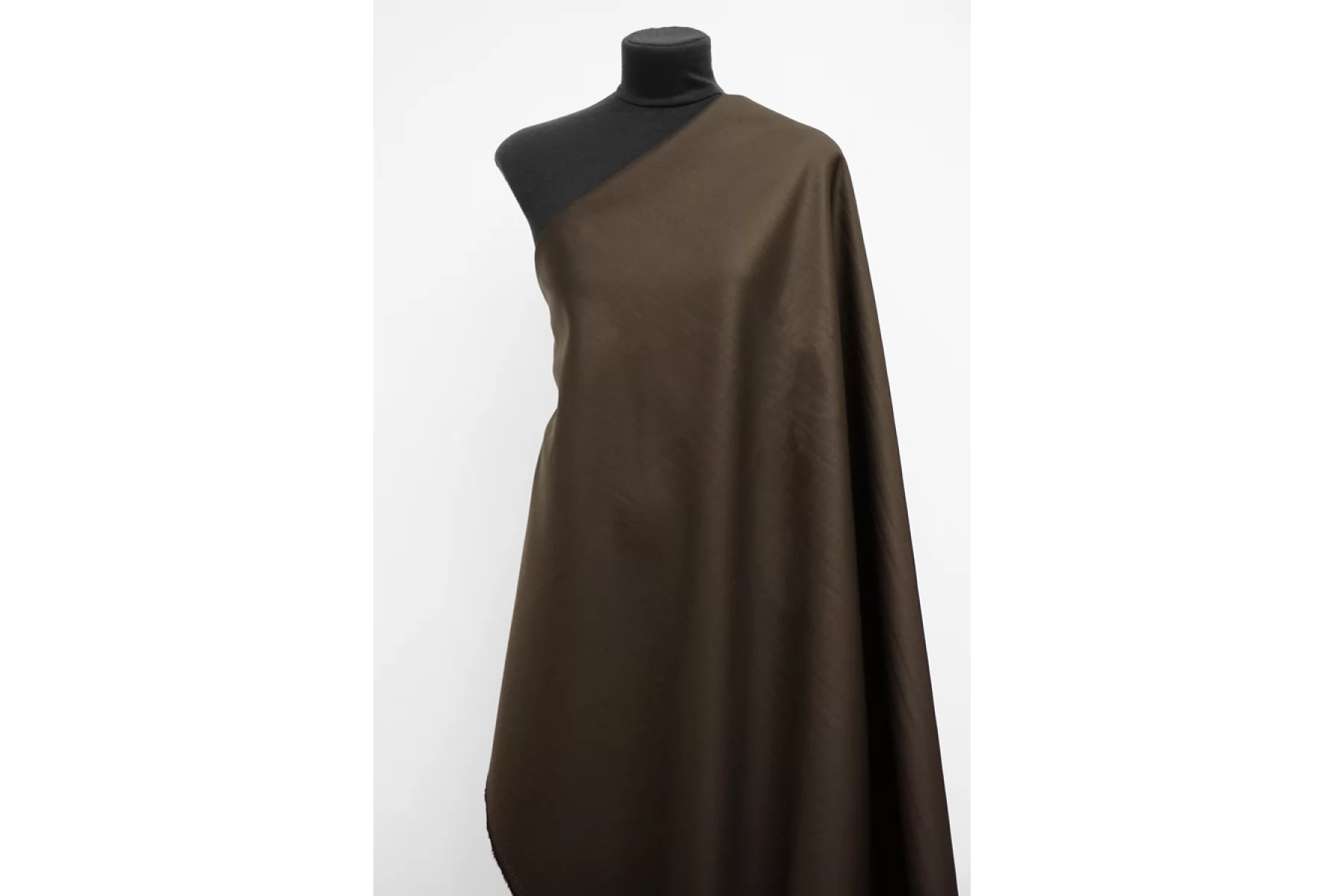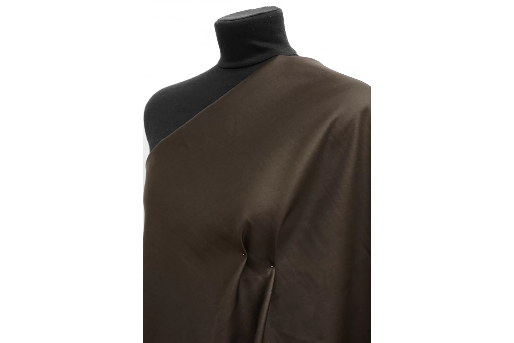 Необычная и шикарная позиция - шерсятная органза с шелком от бренда MAX MARA в коричневом цвете с зеленоватым подтоном. Тактильно плотная и толстенькая. Отлично держит форму и округлые складки. Гладкая с легкой шероховатостью. Не просвечивает. Сминается, не тянется. Вариант платье, рубашку, жакет и юбку. При необходимости используйте подкладочный материал. Уход деликатный.