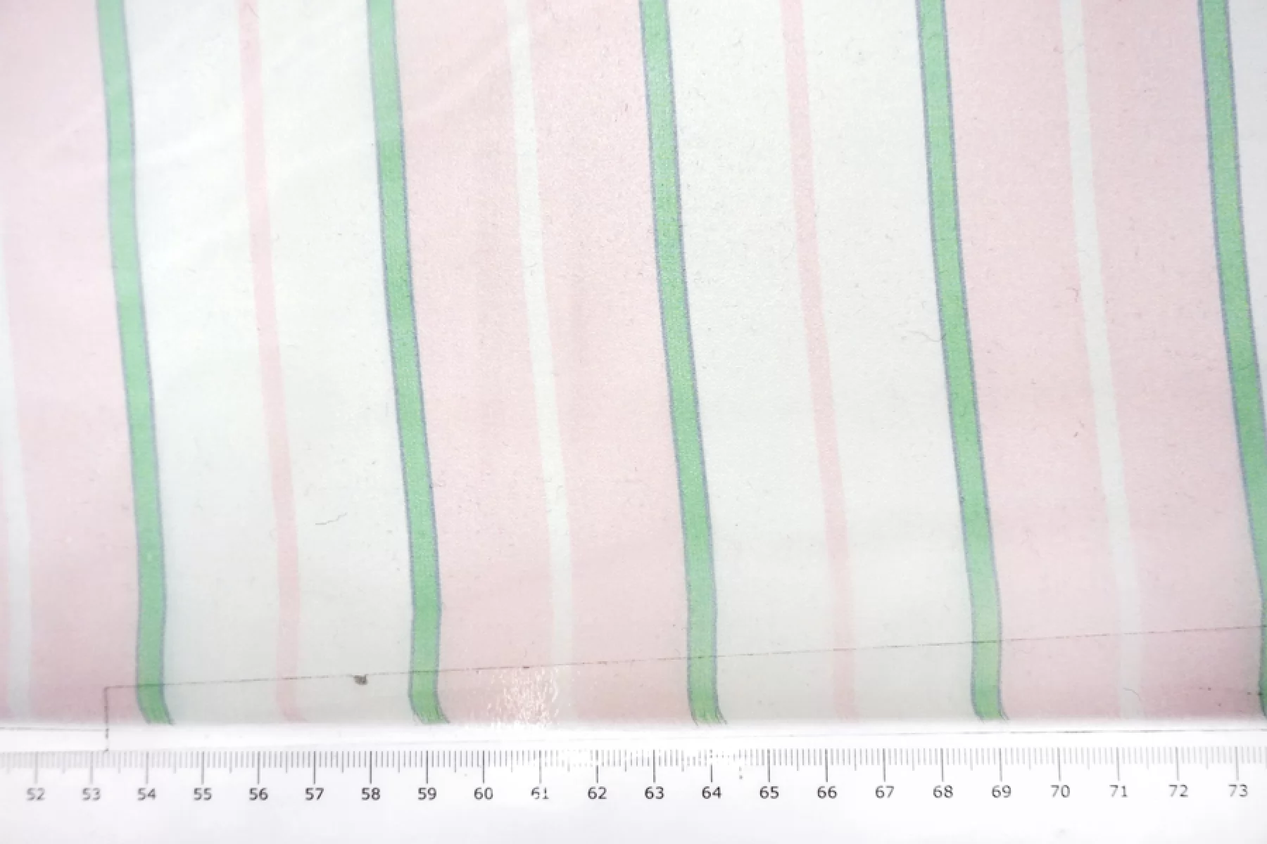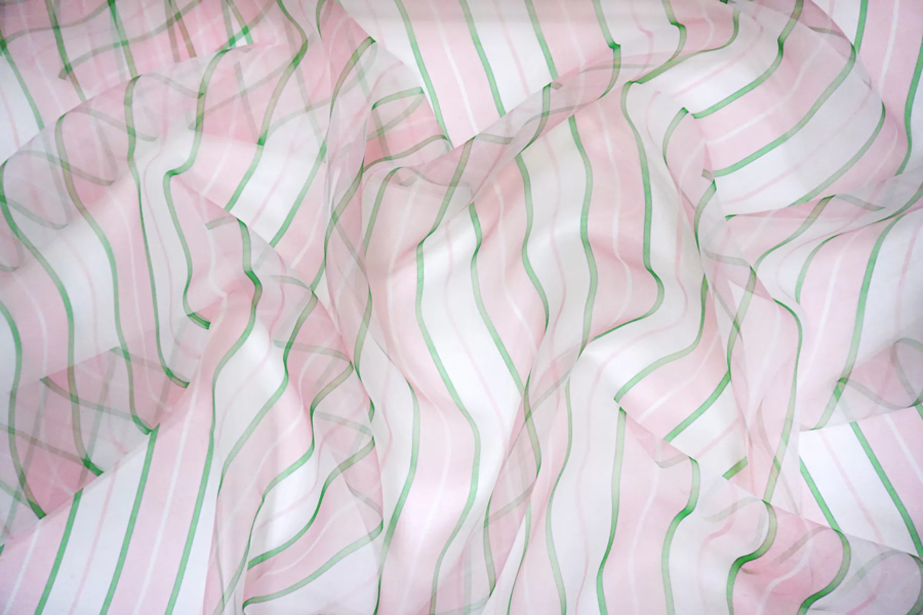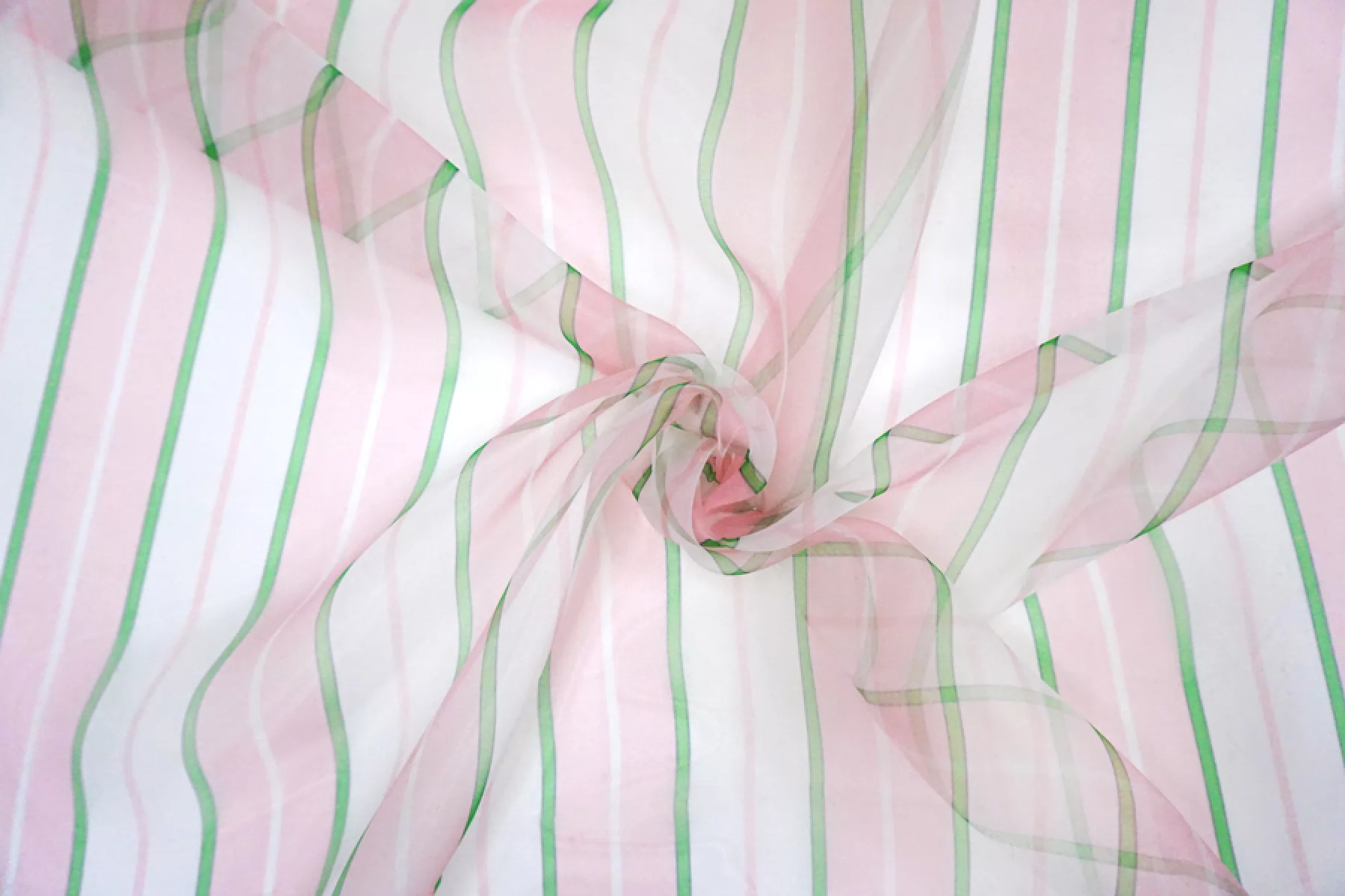Органза из полиэстера в полоску нежно-розового цвета с зеленым акцентом. Упругая, легкая, тонкая. Просвечивает. Подойдет на блузку, платье, тунику, юбку. Также подойдет для декорирования одежды и аксессуаров.