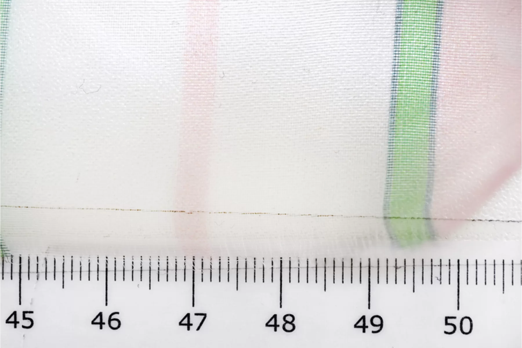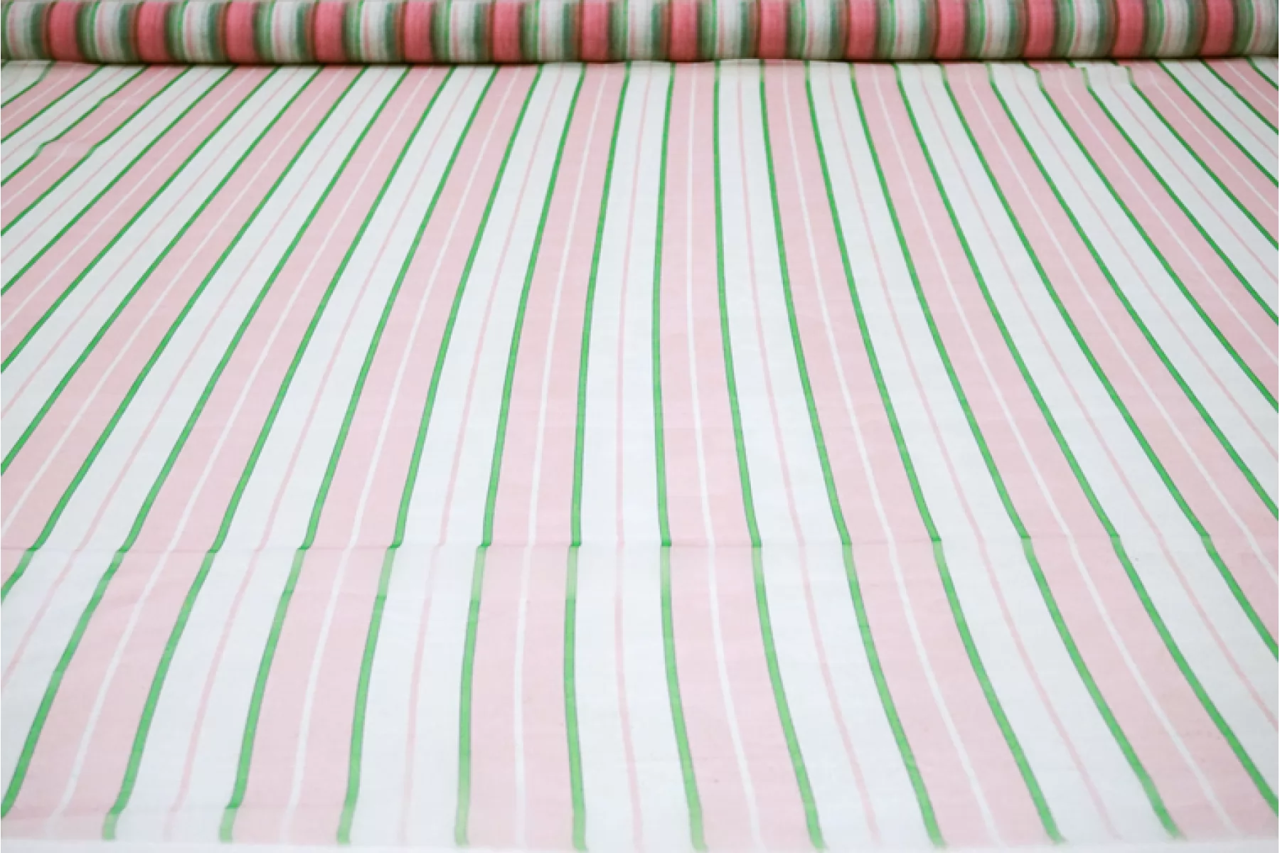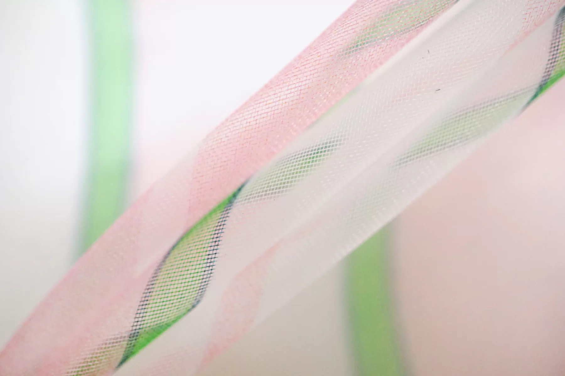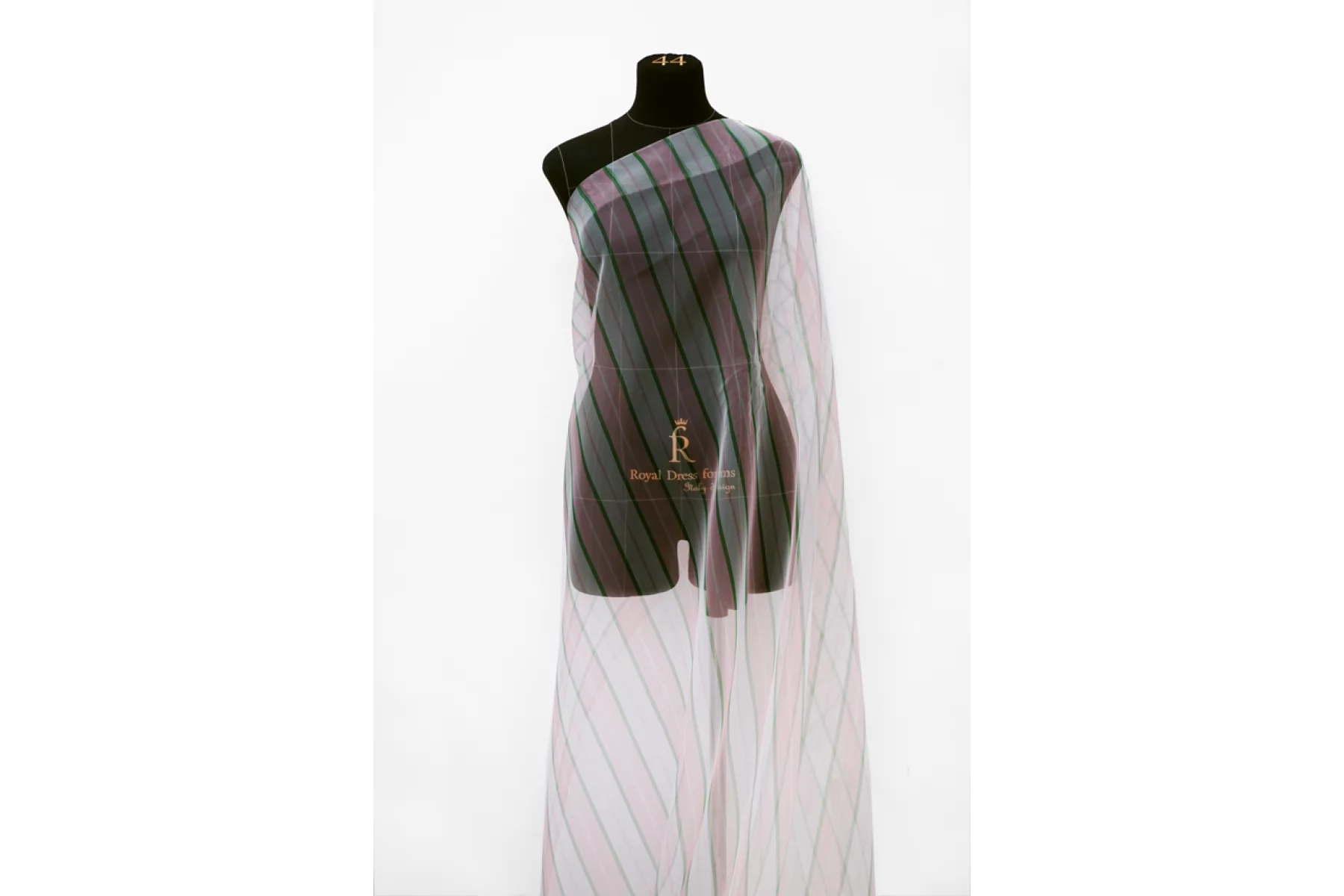 Органза из полиэстера в полоску нежно-розового цвета с зеленым акцентом. Упругая, легкая, тонкая. Просвечивает. Подойдет на блузку, платье, тунику, юбку. Также подойдет для декорирования одежды и аксессуаров.