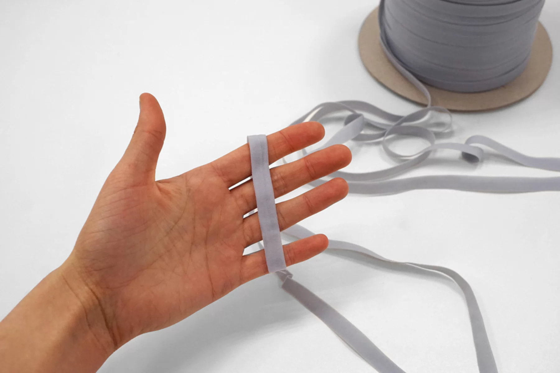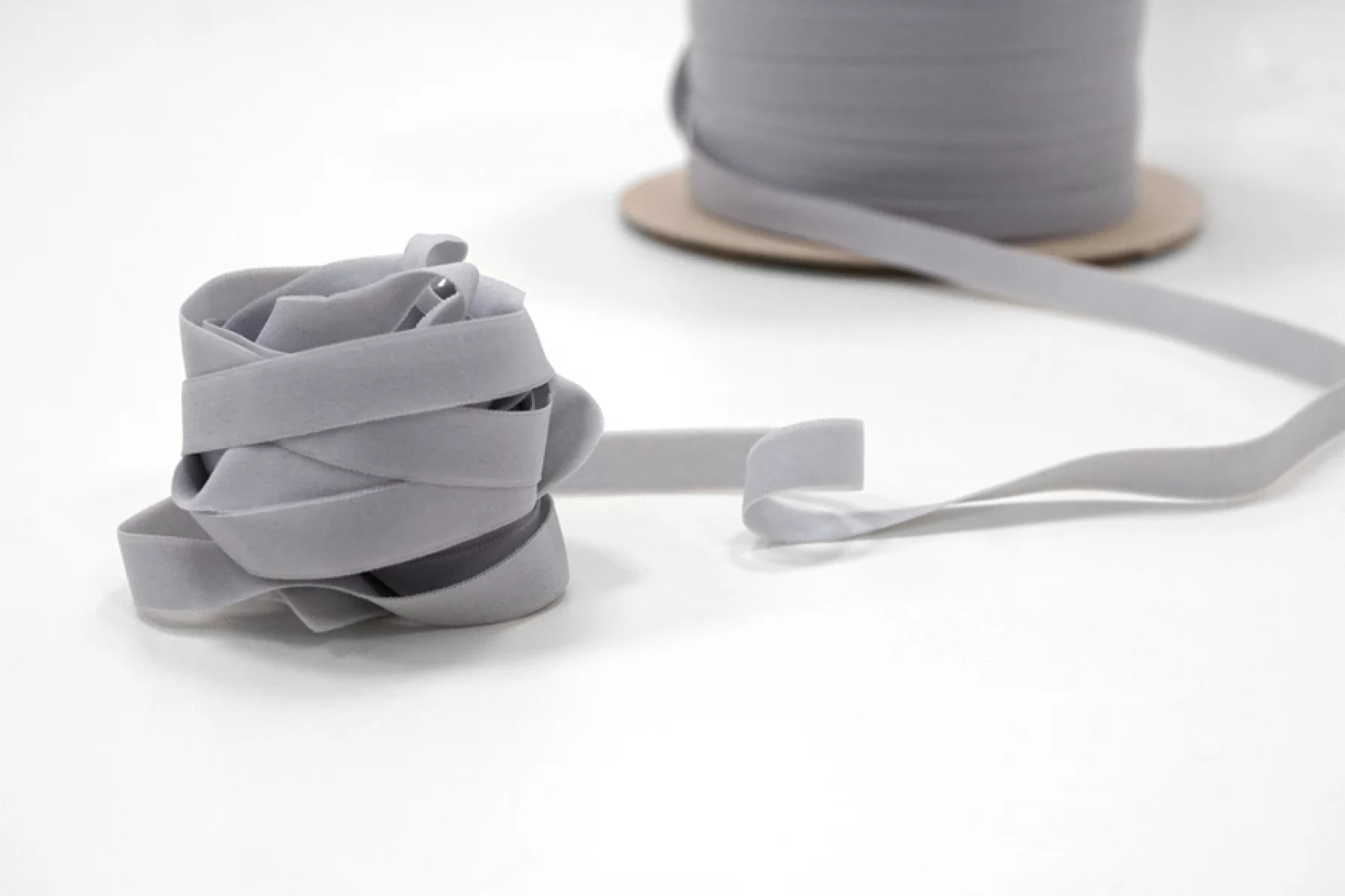 Отделочная эластичная резинка, мягкая, в серо-голубом цвете. Подойдет для декоративной обработки края и открытых срезов тканей.