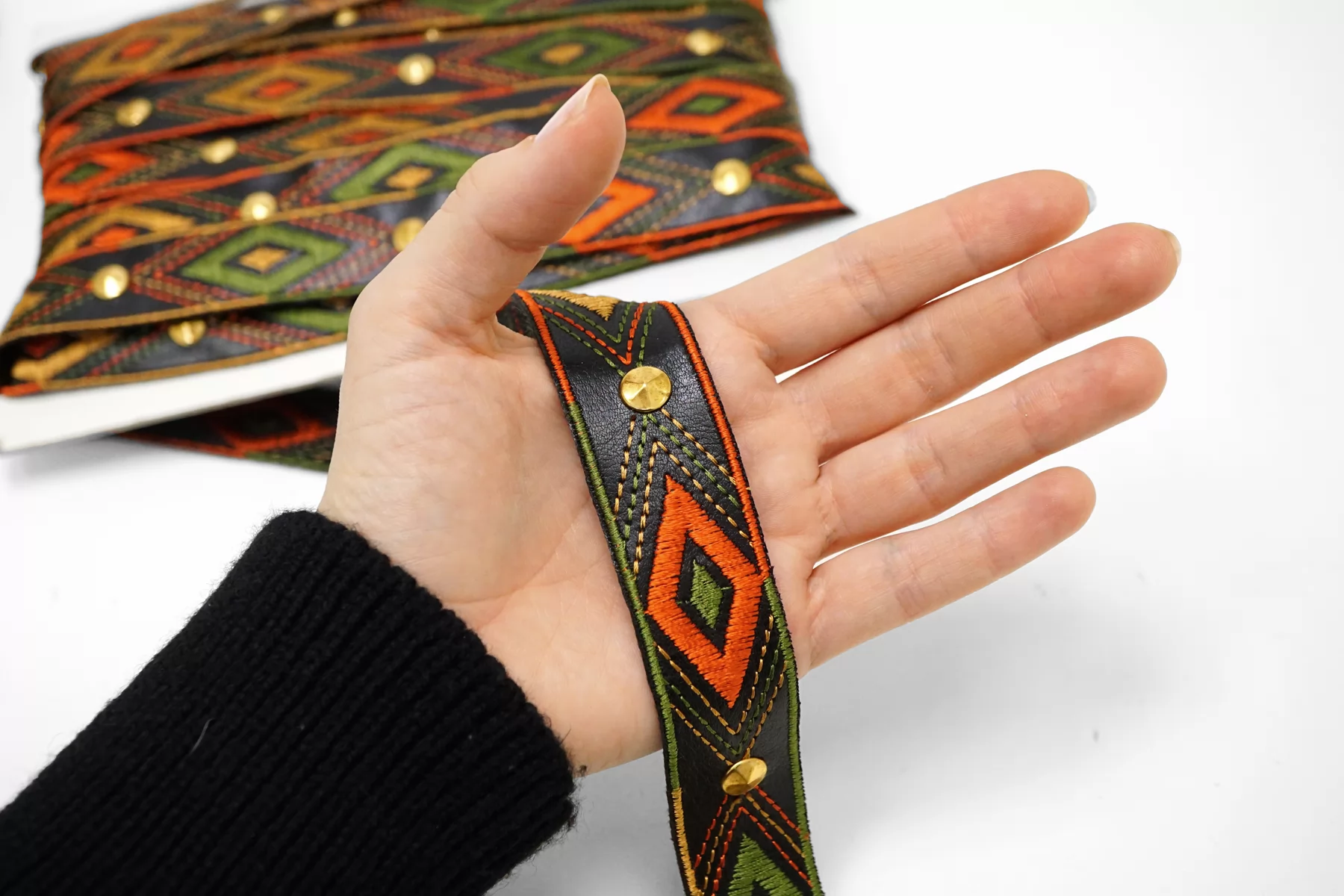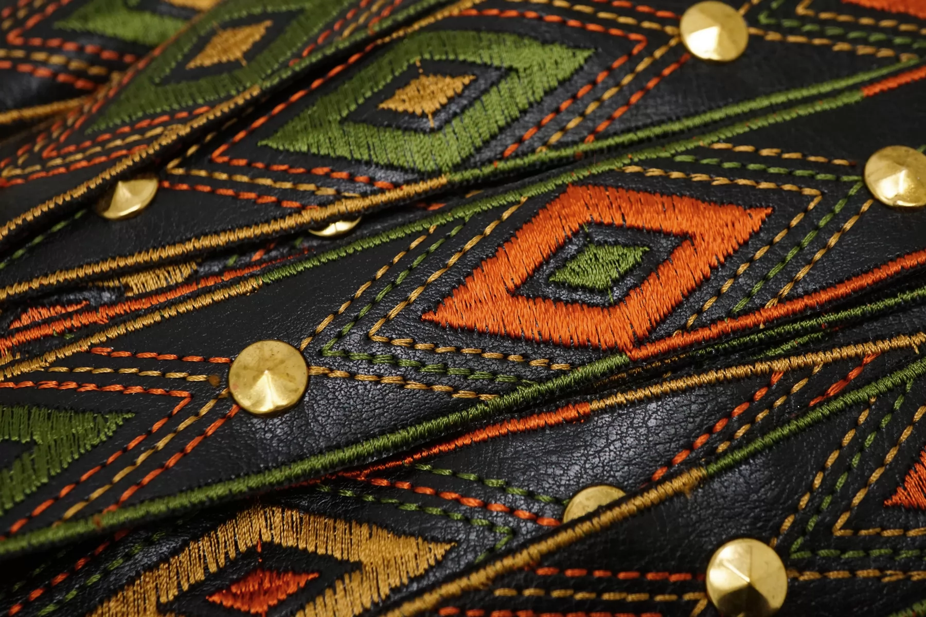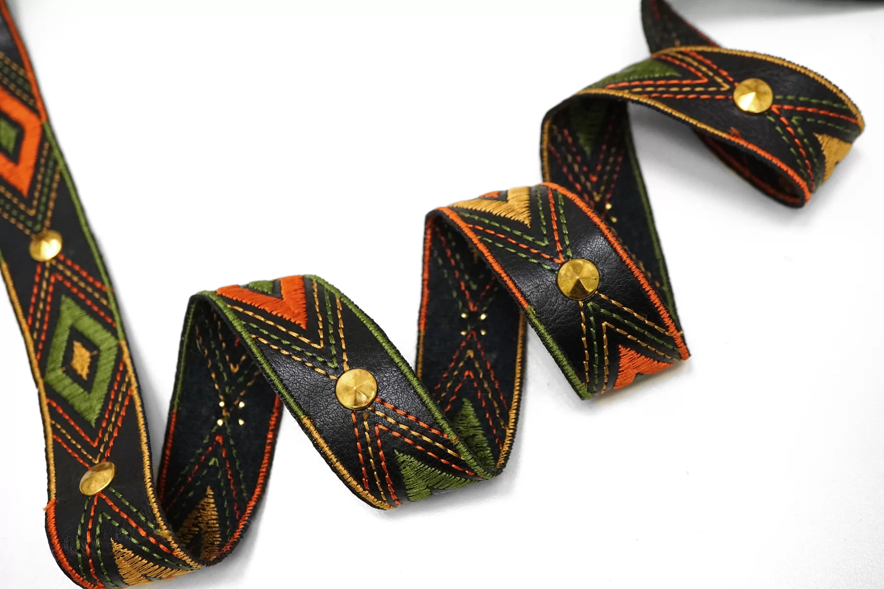 Итальянская декоративная лента черного цвета из экокожи с вышивкой и металлическими элементами. Умеренной мягкости. Не тянется. Отлично подойдет для отделки одежды и аксессуаров.