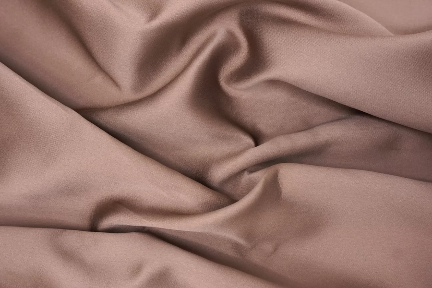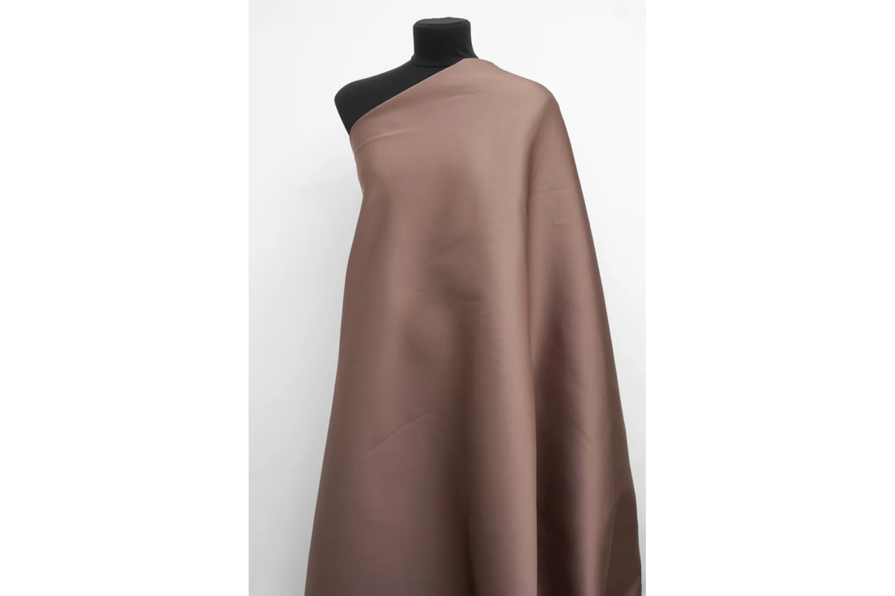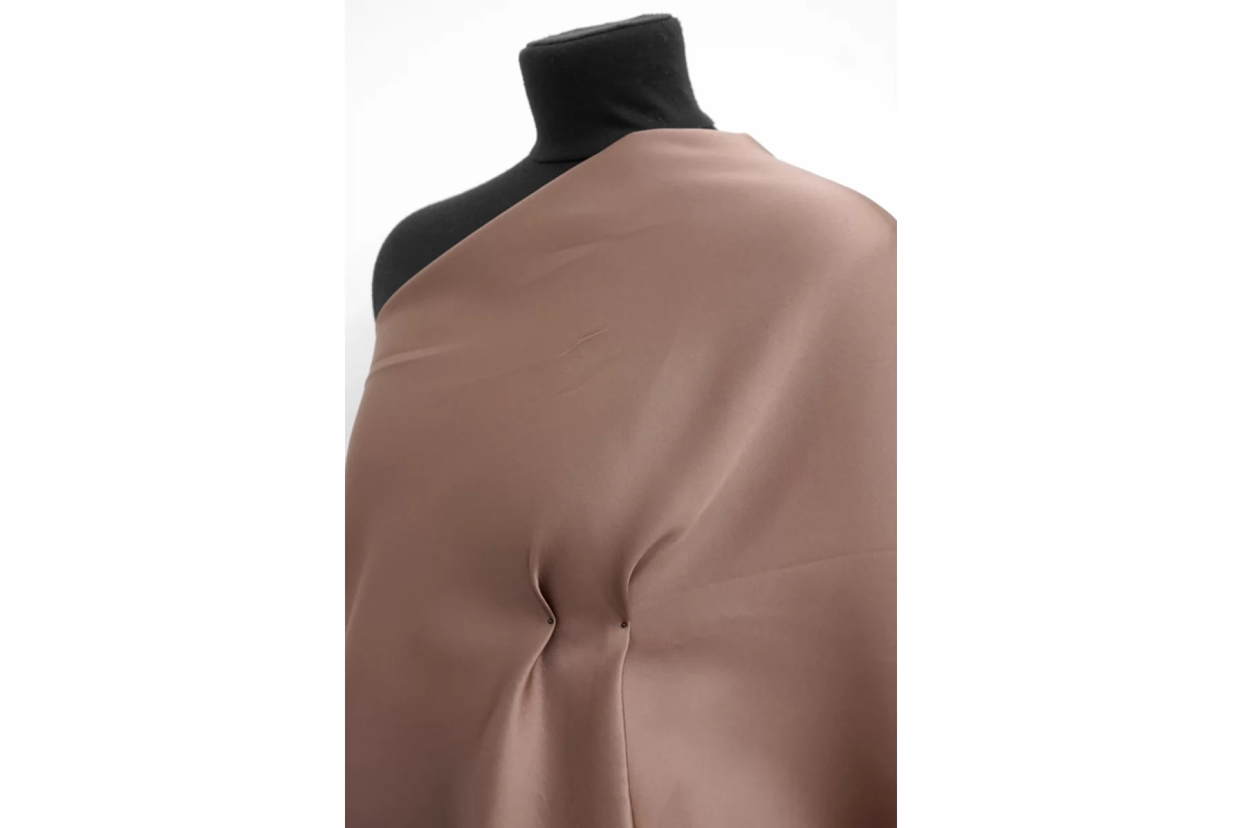 На отрезе грязь и черное пятно! Очень классный костюмный атлас шелк с ацетатом в приятном оттенке какао с молоком. На ощупь материал приятный, с красивым лоском, гладкий. В основе - плотные, прочные нити, которые придают материалу формодержание и возможность держать округлую складку. Атлас не тянется, немного мнется. Не просвечивает. Отлично подойдёт на отрезные платья, костюмные варианты, юбки и не только. Уход деликатный.