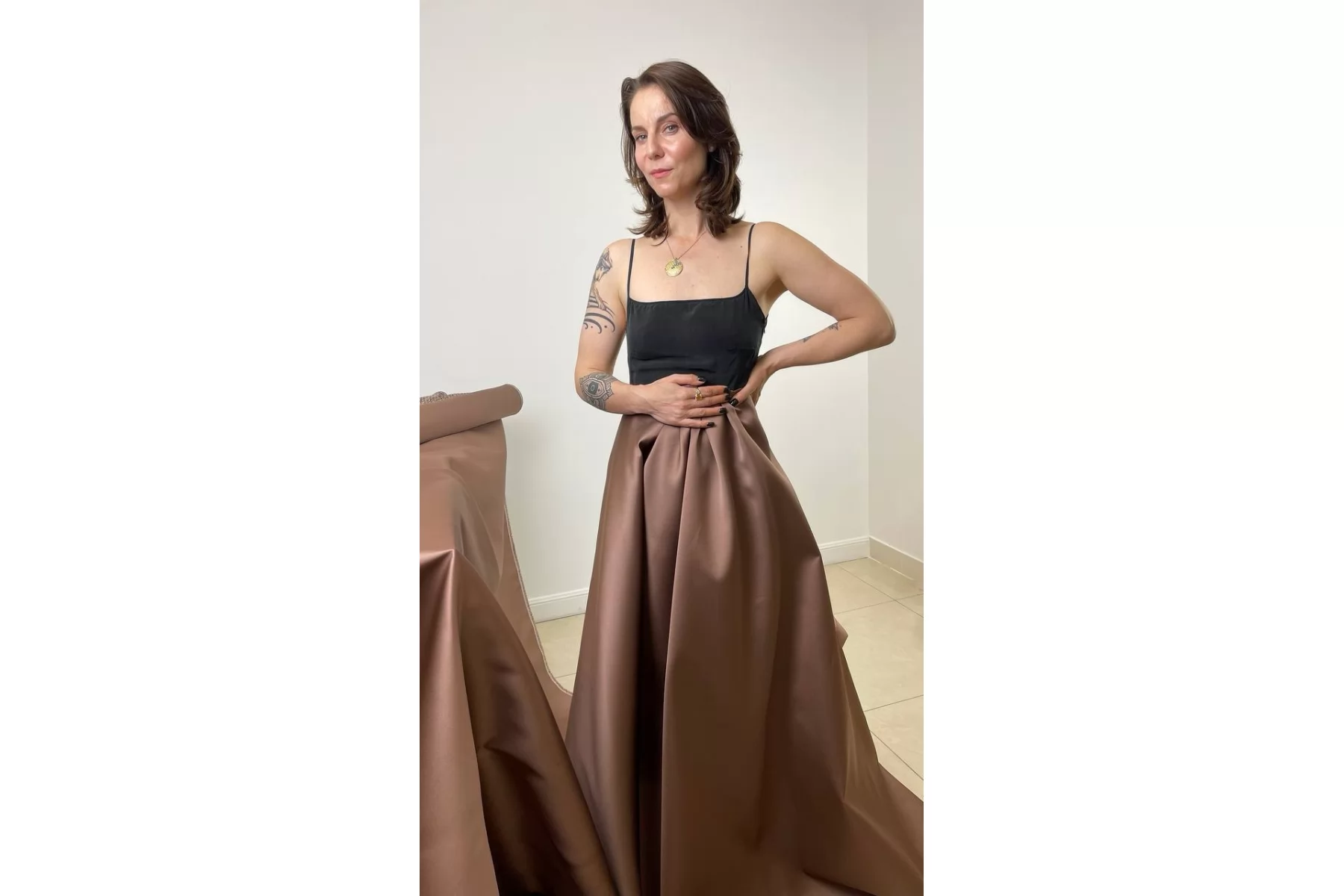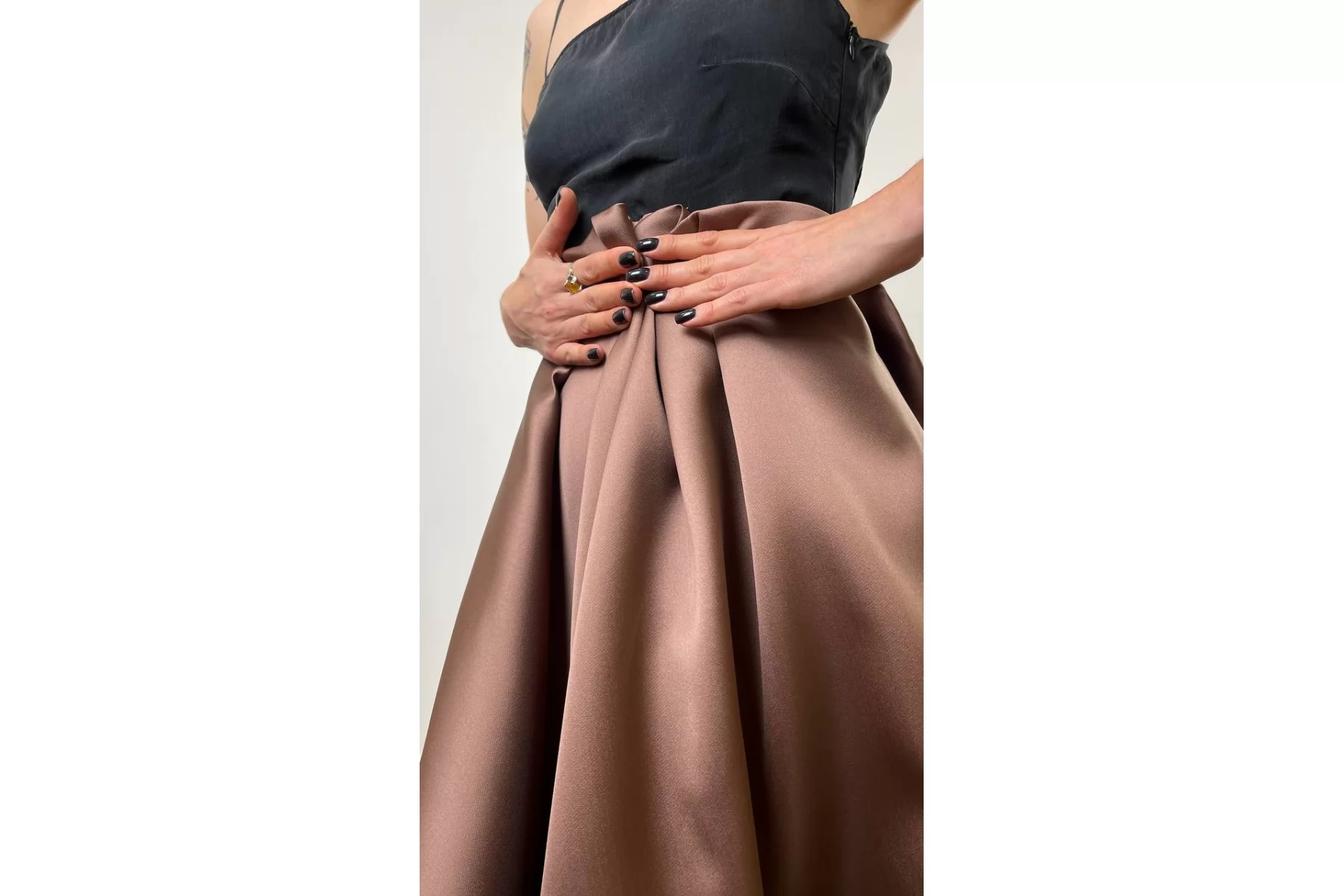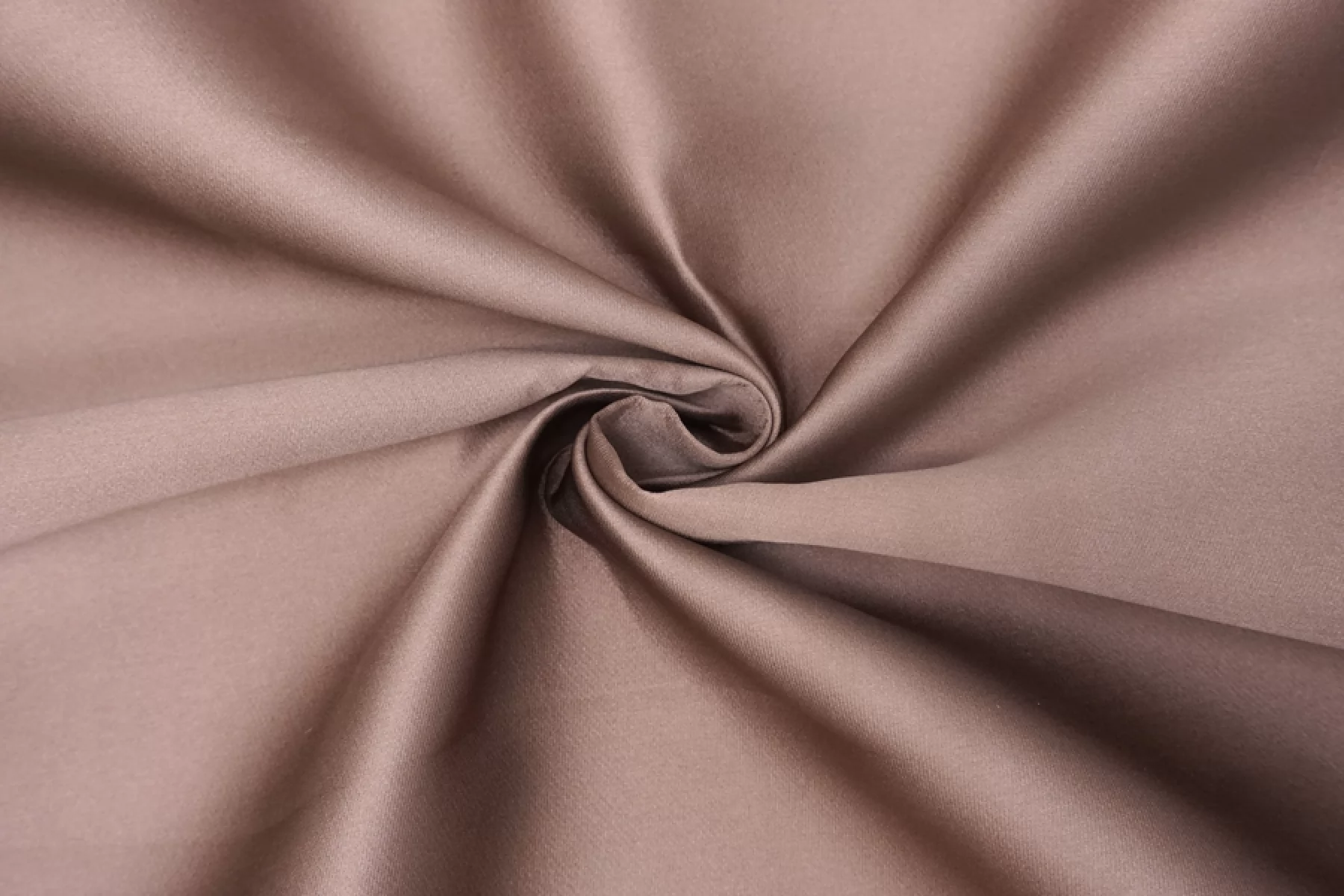 На отрезе грязь и черное пятно! Очень классный костюмный атлас шелк с ацетатом в приятном оттенке какао с молоком. На ощупь материал приятный, с красивым лоском, гладкий. В основе - плотные, прочные нити, которые придают материалу формодержание и возможность держать округлую складку. Атлас не тянется, немного мнется. Не просвечивает. Отлично подойдёт на отрезные платья, костюмные варианты, юбки и не только. Уход деликатный.
