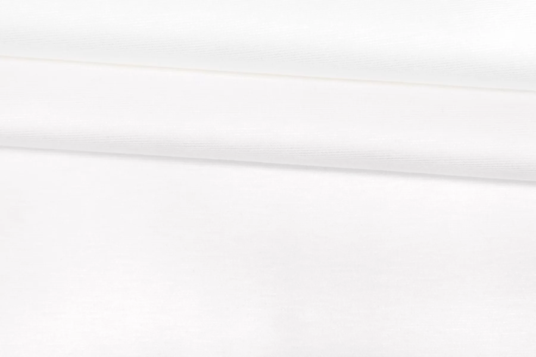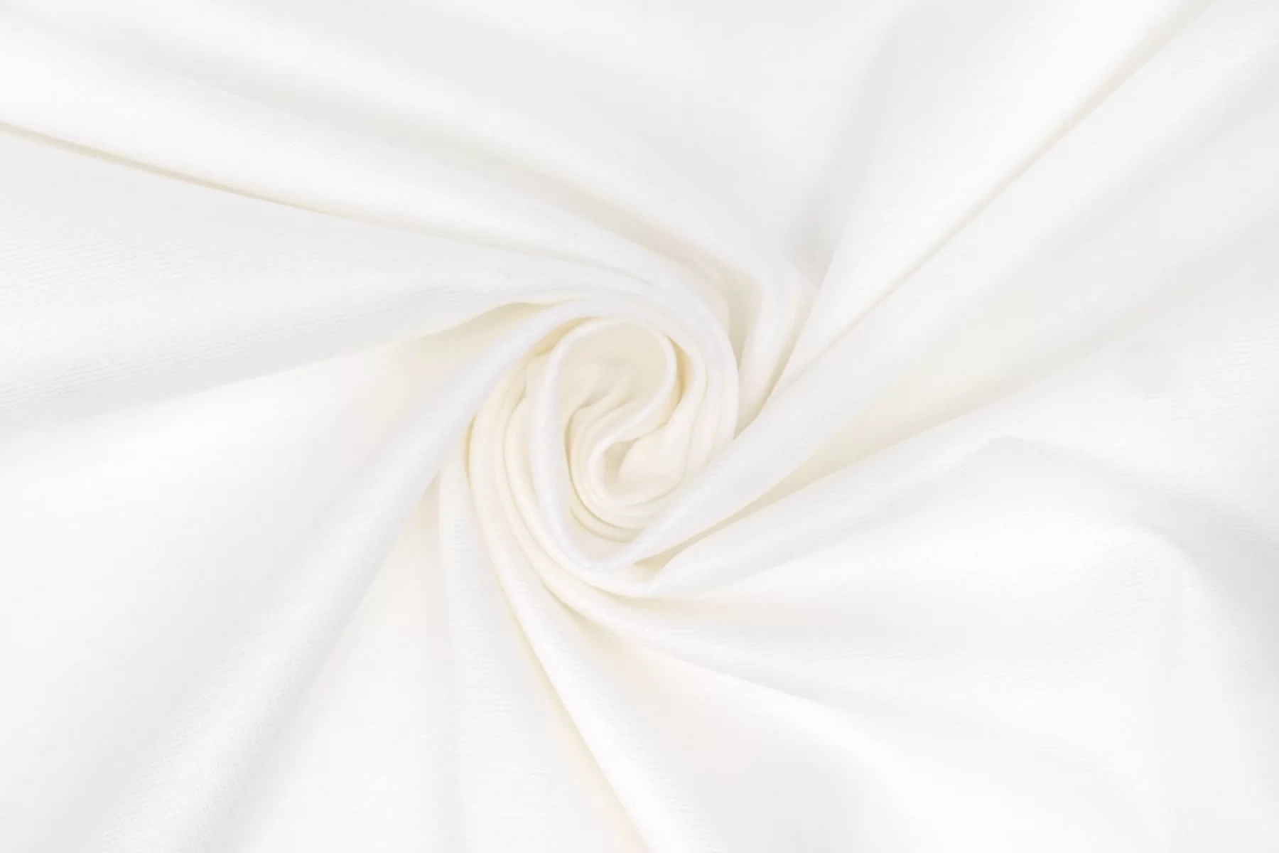 На отрезе пыльные загрязнения! Вискозный джерси от бренда MOSCHINO в белом цвете. Тактильно гладкий, мягкий и плотный, пластичный. С нежным лоском. Немного сминается, но восстанавливается практически полностью. Отлично и упруго, тянется за счет плетения и эластана. Не просвечивает. Красив в своей пластике. Хорошо драпируется и немного держит форму. Вариант на платья, кофты, костюмы, юбки, брюки на резинке и не только. Обязательно учитывайте усадку! По долевой дает усадку 25-30%, а по поперечной увеличивается до 15%