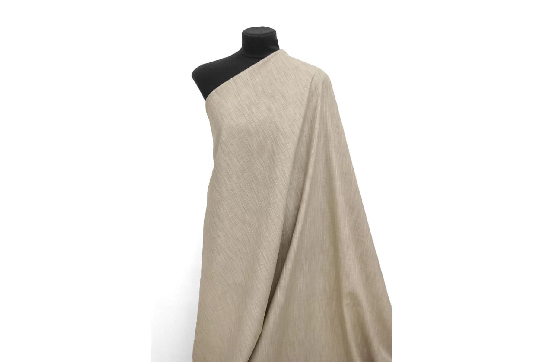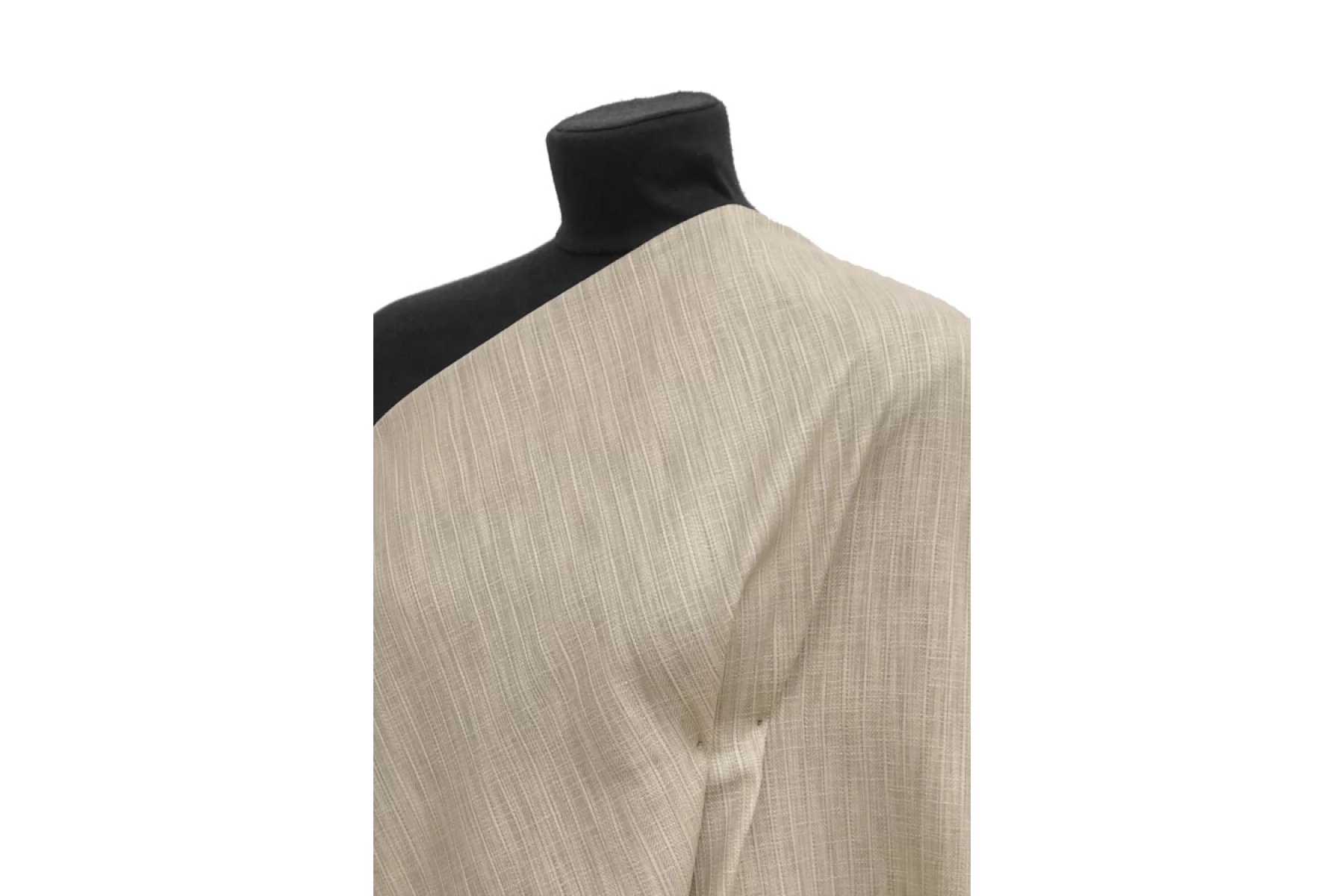 На отрезе пыльные загрязнения! Костюмно-плательный хлопок, очень напоминающий лен в светлом серо-бежевом оттенке. Изнаночная сторона - белая. Тактильно материал очень приятный, гладкий, мягкий. С уплотнениями. Достаточно плотный, но при этом тонкий, фактурный наощупь. Не тянется. Не просвечивает, хорошо держит форму. Шьем костюмы, платья, юбки, жакеты, а также шорты и брюки.