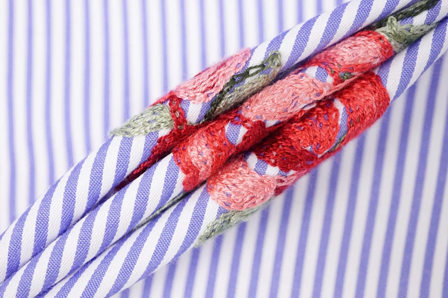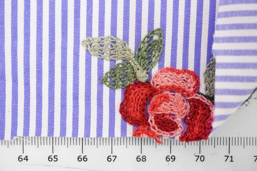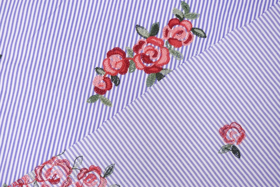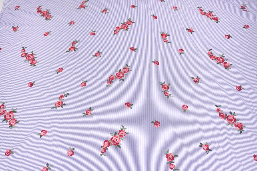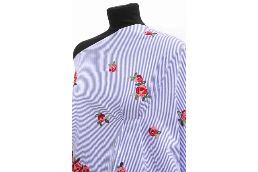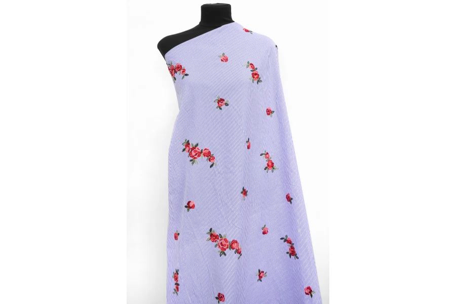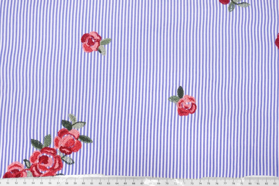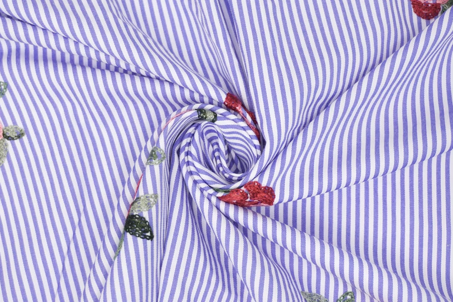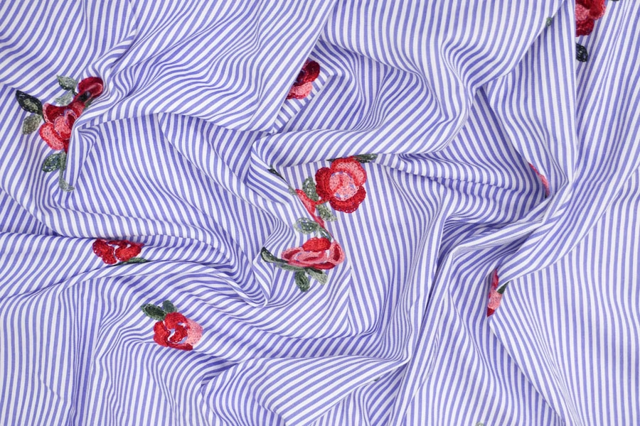 На отрезе желтые едва заметные пятна! Очень красивый плательно-рубашечный хлопок диагонального плетения в полоску сине-голубого оттенка с цветочной вышивкой в оттенках приглушенных зеленых, винных и розового. Тактильно очень приятный, мягкий, с прекрасной пластикой. Тонкий, но плотный. Не просвечивает. С легким лоском. Не тянется. Мнется совсем немного. Красив в складках и драпировках. Хорошо держит форму. Отличный вариант на платья, рубашки, юбки и не только.