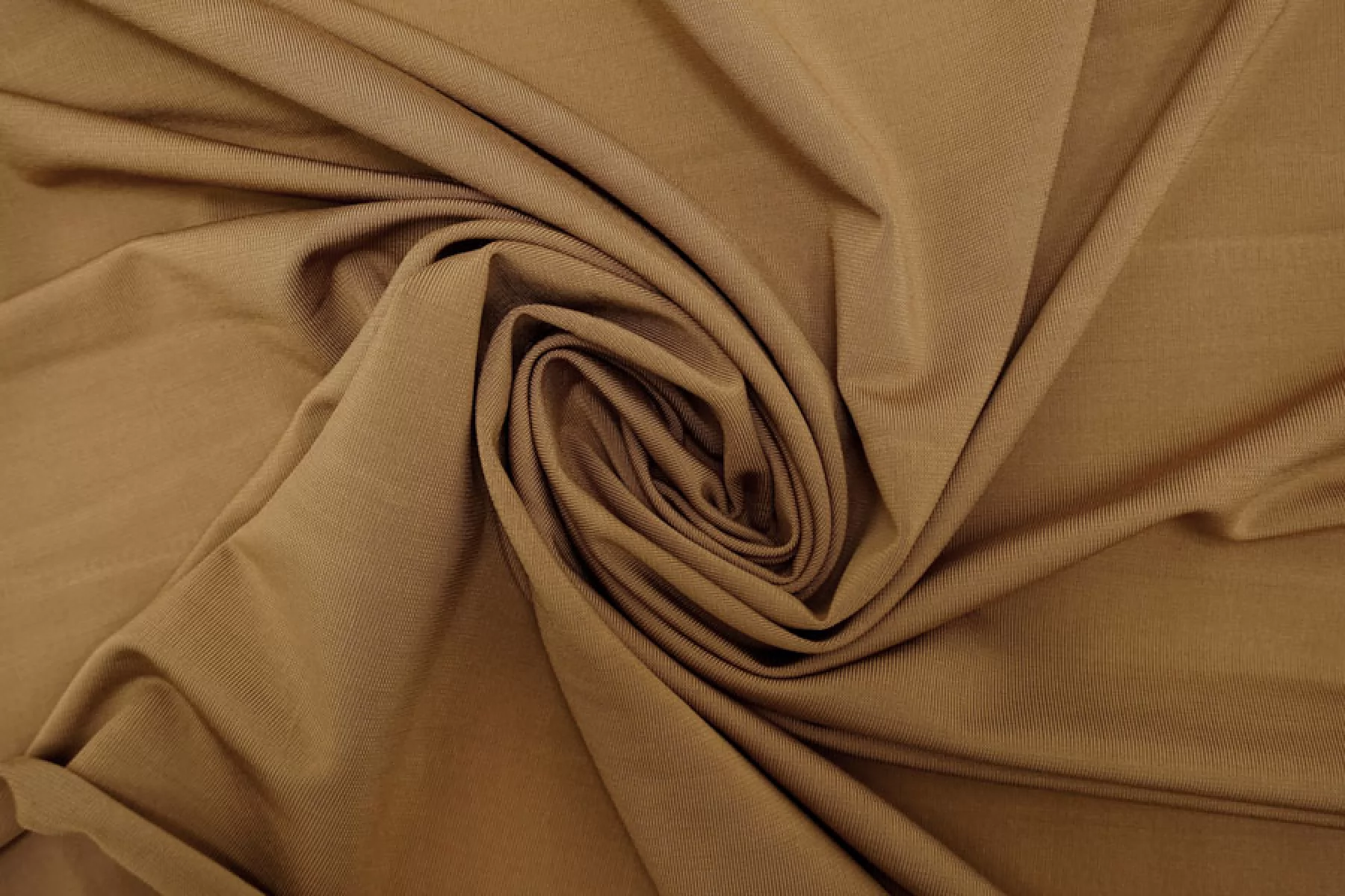 ЦЕНА УКАЗАНА ЗА ОТРЕЗ! (При заказе в метраже указывать 1) Холодный креповый вискозный трикотаж в слегка разбелённом коричневом цвете. Материал тонкий но при этом плотный. Гладкий тактильно, струящийся, холодящий. Эластичный, просвечивает если смотреть насквозь в один слой, не мнется. Подойдет для пошива платья, юбки, футболки, майки, тонких летних брюк.