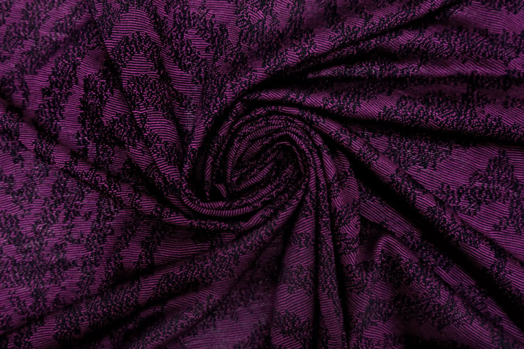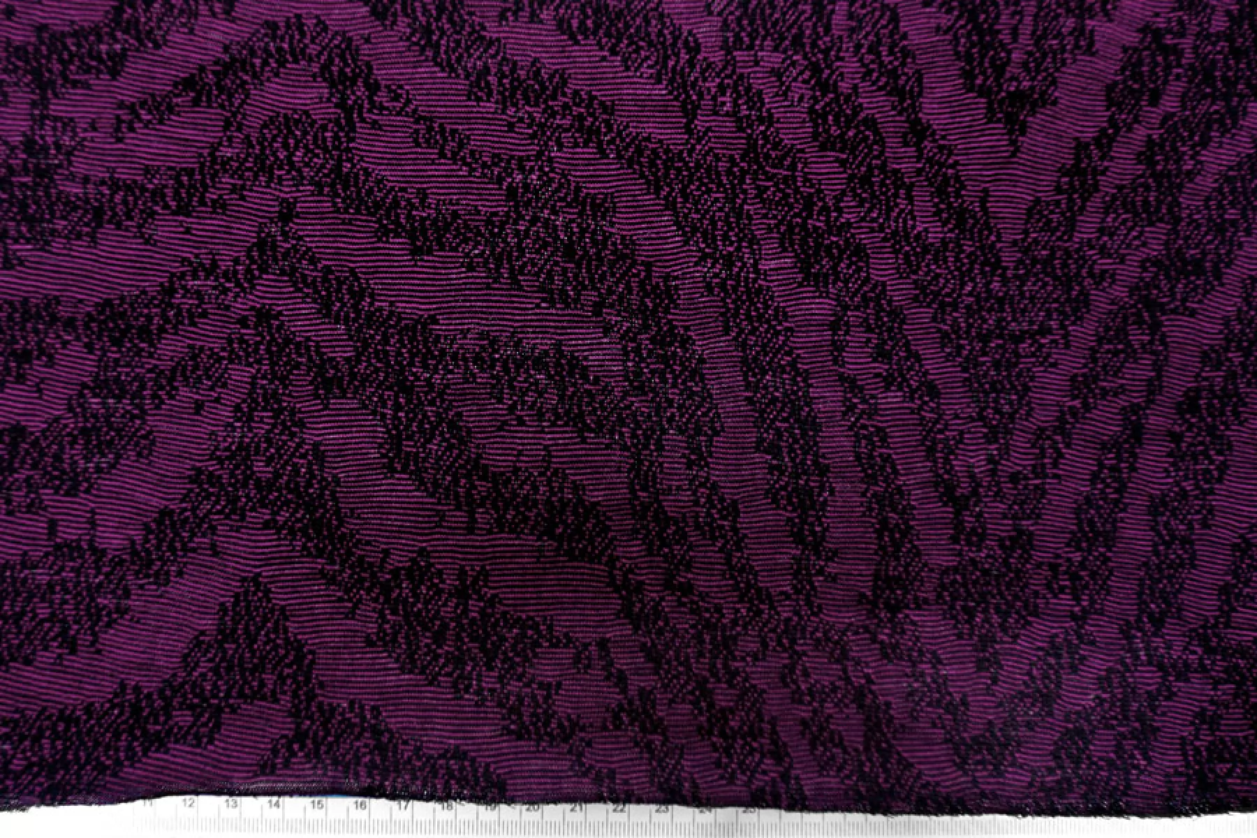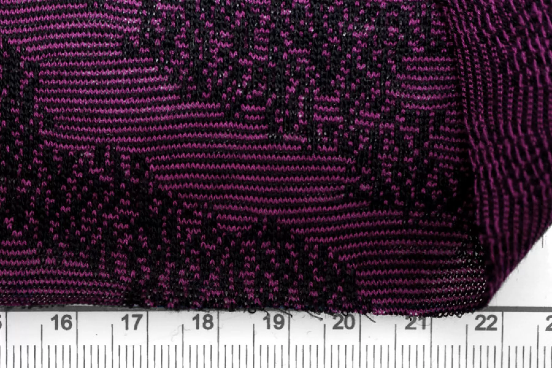На отрезе мелкие дырочки! Тонкий трикотаж из шерсти с хлопоком, узор фактурный волнообразный из переплетения нитей черного и сливового оттенка. По плетению кулирная гладь. Мягкий, приятный, немного чувствуется фактура. Не колется. Трикотаж просвечивает, пластичный, эластичный. Подойдет для пошива майки, футболки, топа, тонкой водолазки. Уход деликатный.