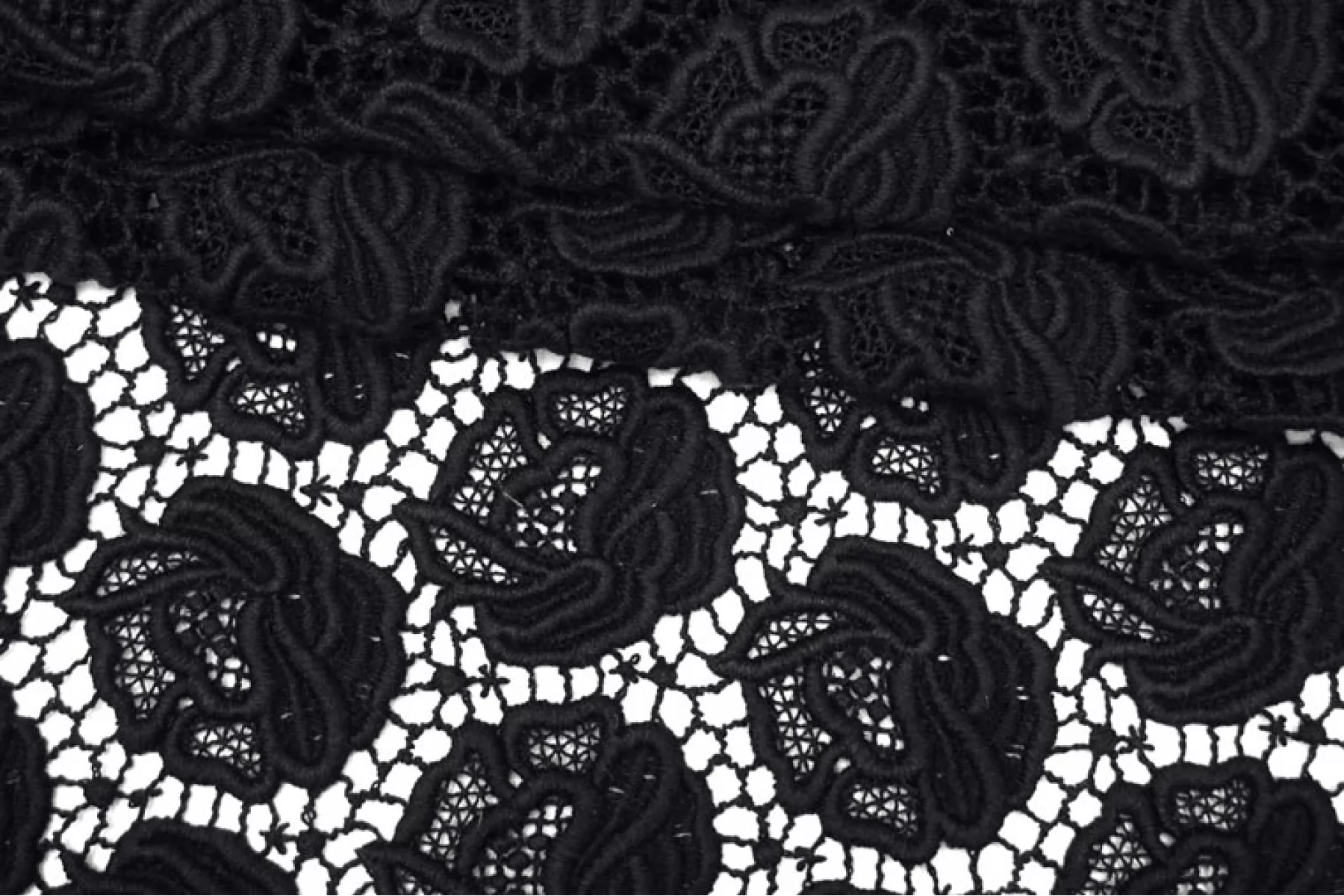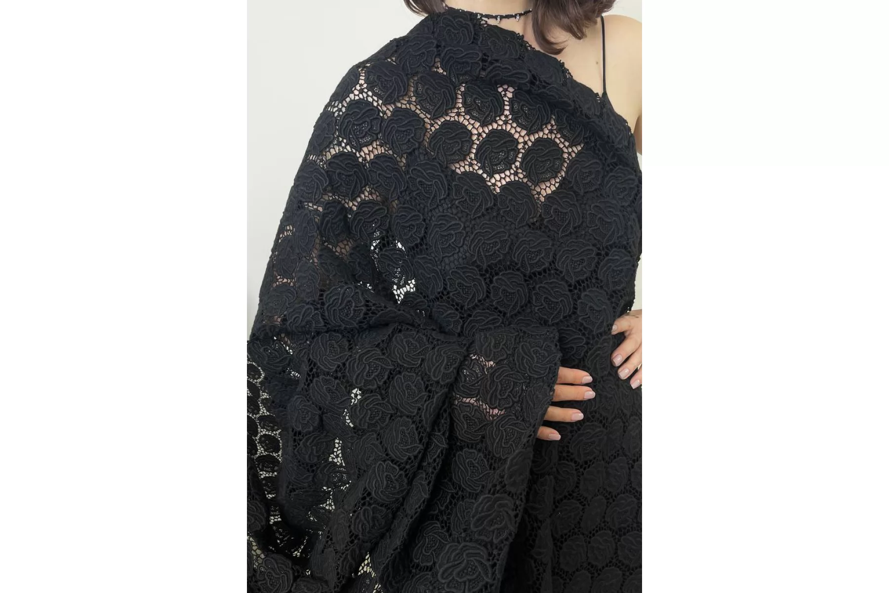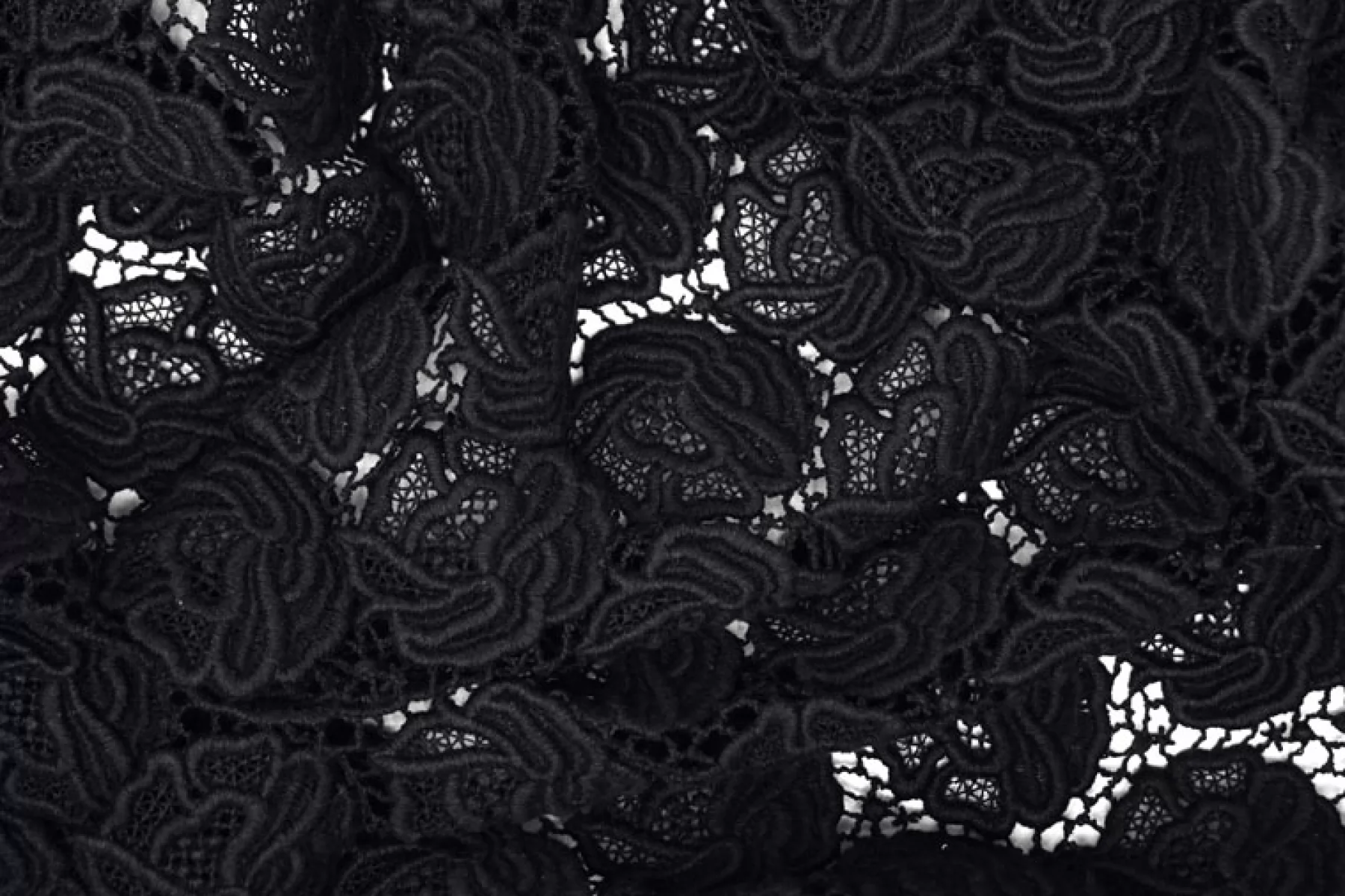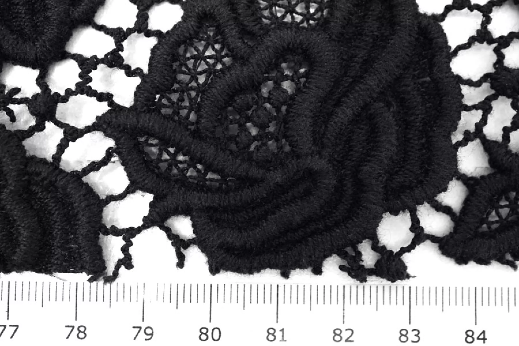 ЦЕНА УКАЗАНА ЗА ОТРЕЗ! (При заказе в метраже указывать 1) Очень красивое хлопковое черное итальянское макраме от бренда Max Mara с цветочным узором. Материал жестковатый, гладкий. Не тянется, не мнется. Форму держит. Хорошо подойдет на нарядные варианты одежды, декорирования или отделки как одежды, так и аксессуаров.