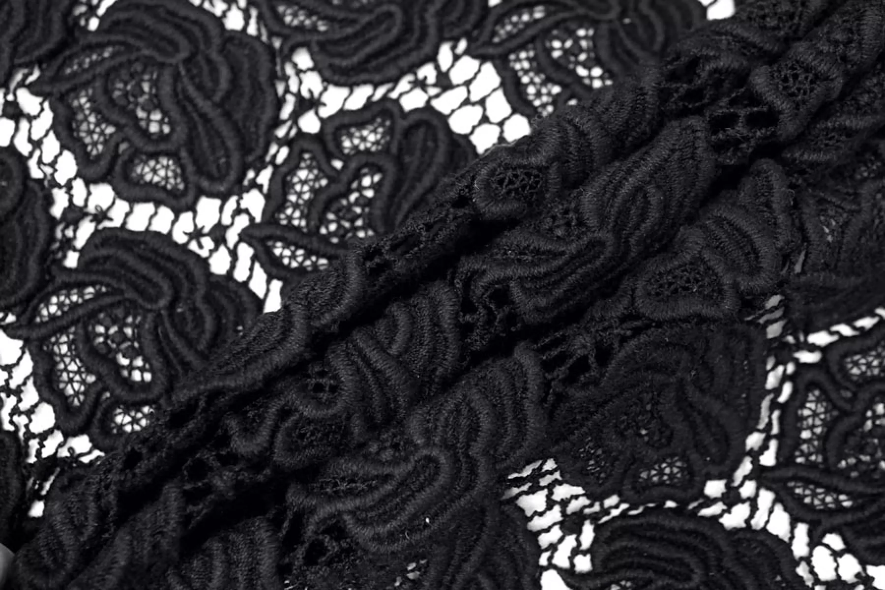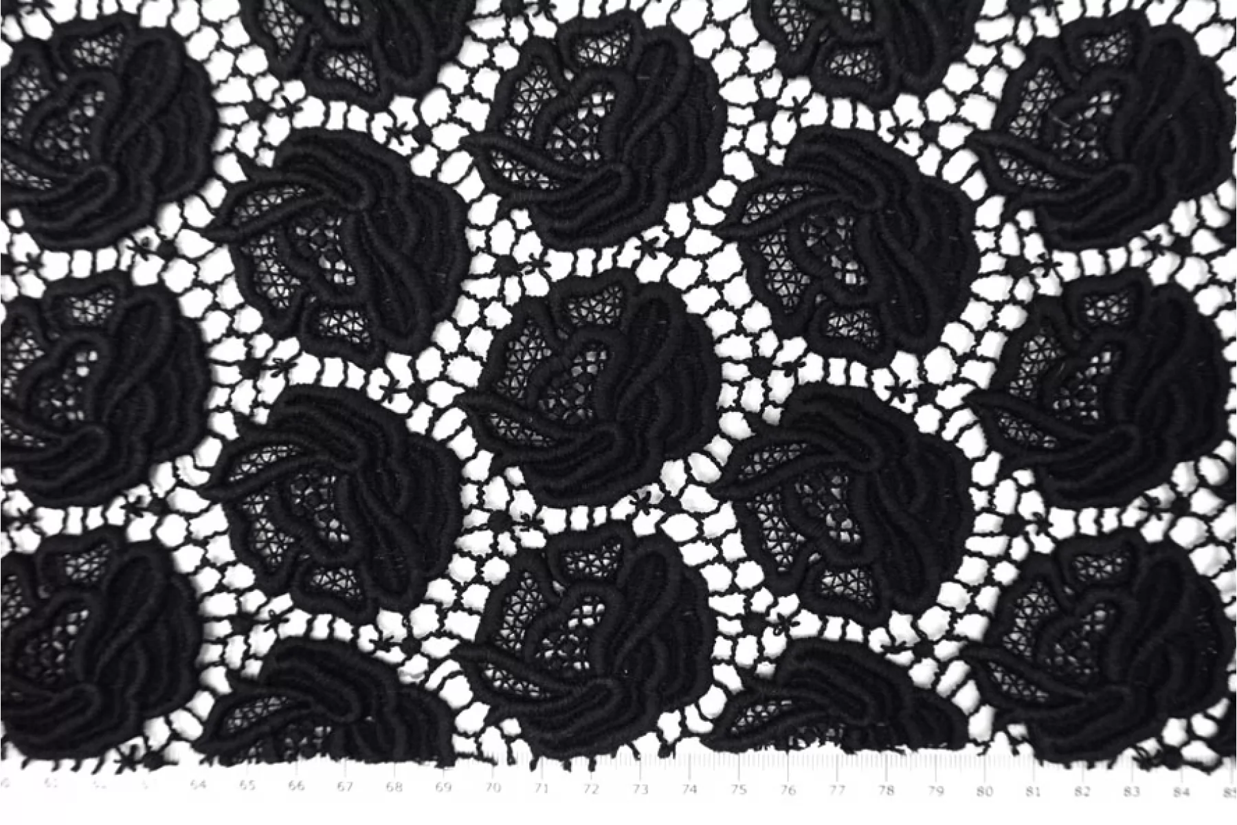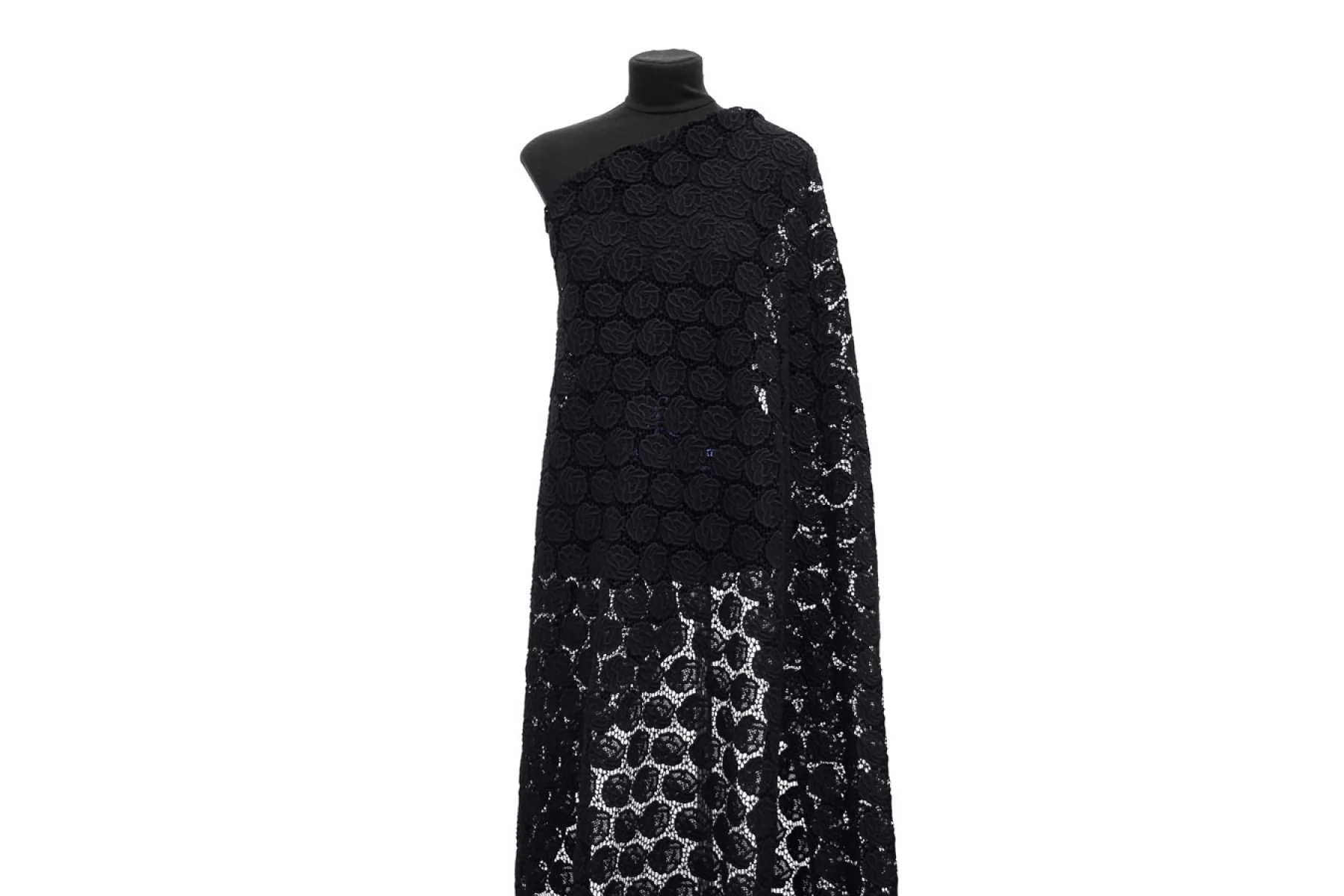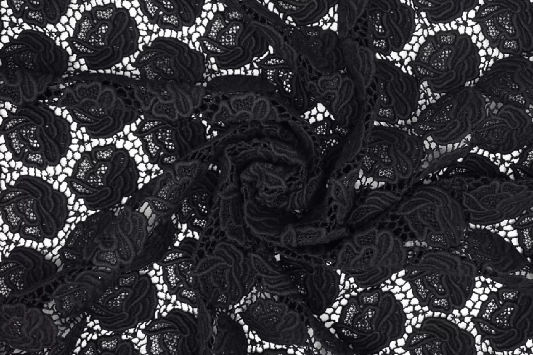 ЦЕНА УКАЗАНА ЗА ОТРЕЗ! (При заказе в метраже указывать 1) Очень красивое хлопковое черное итальянское макраме от бренда Max Mara с цветочным узором. Материал жестковатый, гладкий. Не тянется, не мнется. Форму держит. Хорошо подойдет на нарядные варианты одежды, декорирования или отделки как одежды, так и аксессуаров.