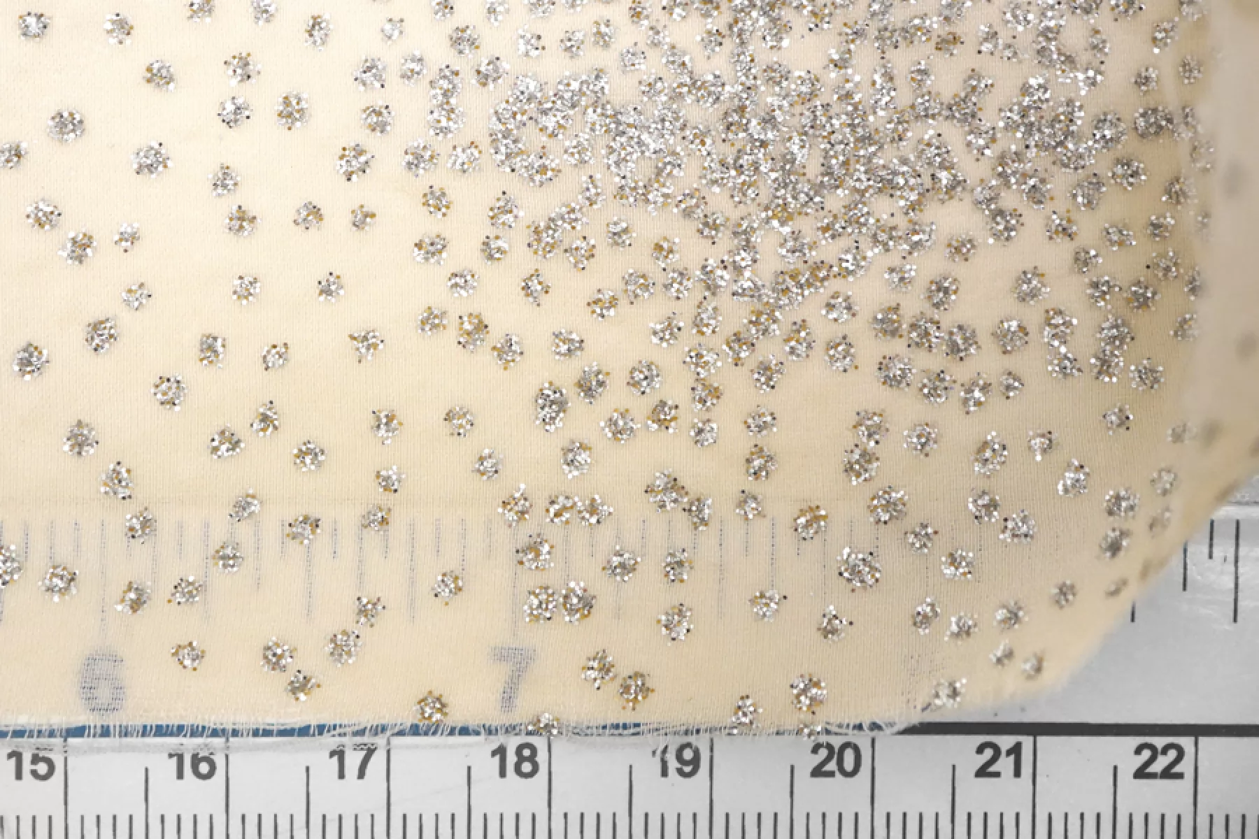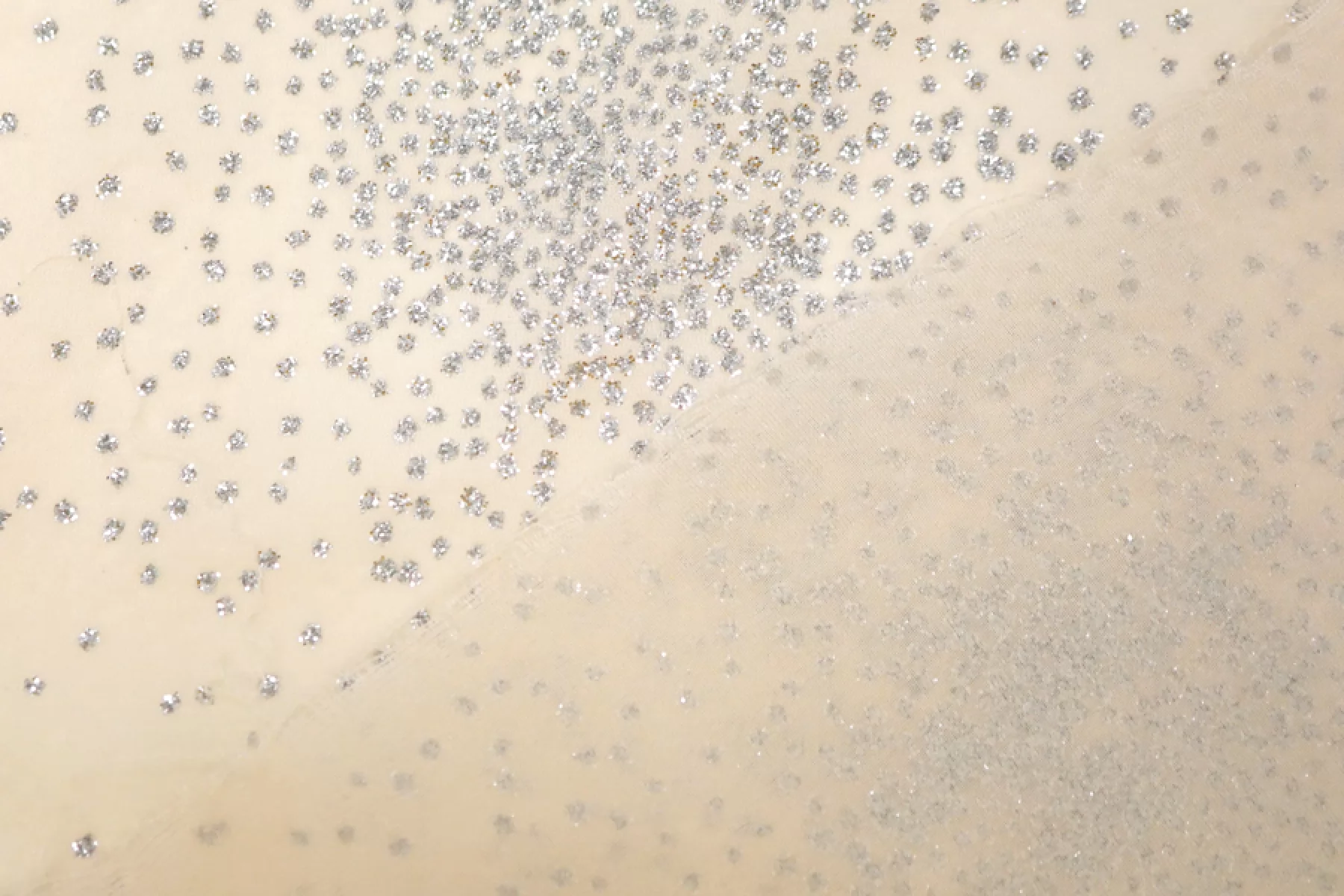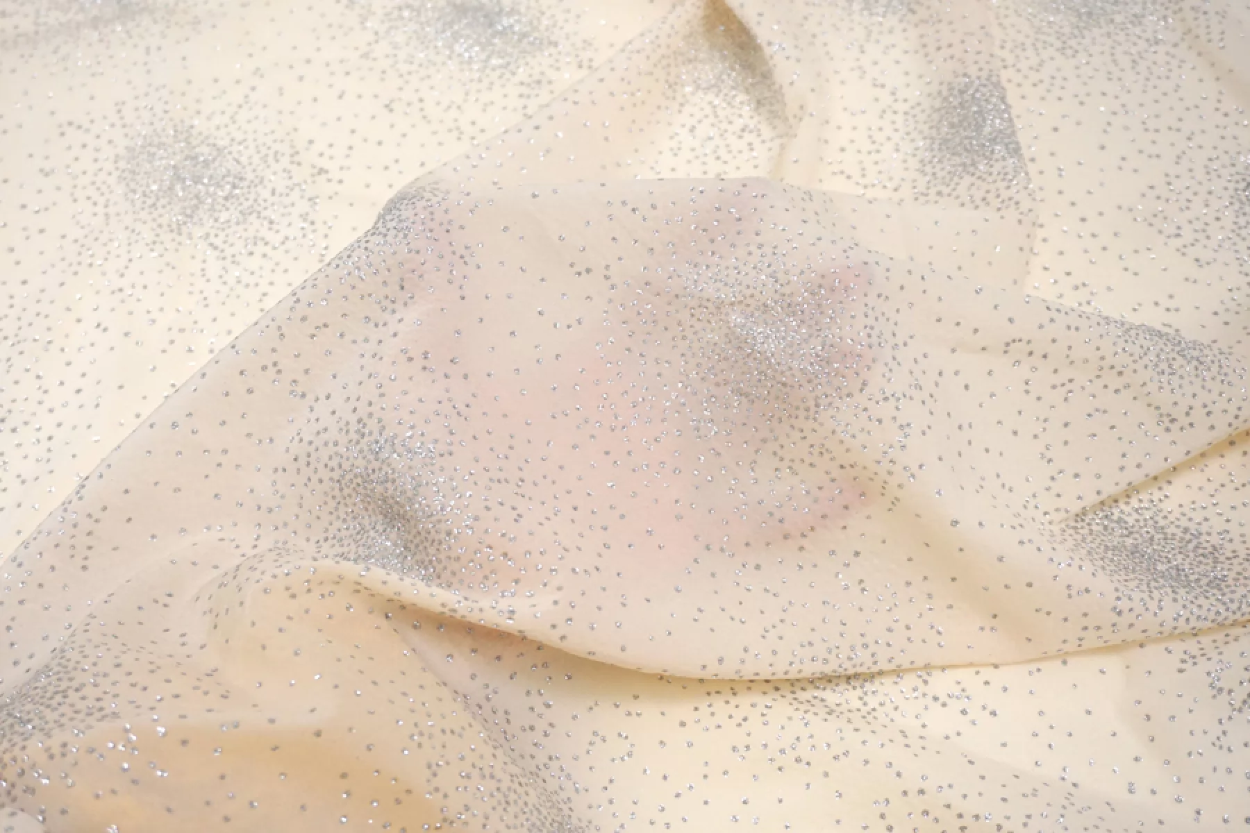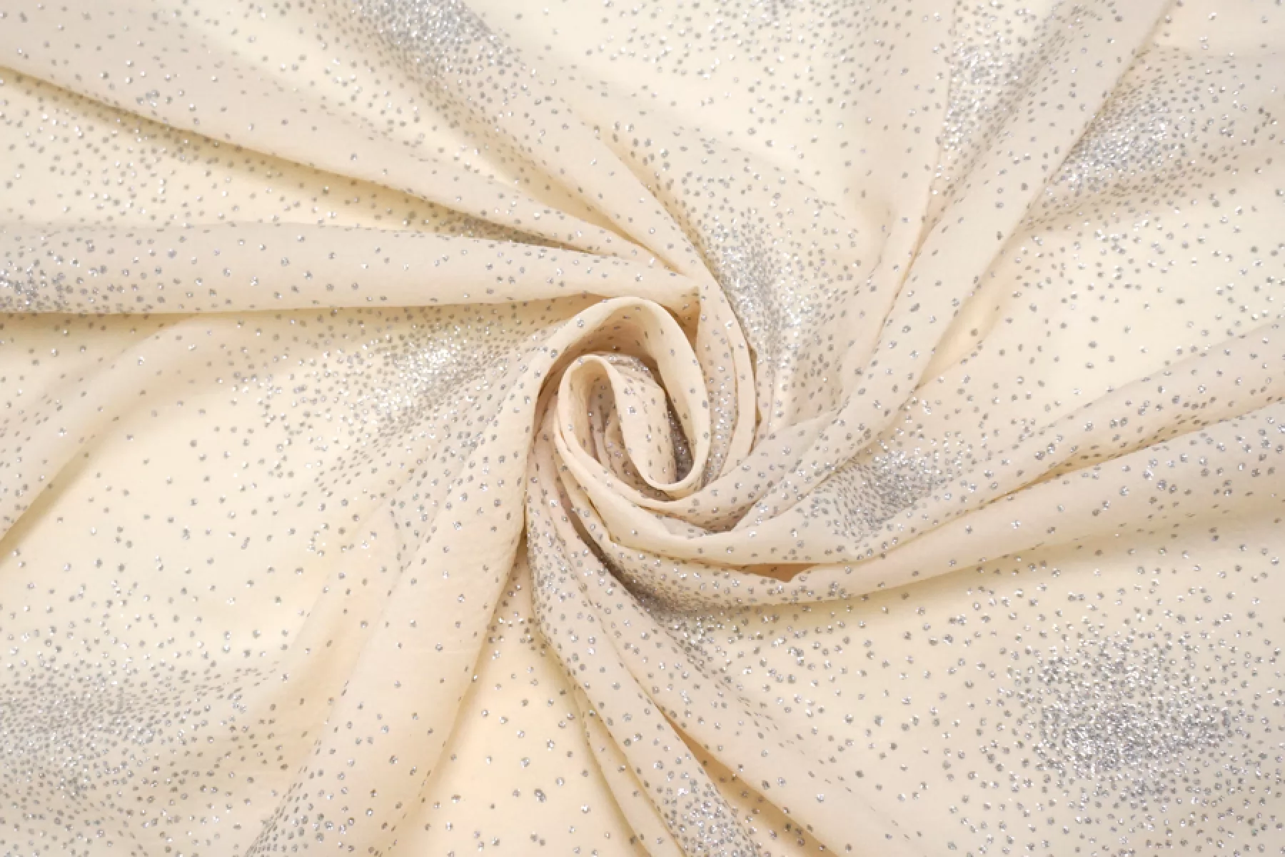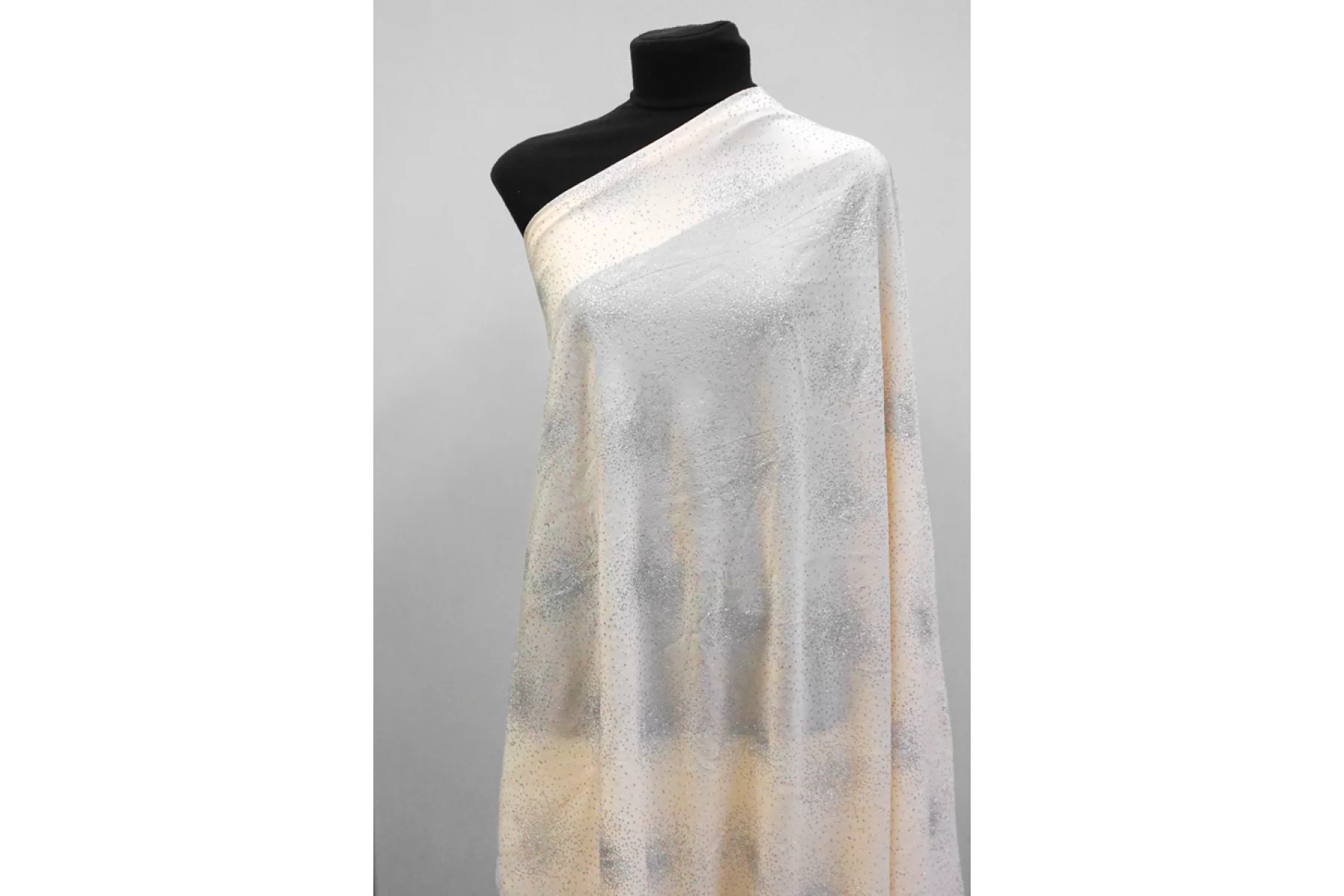 На отрезе печать на ткани, ближе к кромки! ВНИМАНИЕ! Осыпаются блестки. Шикарный шифон из вискозы, в светлом оттенке бежевого (экрю), поверх нанесены серебристые блёстки. Чуть жатая фактура. Приятный, слегка шероховатый. Хорошо тянется, мнётся умеренно. Просвечивает. Форму не держит, но красив в складках. Шьем блузки, платья, юбки, или используем для отдельных элементов изделия. Уход деликатный. Блёстки немного осыпаются.