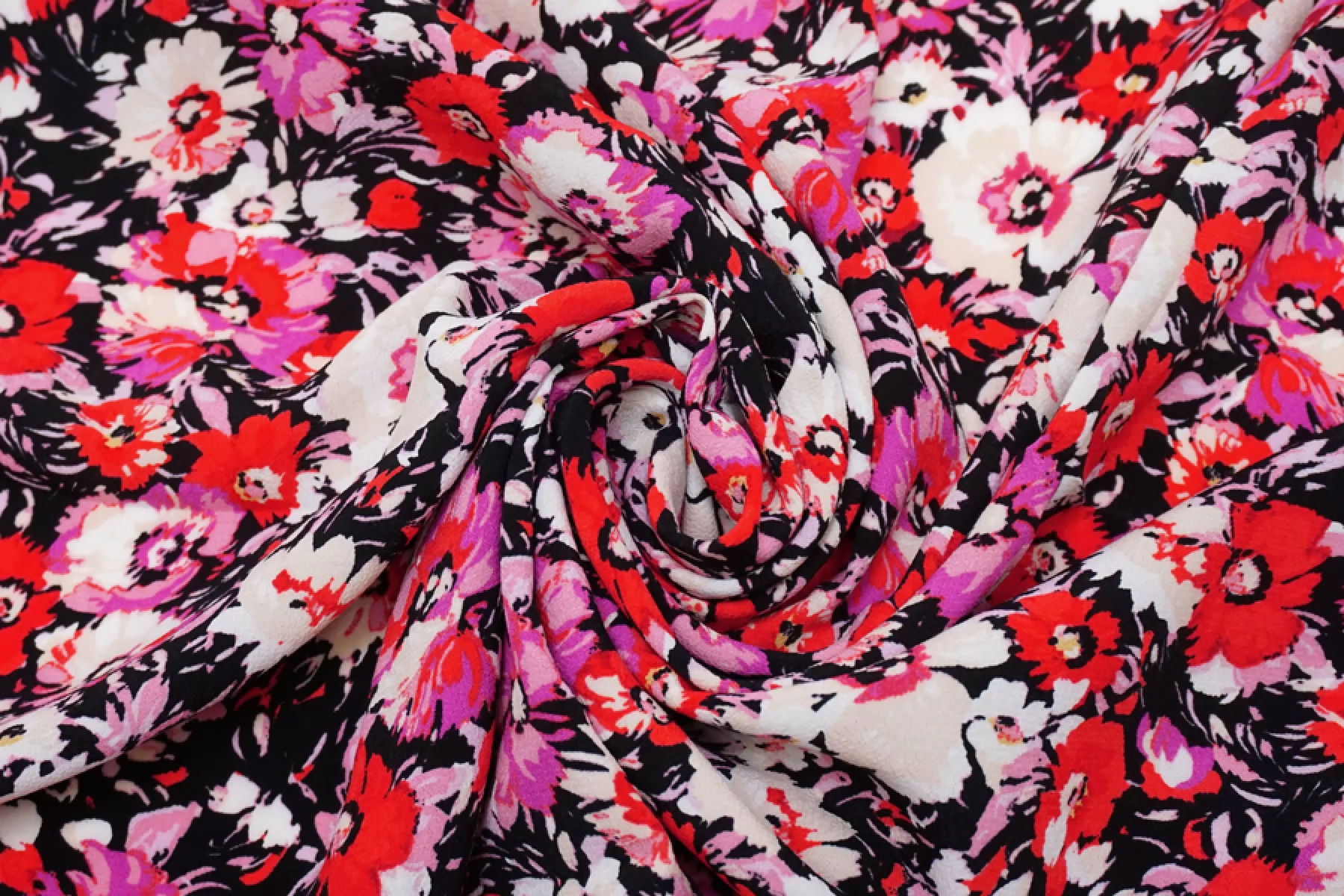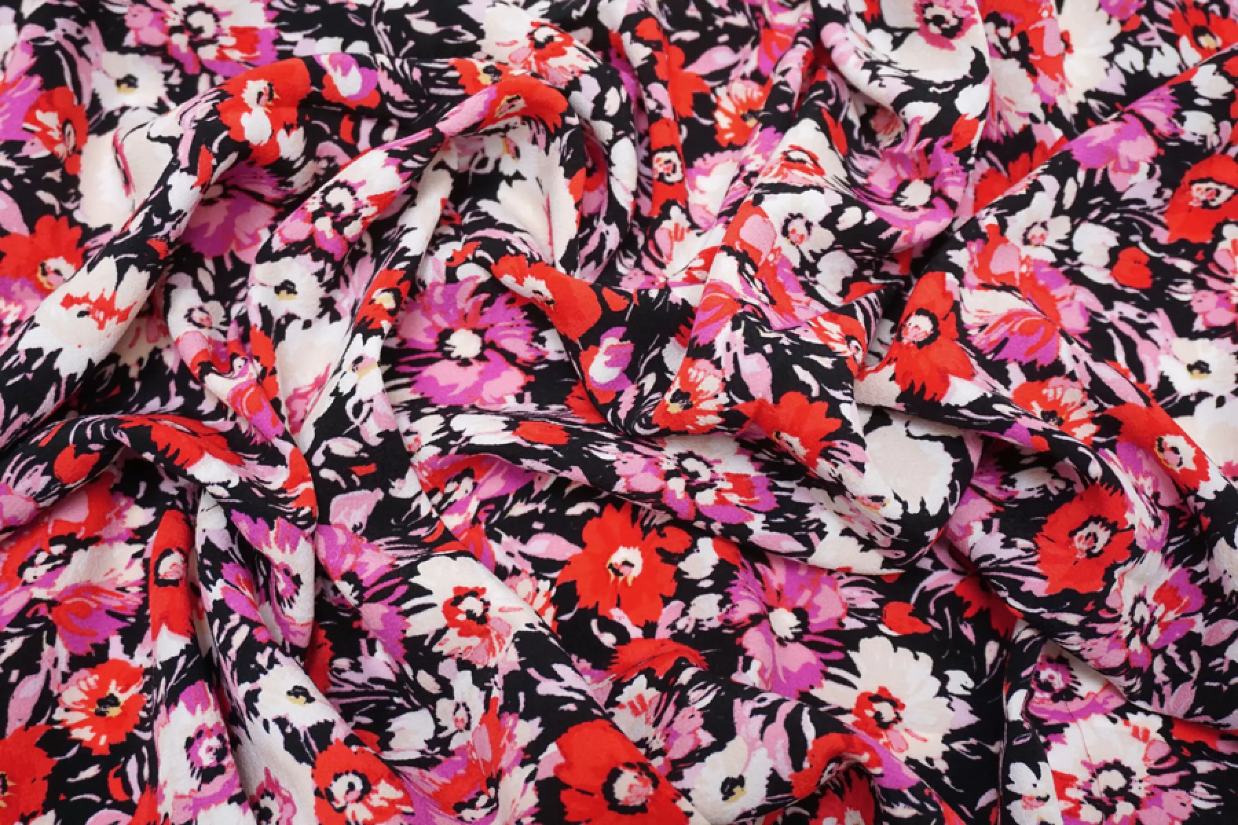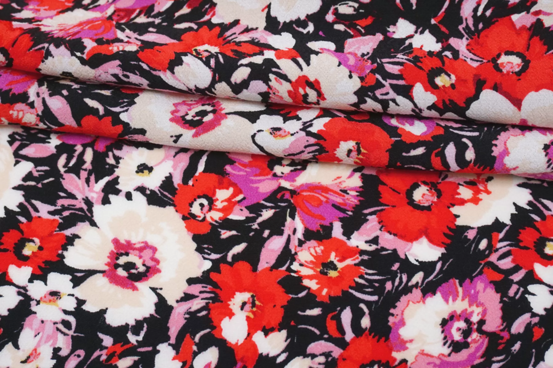 На отрезе полоса поперек отреза! Креповая вискоза со стилизованным цветочным принтом (розовый, красный, бежевый, белый) на чёрном фоне. Приятная и шероховатая наощупь. Тонкая, пластичная, красиво драпируется, форму не держит. Плетение немного пружинит. Немного просвечивает в один слой. Мнется. Прекрасный вариант на летние платья, юбки, летящие брюки, блузки. Учитывайте усадку.