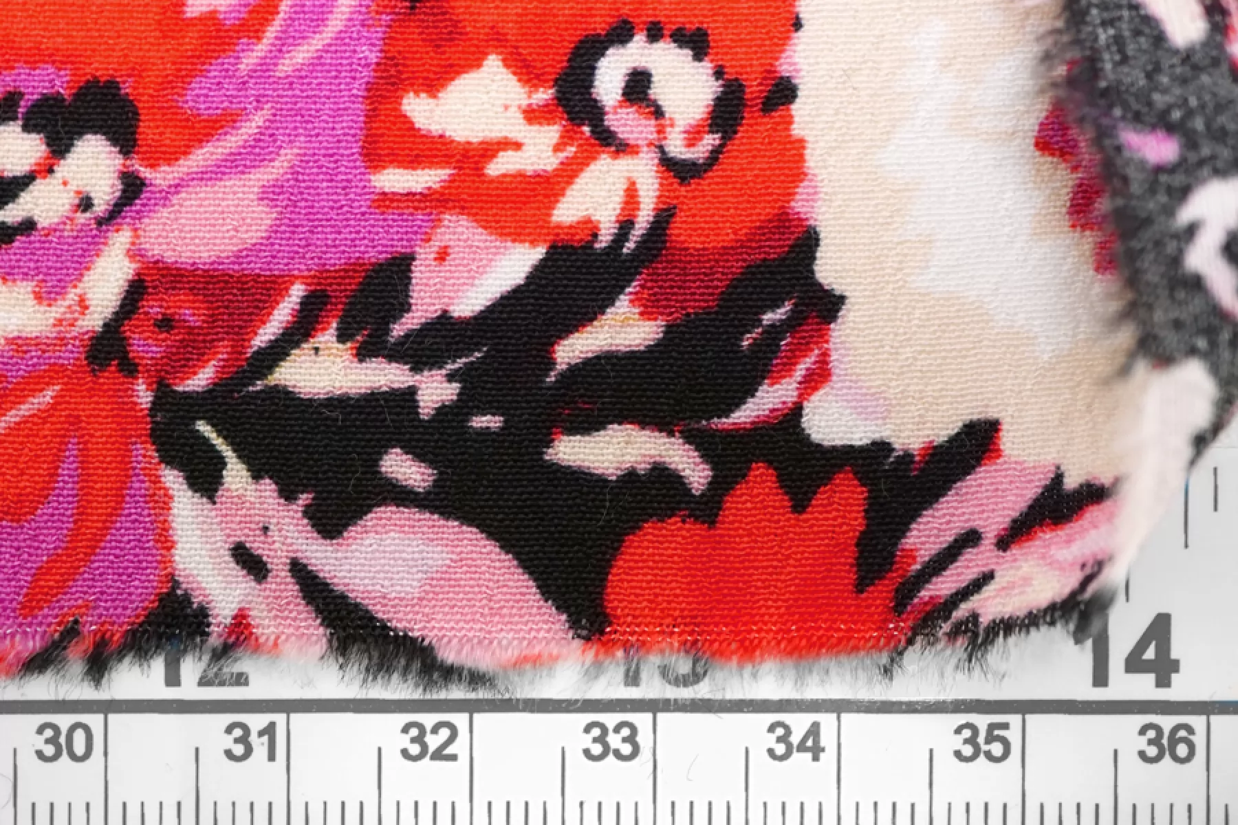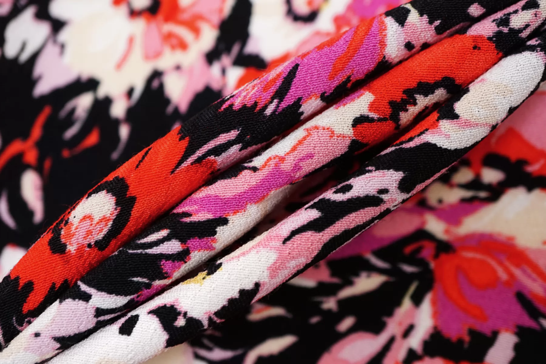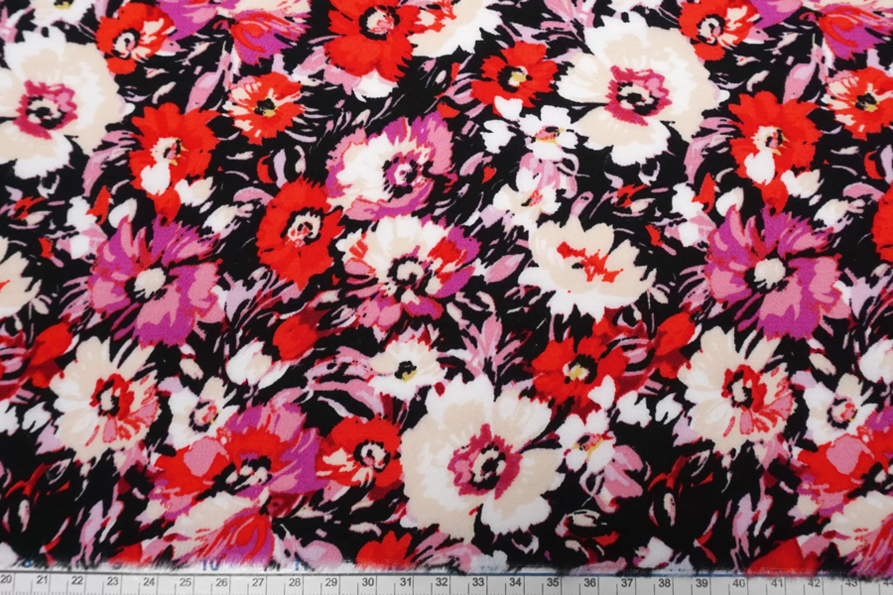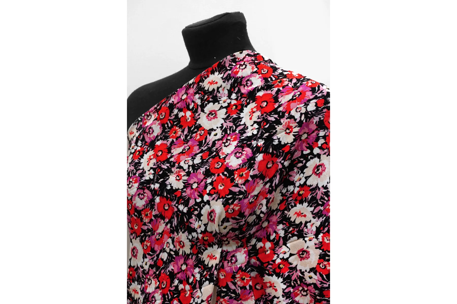 На отрезе полоса поперек отреза! Креповая вискоза со стилизованным цветочным принтом (розовый, красный, бежевый, белый) на чёрном фоне. Приятная и шероховатая наощупь. Тонкая, пластичная, красиво драпируется, форму не держит. Плетение немного пружинит. Немного просвечивает в один слой. Мнется. Прекрасный вариант на летние платья, юбки, летящие брюки, блузки. Учитывайте усадку.
