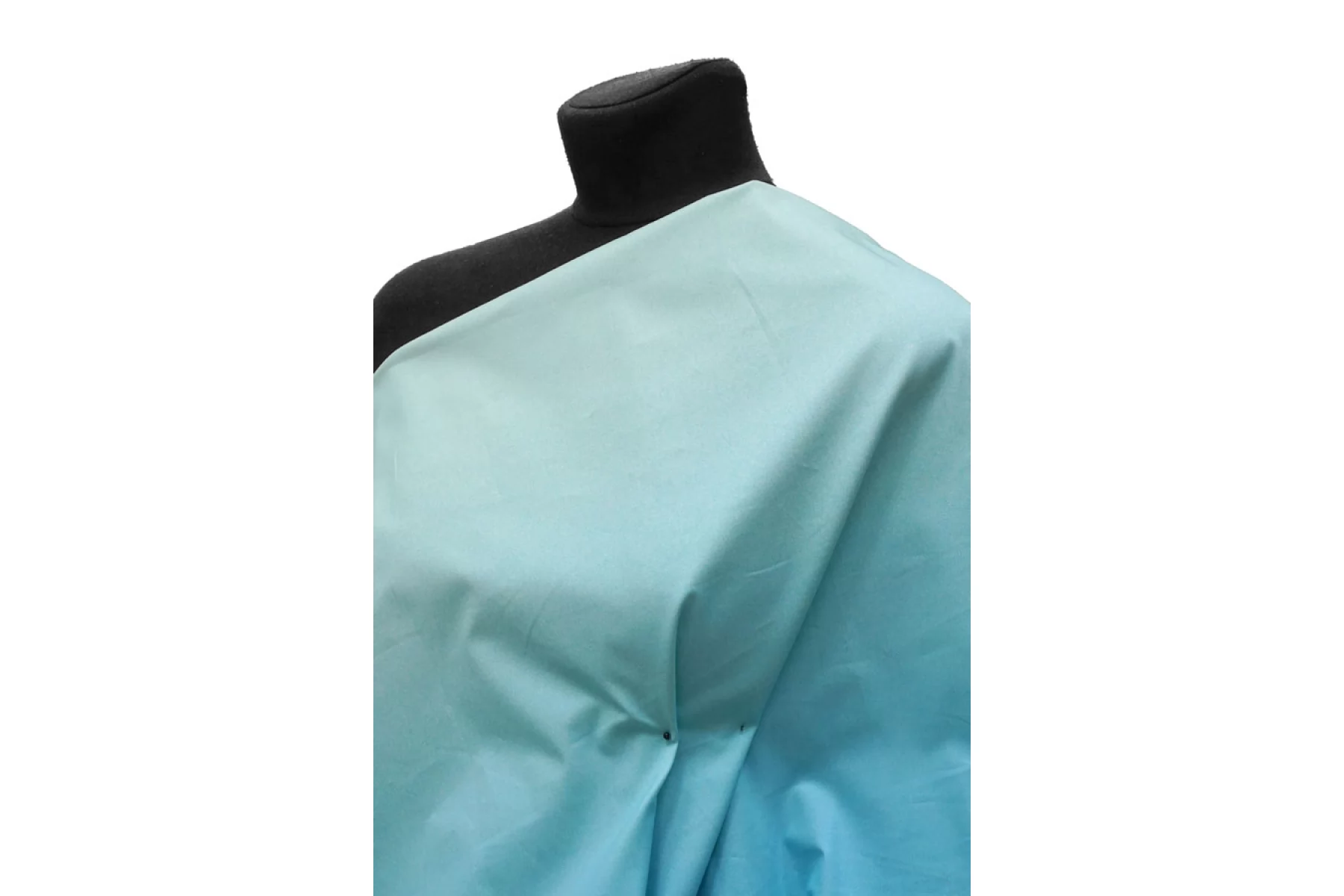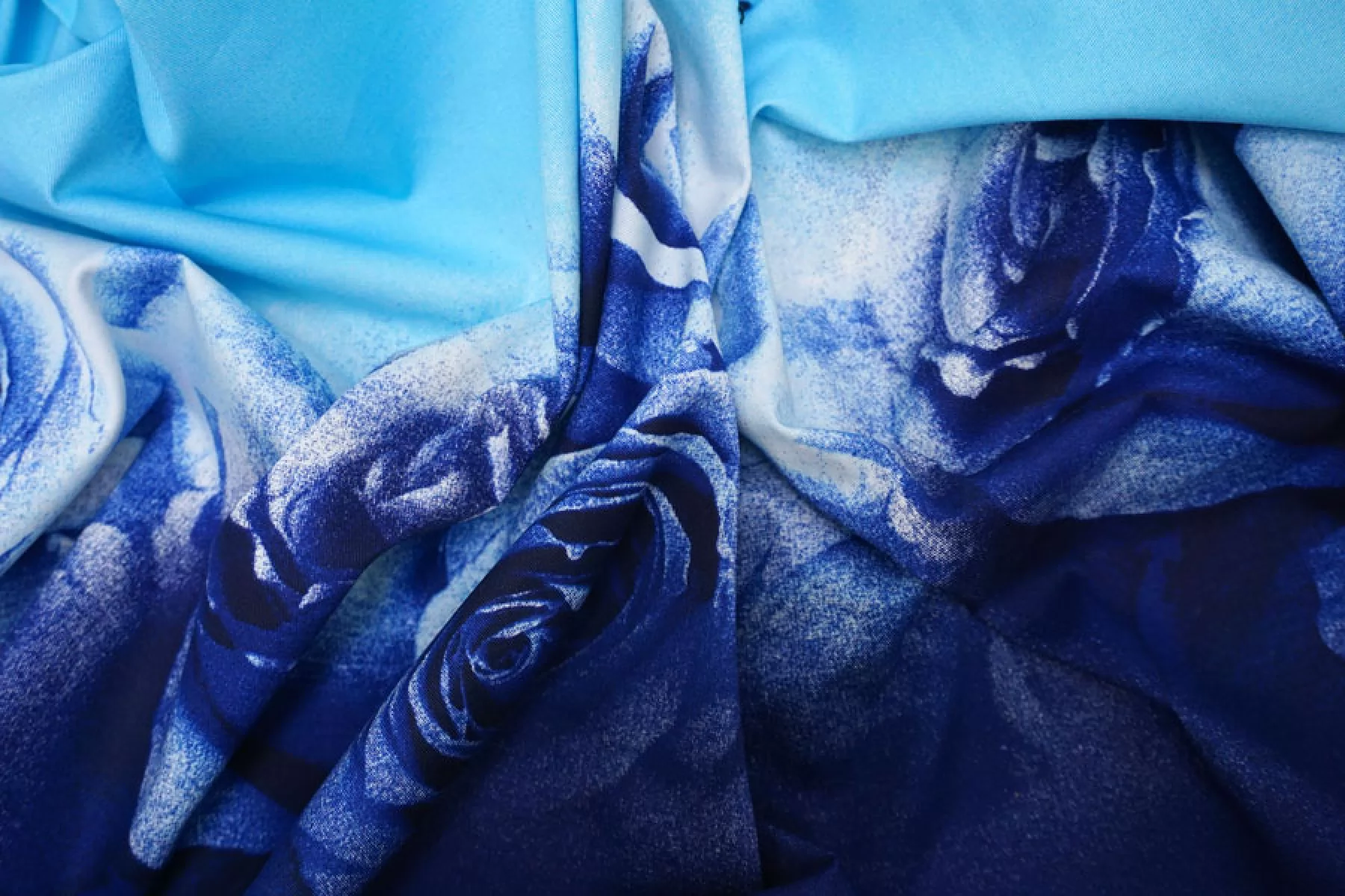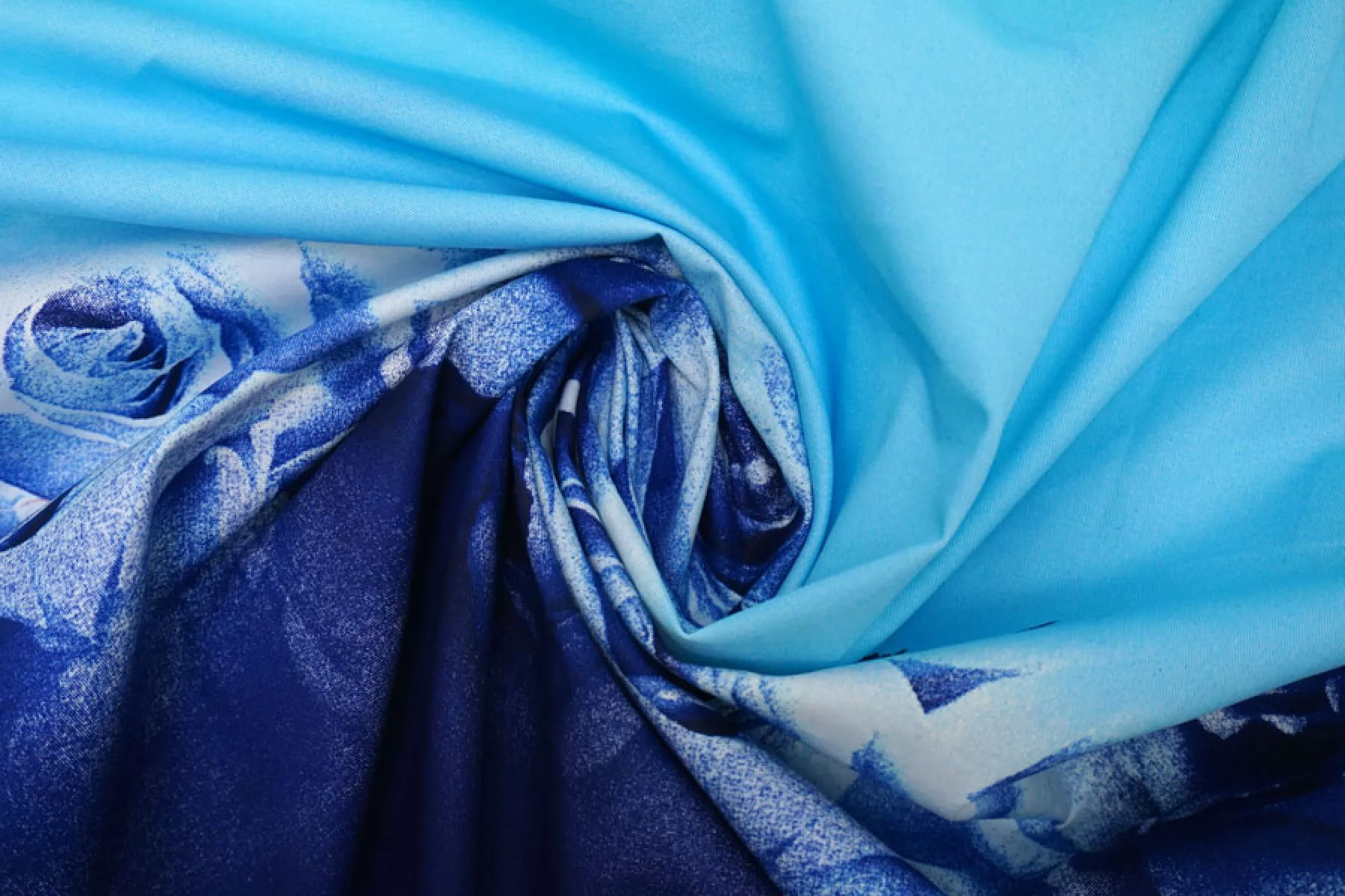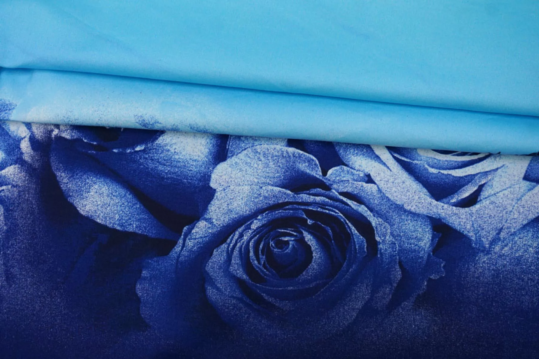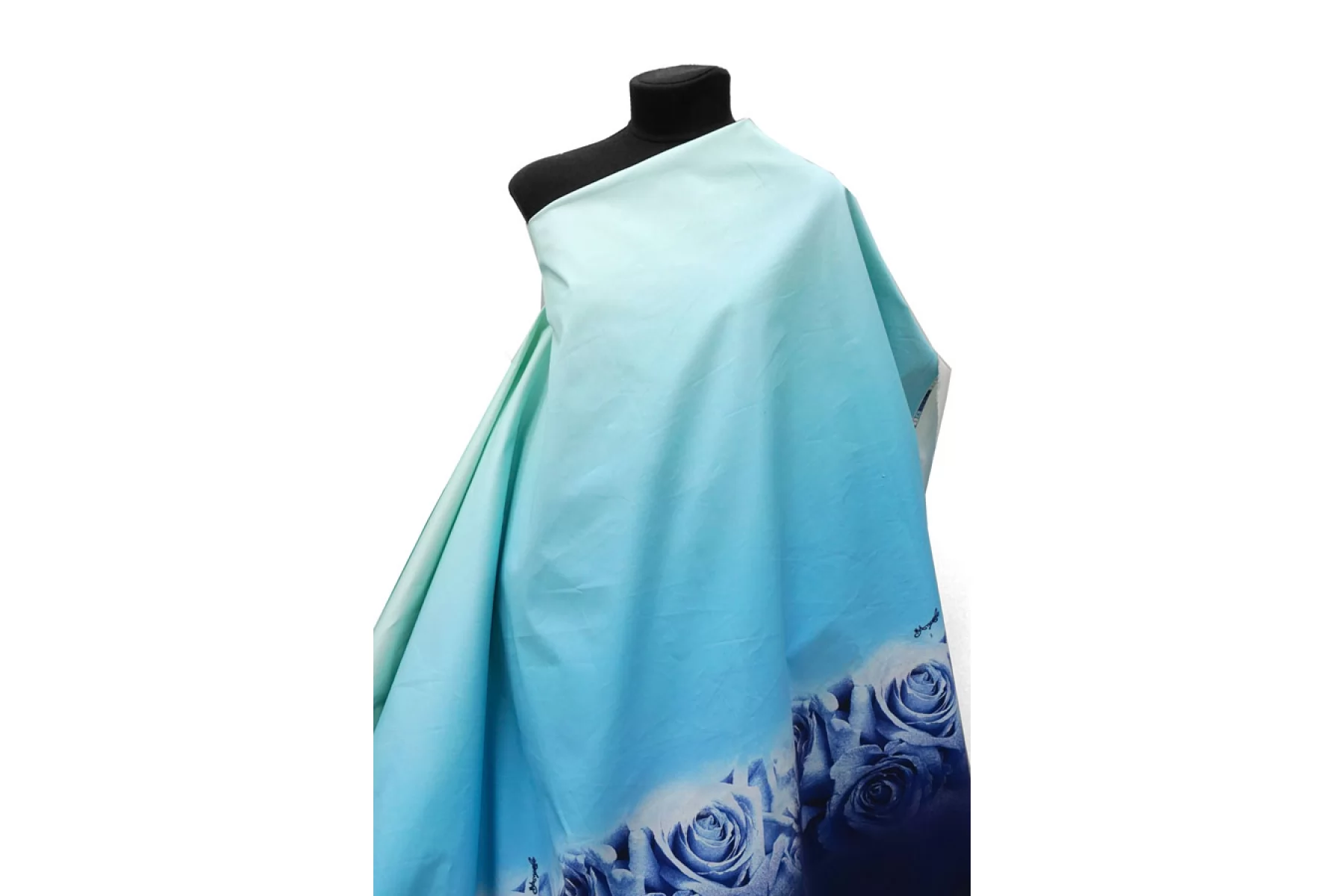 Итальянский хлопок костюмной плотности с крупным принтом в виде роз, фон бирюзовый переходящий в тёмно-синий. Плотный, чуть шуршащий, тянется, не просвечивает. Форму держит. Подойдет на платье, юбку, жакет.