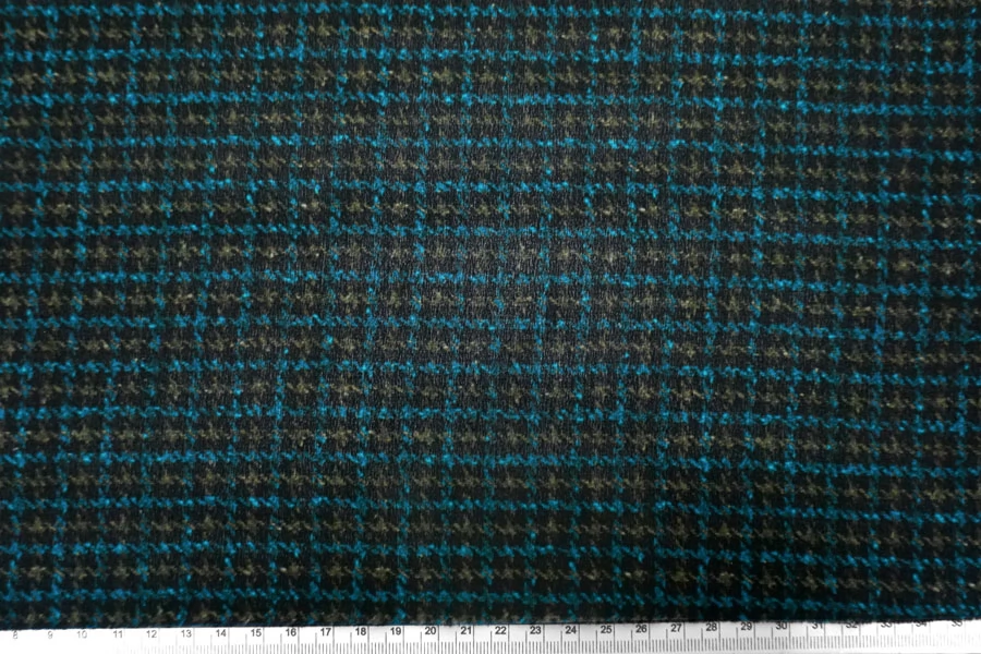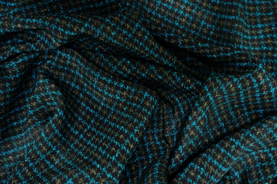 ЦЕНА УКАЗАНА ЗА ОТРЕЗ! (При заказе в метраже указывать 1) Итальянский шёлковый крепдешин от Max Mara с принтом в виде нечёткой гусиной лапки, сочетание чёрного, сине-голубого и защитно-зелёного цвета. Поверхность материала гладкая и скользящая, с легкой шероховатостью присущей крепдешину. Ткань легкая и летящая. Не тянется. Струится. Немного просвечивает в один слой. Не мнется. Форму не держит, но красив в драпировке. Отличный вариант на летние платья, блузки и юбки. При необходимости используйте подкладочный материал. Уход, как и за любым шелком, деликатный.