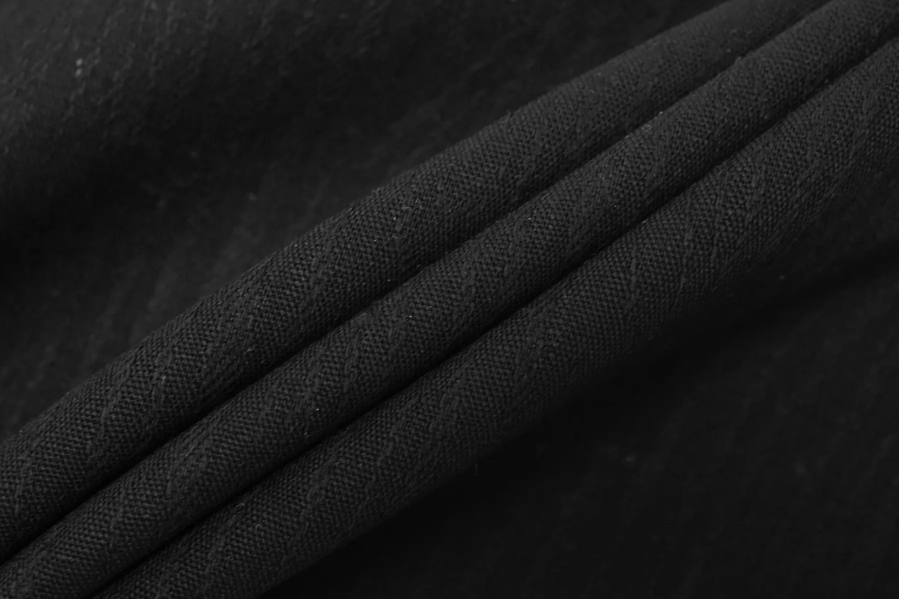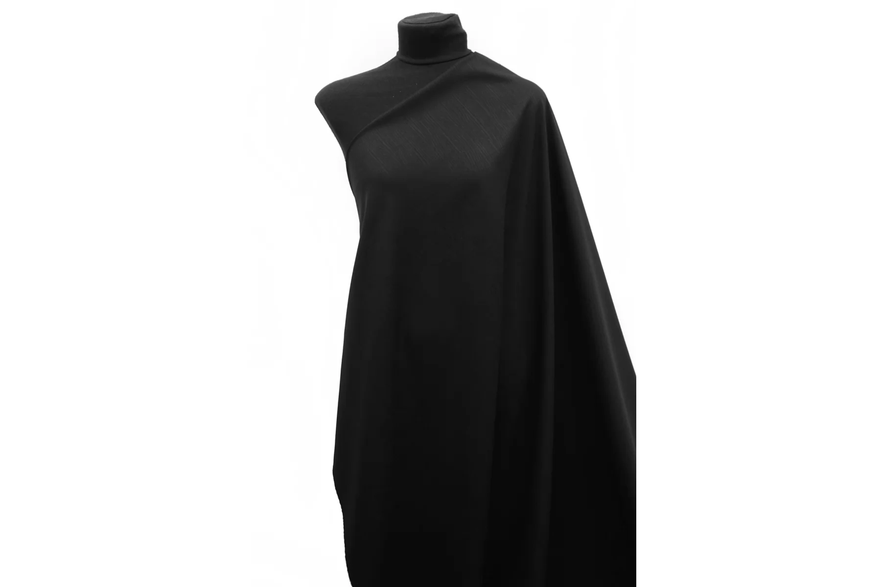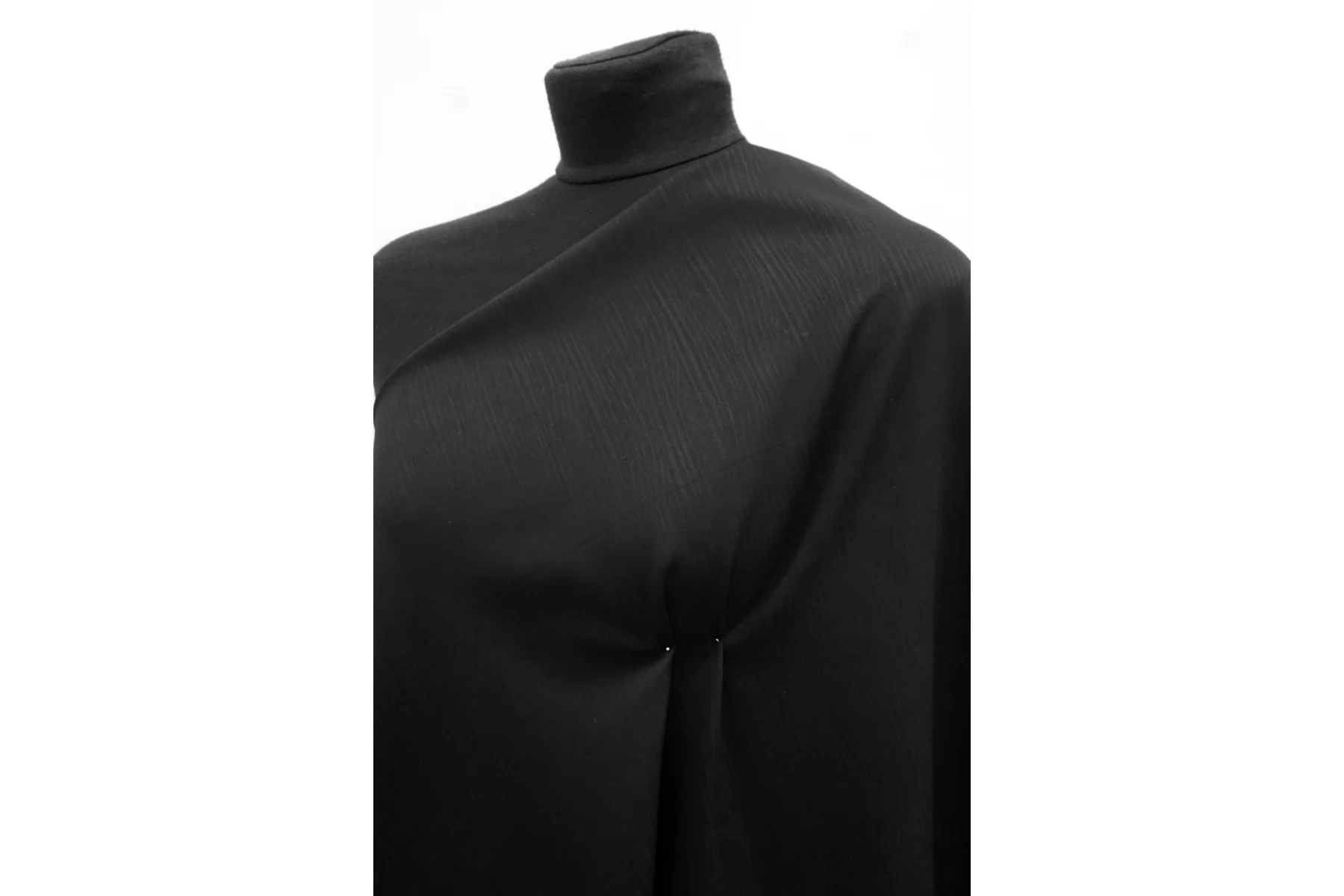 ЦЕНА УКАЗАНА ЗА ОТРЕЗ! (При заказе в метраже указывать 1) Костюмно-плательная шерсть в чёрном цвете, с интересным фактурным узором (чередование матовых нитей и нитей с лёгким лоском, напоминает узор коры). Материал приятный и гладкий тактильно, слегка сухой. Слегка просвечивает в один слой, в изделии заметно не будет. Немного тянется благодаря плетению. Не мнется. Тонкая, но плотная ткань. С хорошей пластикой, красиво драпируется. Форму не держит. Шьем зимние рубашки, платья, юбки, брюки. Уход деликатный.