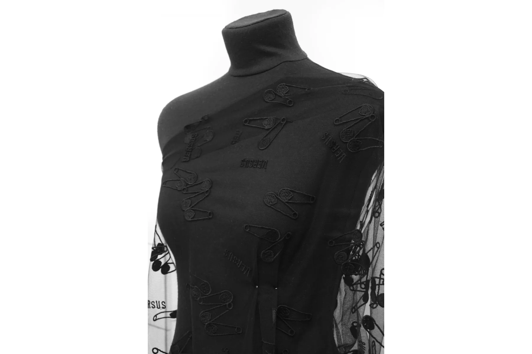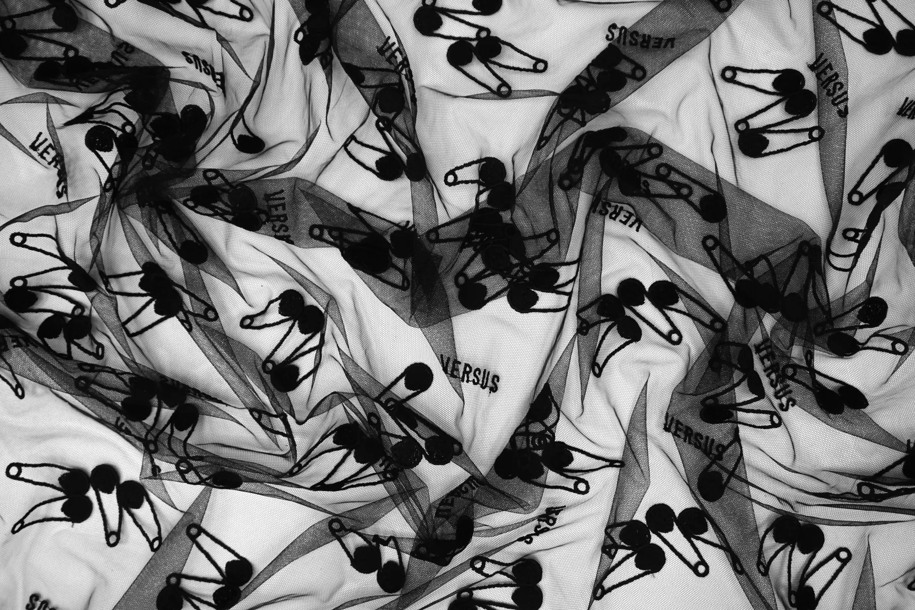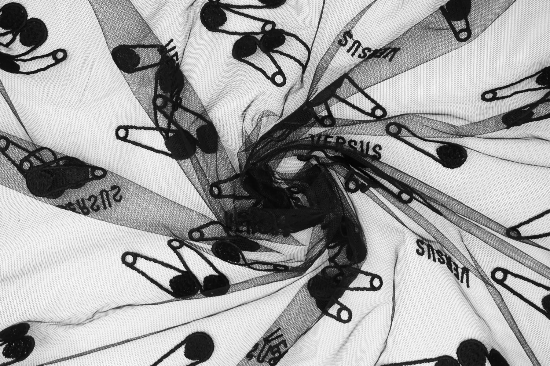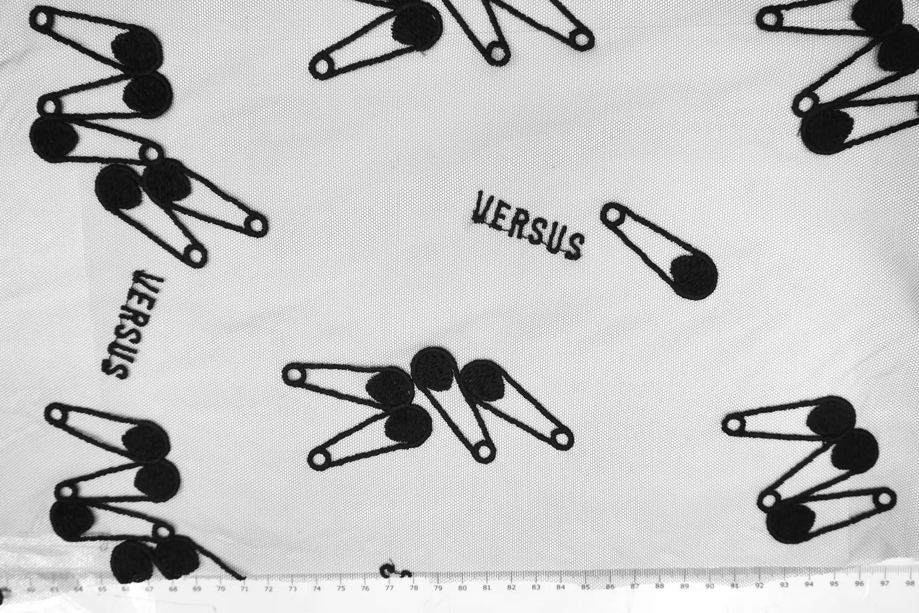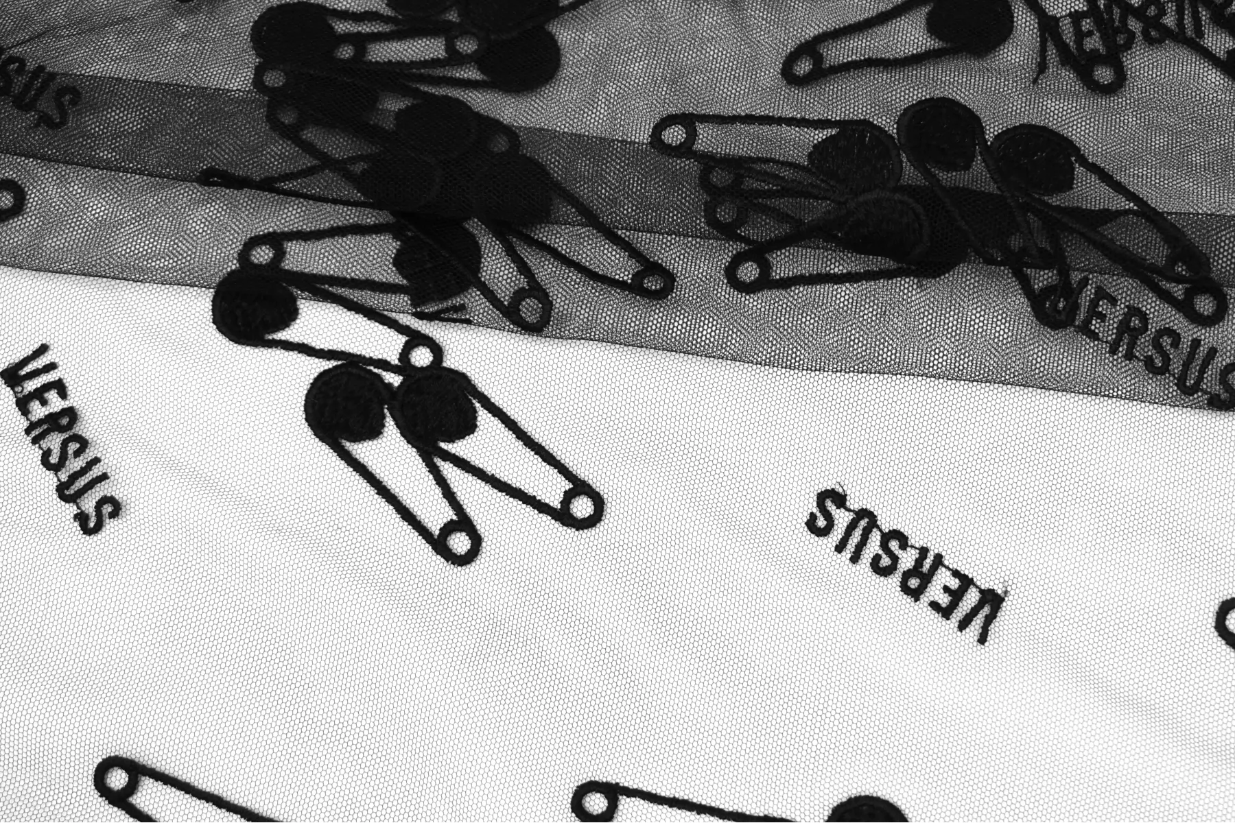 ЦЕНА УКАЗАНА ЗА ОТРЕЗ! (При заказе в метраже указывать 1) Мягкая итальянская сетка черного цвета от VERSACE с вышивкой в виде булавок и надписью VERSUS. Ширина самой сетки 137 см, а вышивки 110 см. Тонкая, пластичная, тянется, приятная тактильно. Хорошо подойдет для пошива и декора одежды и белья.