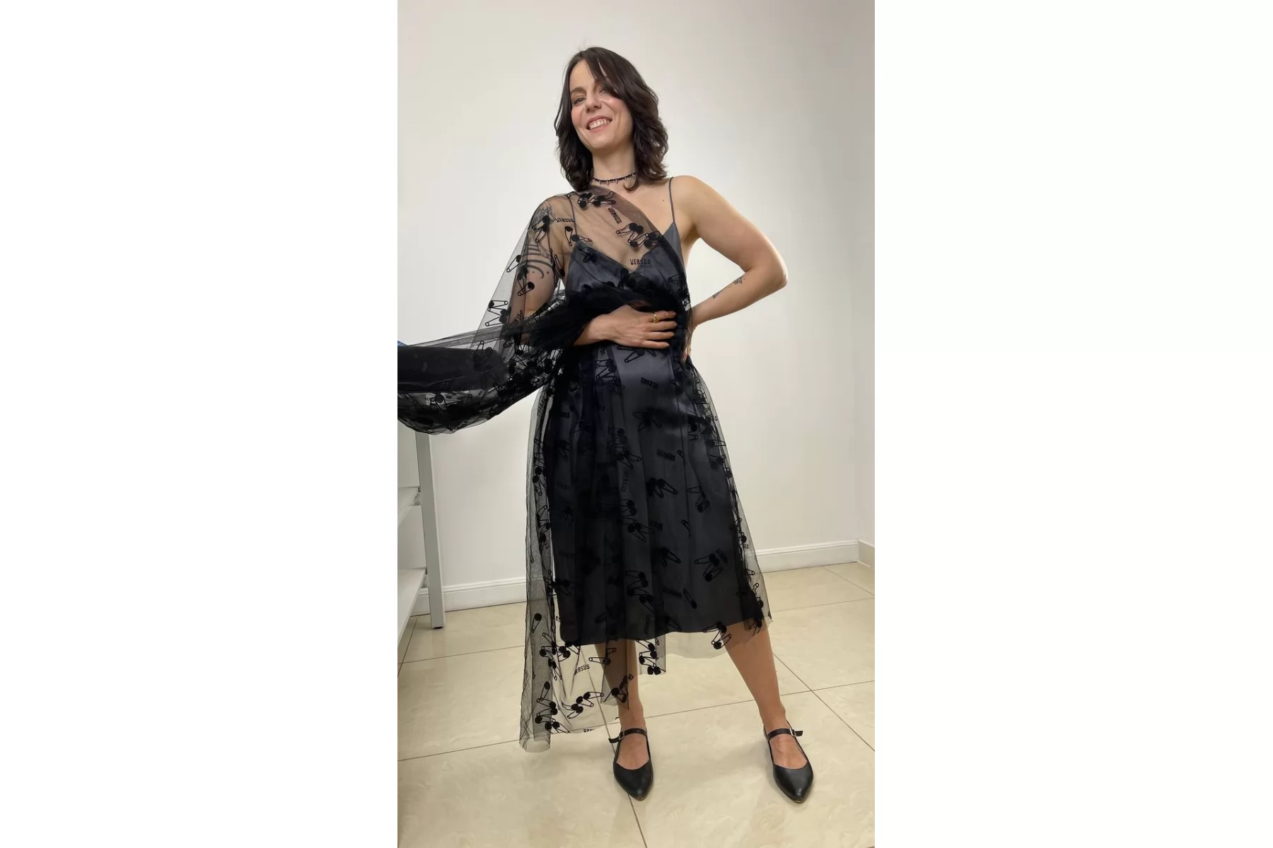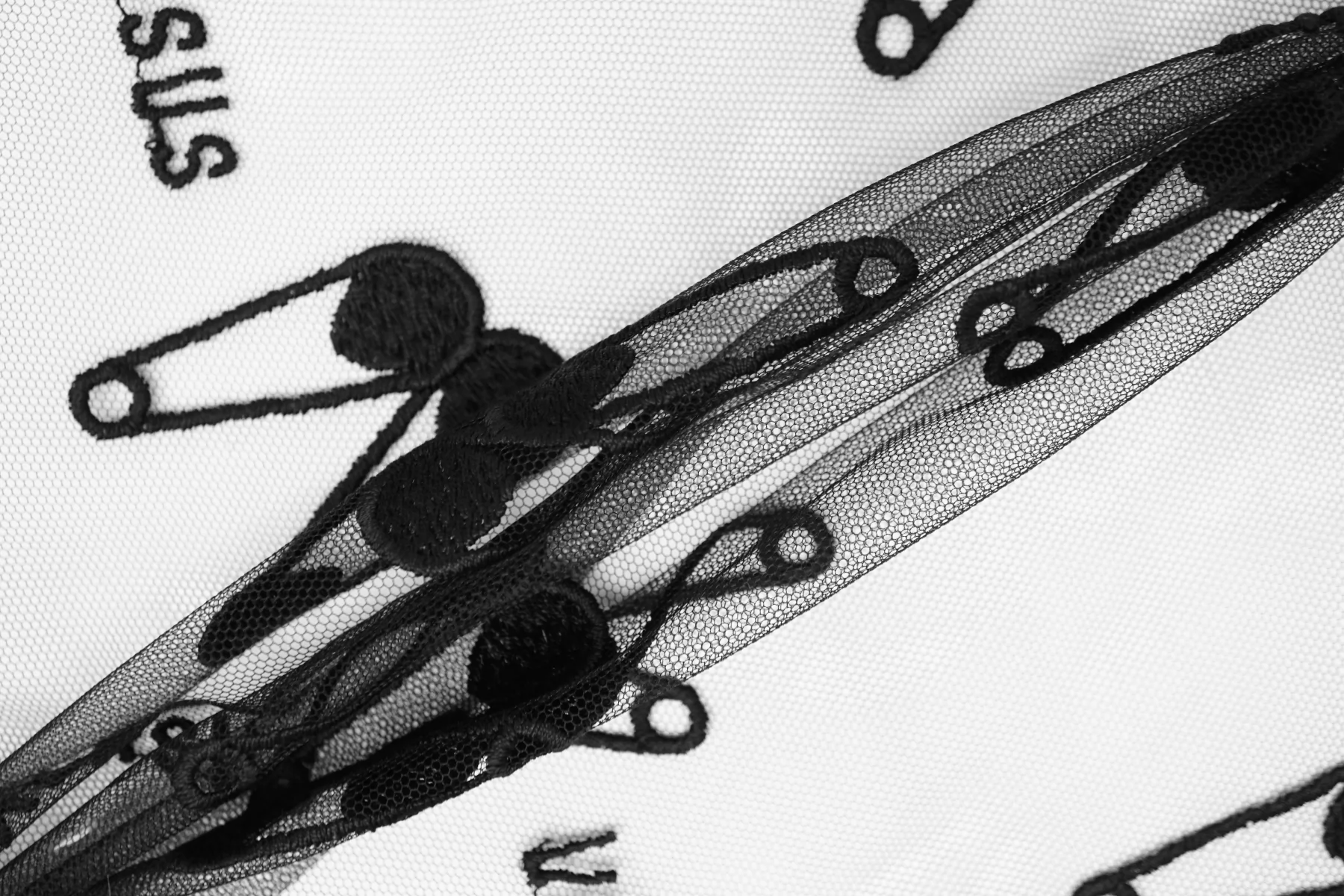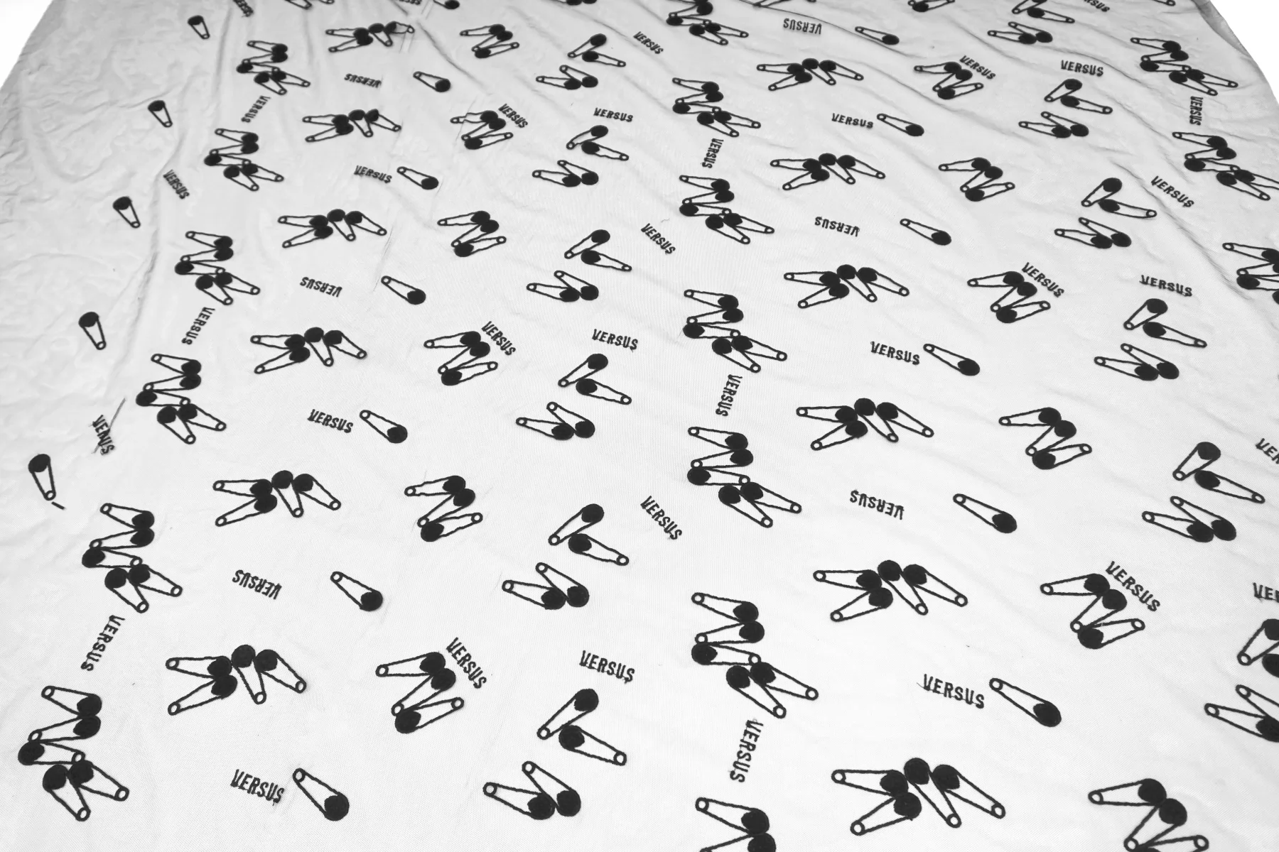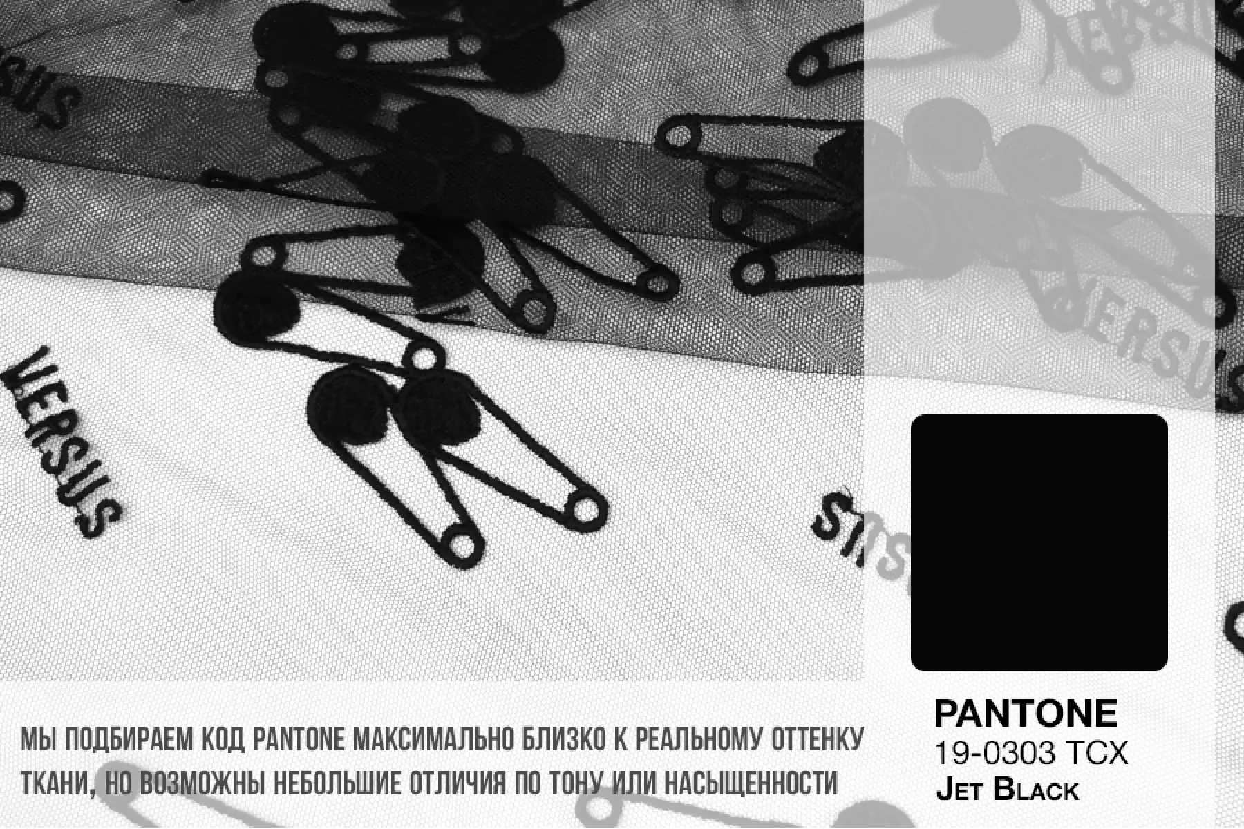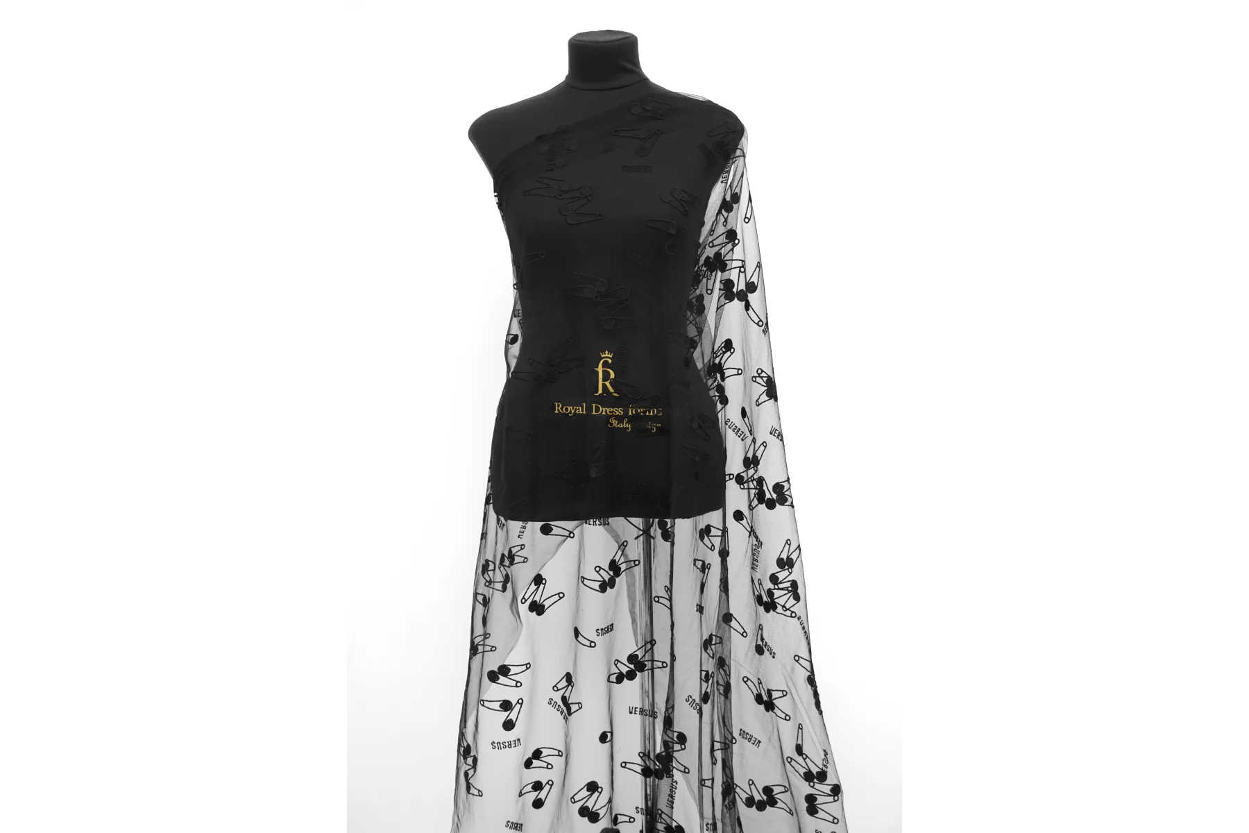 ЦЕНА УКАЗАНА ЗА ОТРЕЗ! (При заказе в метраже указывать 1) Мягкая итальянская сетка черного цвета от VERSACE с вышивкой в виде булавок и надписью VERSUS. Ширина самой сетки 137 см, а вышивки 110 см. Тонкая, пластичная, тянется, приятная тактильно. Хорошо подойдет для пошива и декора одежды и белья.