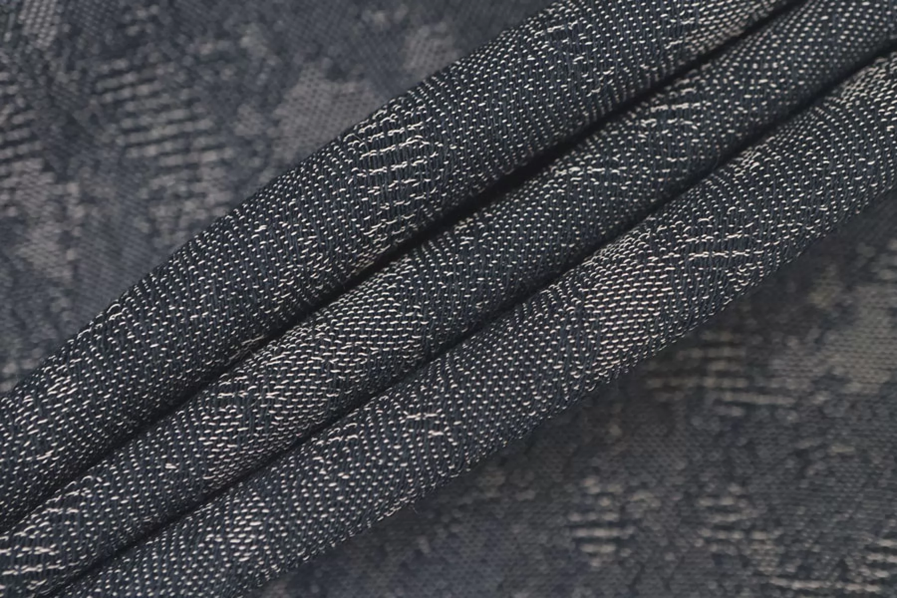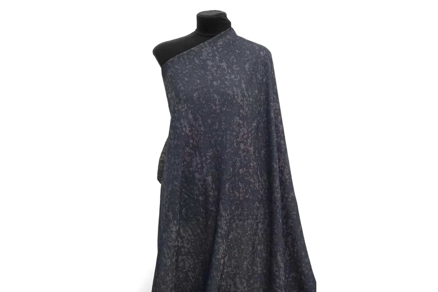 На отрезе зацепка, рваная кромка и стрелка в 40 см. от края! Шикарная жаккардовая шерсть с вискозой плательной плотности припыленно-синего оттенка. Тактильно шероховатая, тонкая. Немного колется. Просвечивает. Немножко тянется плетение. Не мнется. Шерсть красива в своей пластике. Хорошо драпируется, но форму не держит. Вариант на теплые рубашки, платья, юбки и не только. Уход за шерстью деликатный.