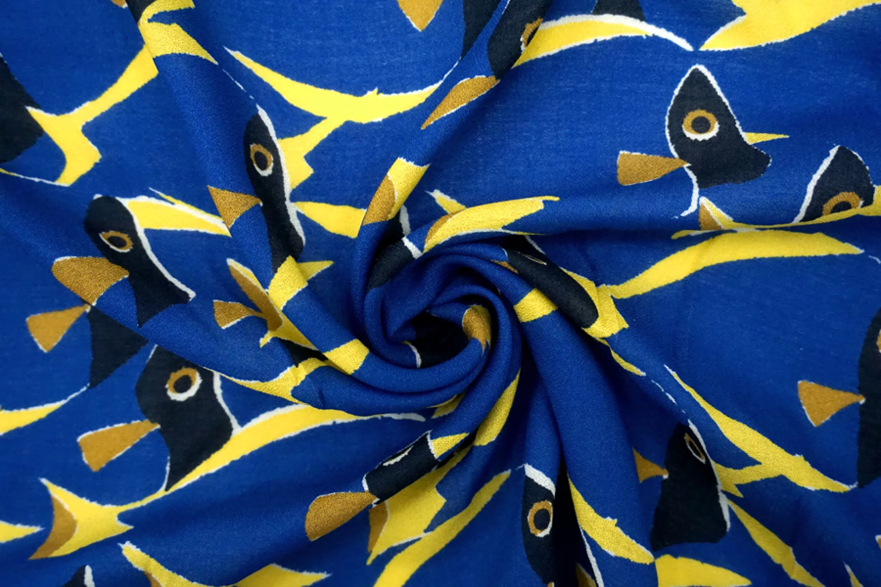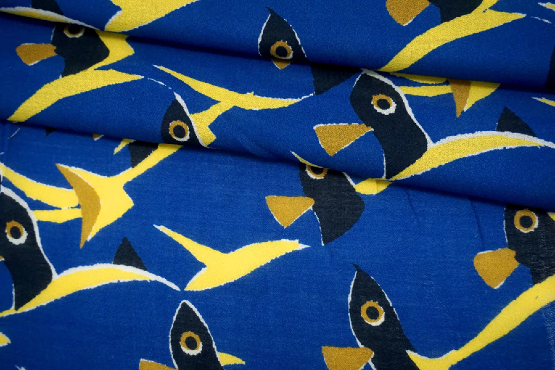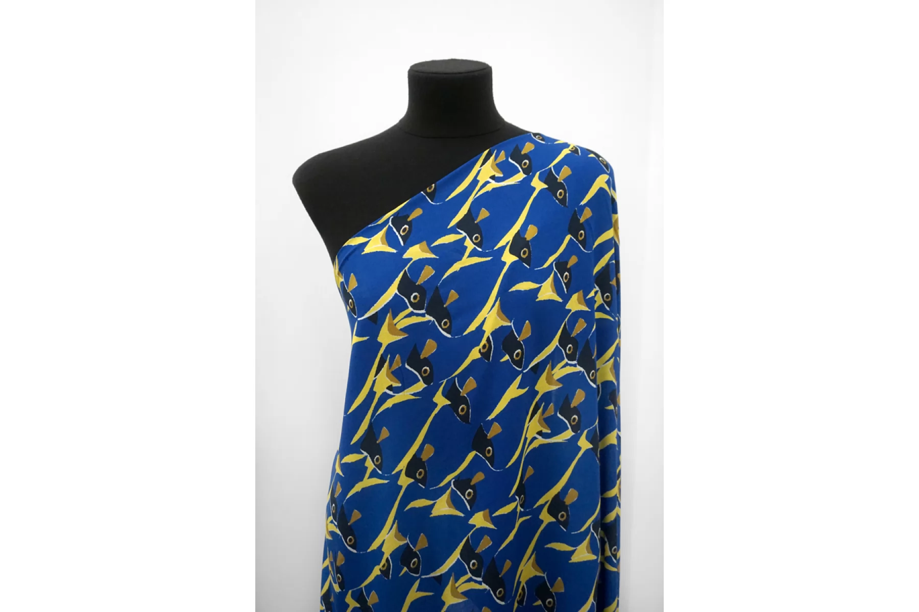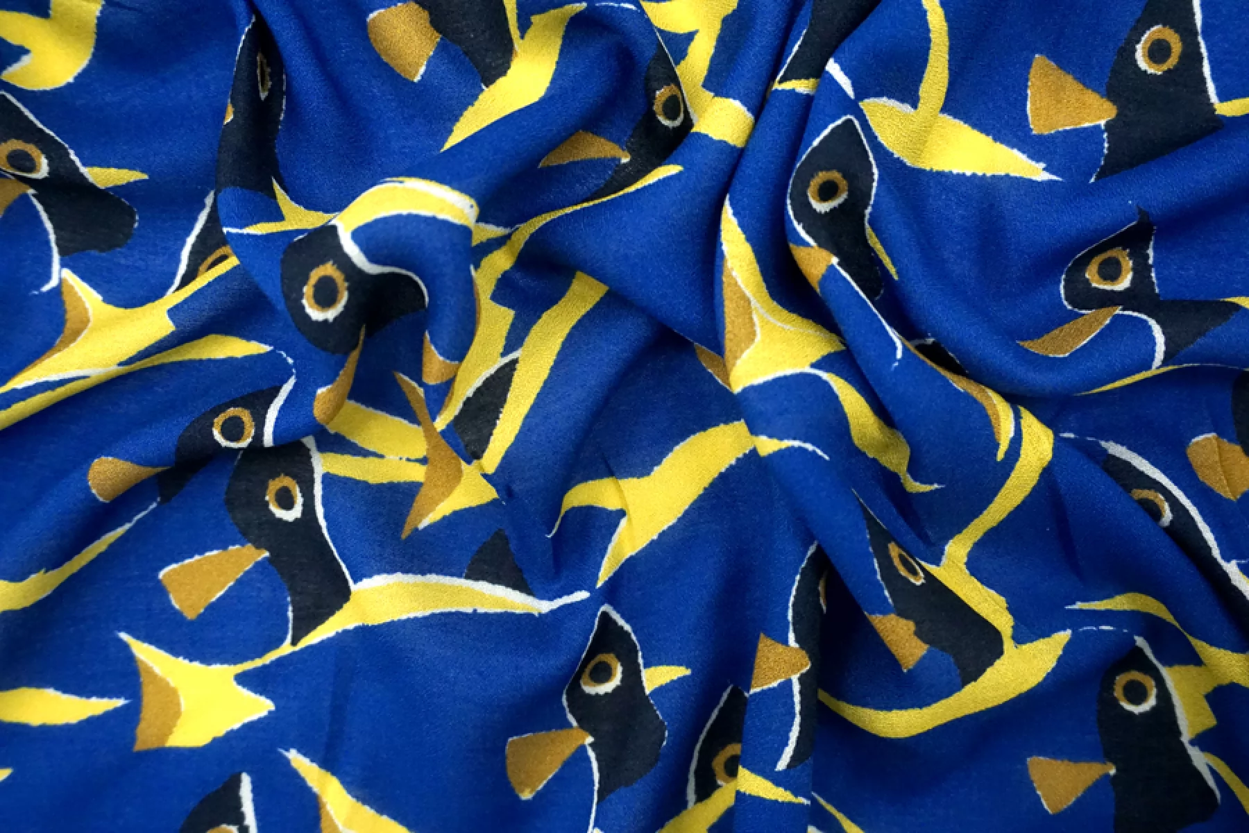 ВНИМАНИЕ!! На синем фоне изредка встречаются темно-синие точки. Итальянский вискозный креп-шифон с принтом - синие рыбы с желтыми плавниками. Просвечивает, пластичный, легкий, тактильно сухой, немного тянется благодаря плетению. Подойдет для пошива блузки, туники, платья, юбки (на подкладе или многослойной). ВНИМАНИЕ! На синем фоне изредка встречаются темно-синие точки.