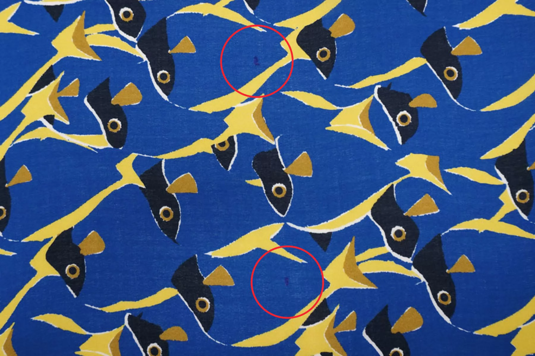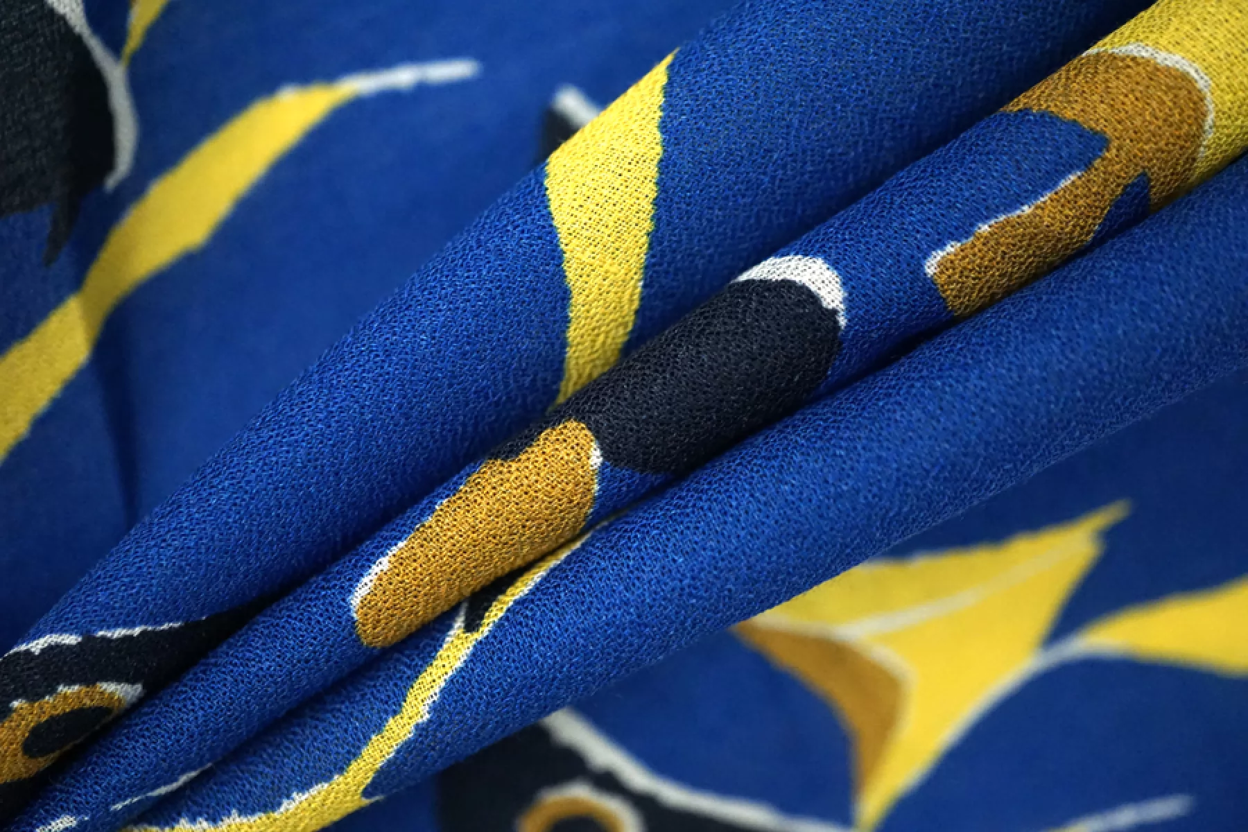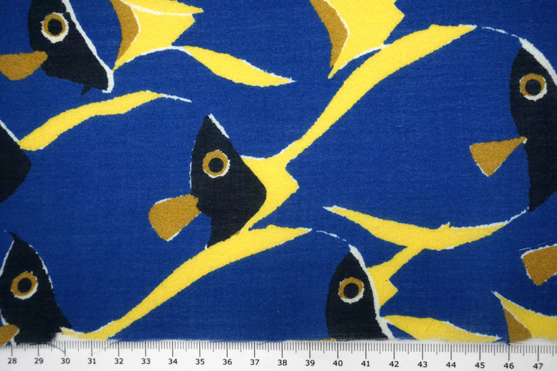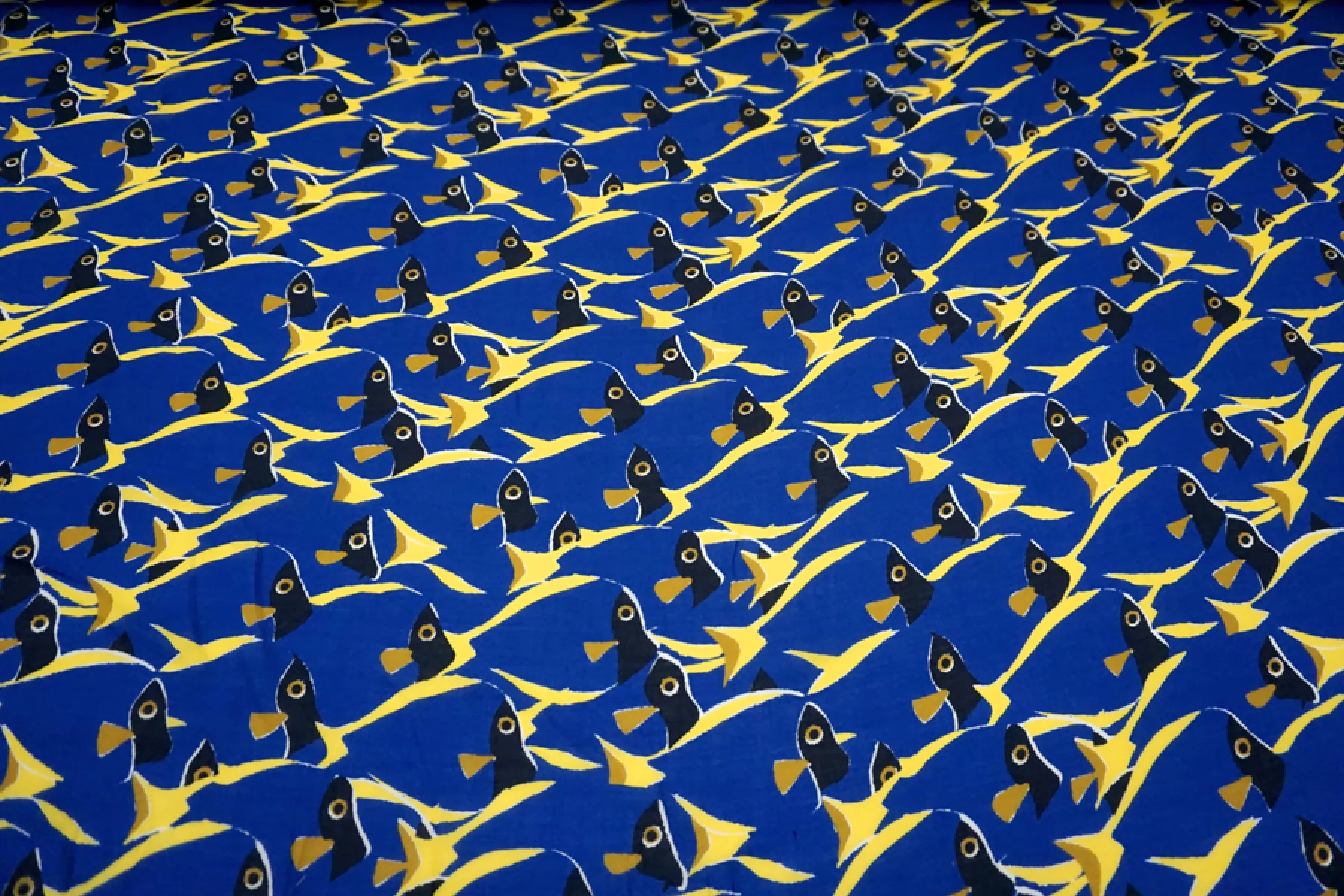 ВНИМАНИЕ!! На синем фоне изредка встречаются темно-синие точки. Итальянский вискозный креп-шифон с принтом - синие рыбы с желтыми плавниками. Просвечивает, пластичный, легкий, тактильно сухой, немного тянется благодаря плетению. Подойдет для пошива блузки, туники, платья, юбки (на подкладе или многослойной). ВНИМАНИЕ! На синем фоне изредка встречаются темно-синие точки.