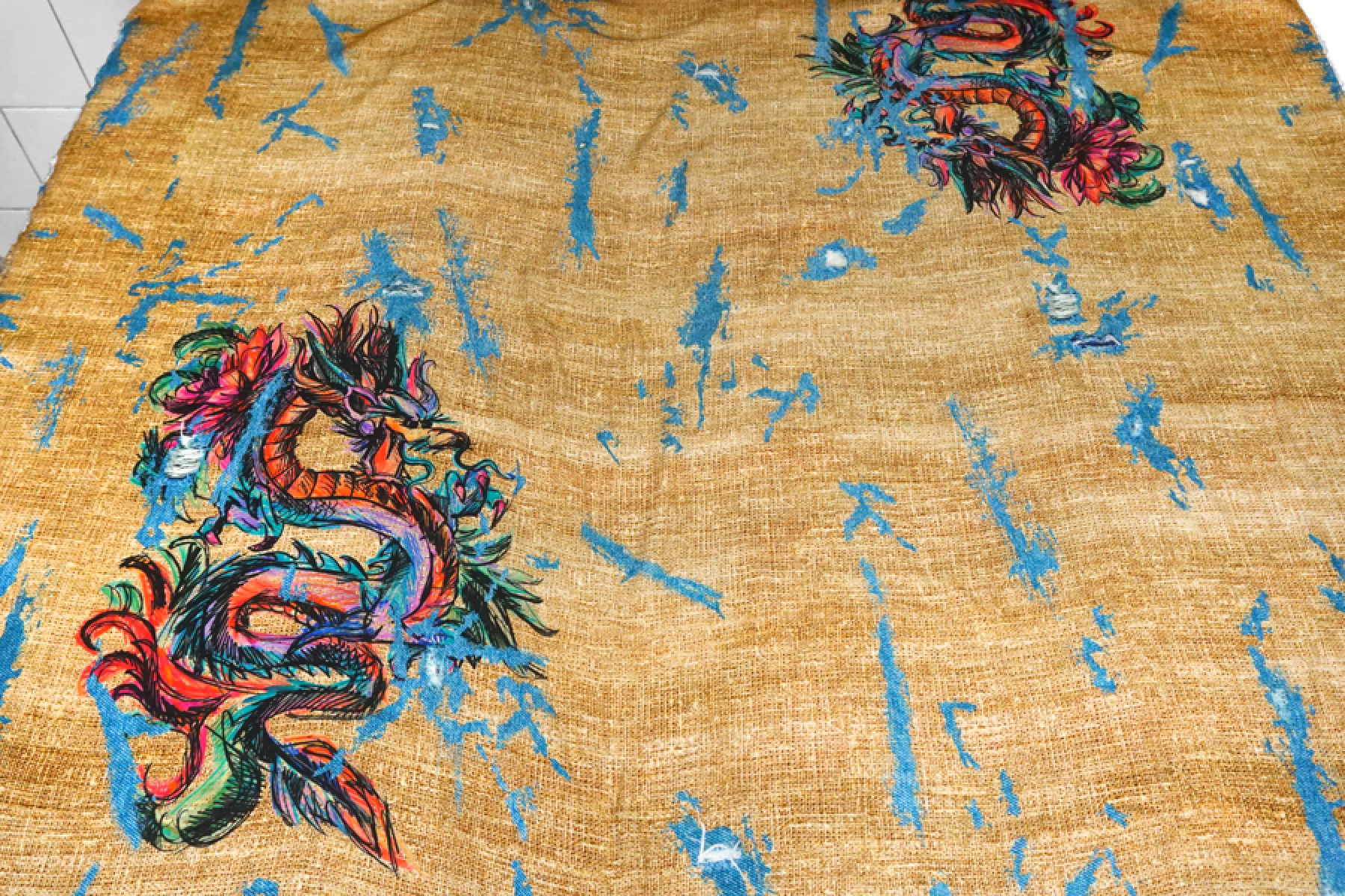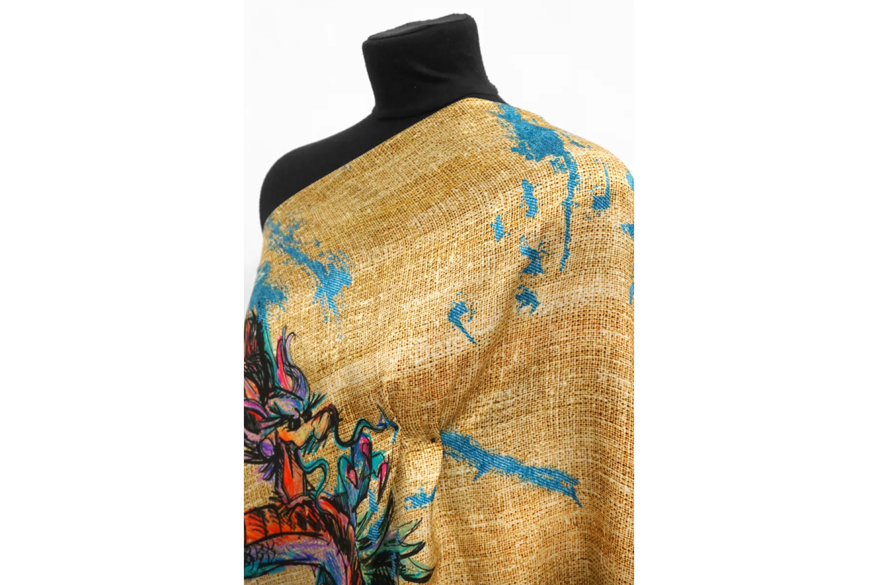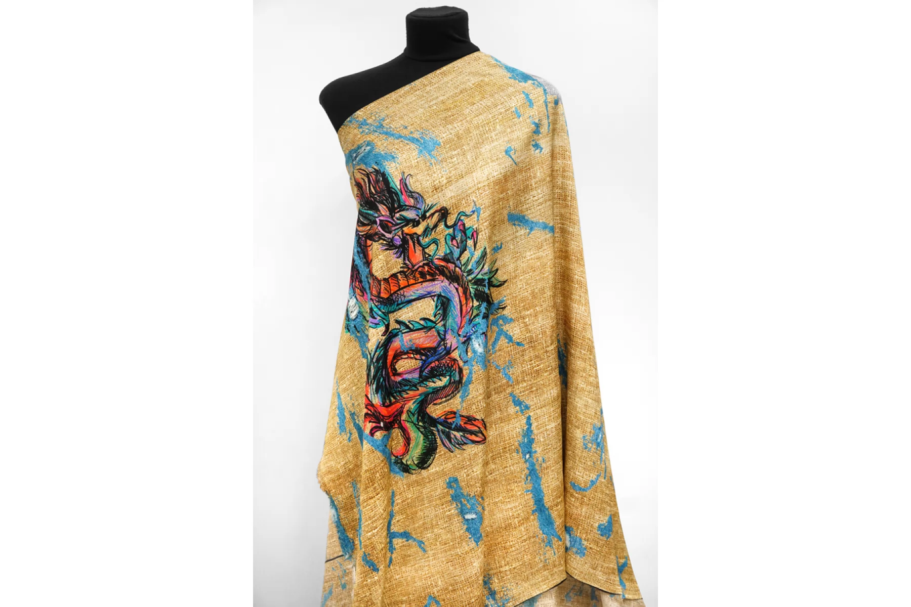 На отрезе маленькое пятнышко, в 20 см. от кромки. На лицо еле заметное! Ткань купонная, длина купона 158 см, цена за купон - 2.986 руб. Атласная вискоза DOLCE & GABANNA с купонным принтом имитирующем соломенное плетение и двумя красными драконам, с эффектами состаривания. Скользящий, мягкий материал, тактильно очень приятный. Сминается, но не слишком сильно. Не тянется. Не просвечивает, довольно плотная. Красиво струится и смотрится в складке и пластике. Отлично подойдет на кимоно, костюмы, платья, юбки, блузки и одежду в бельевом стиле. При необходимости используйте подкладочный материал. Обязательно учитывайте усадку 5-10%.
