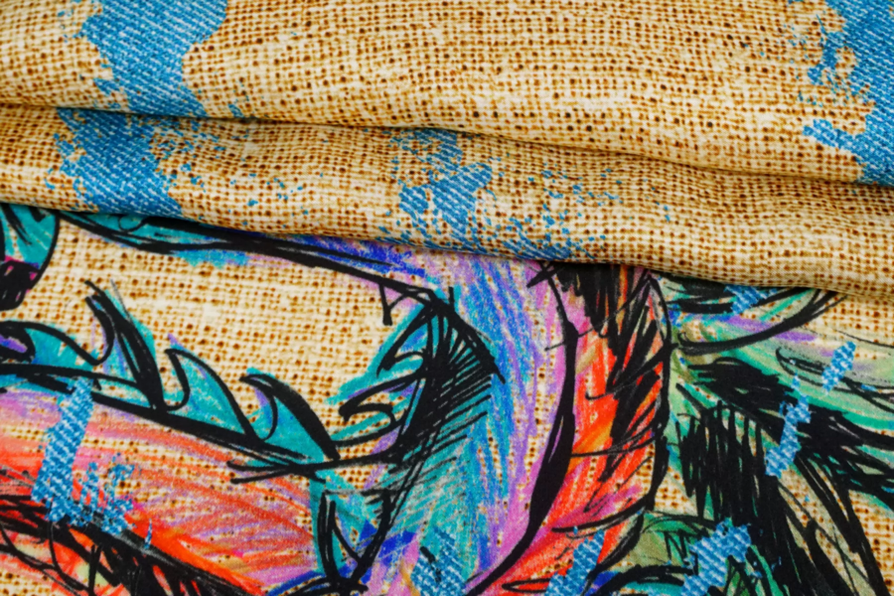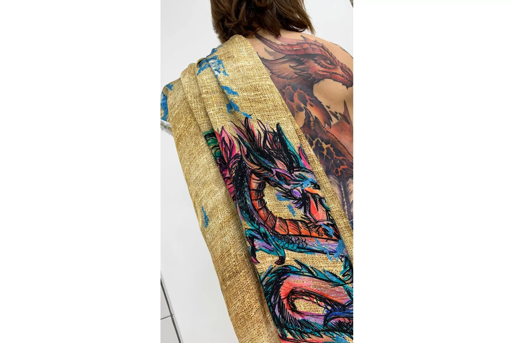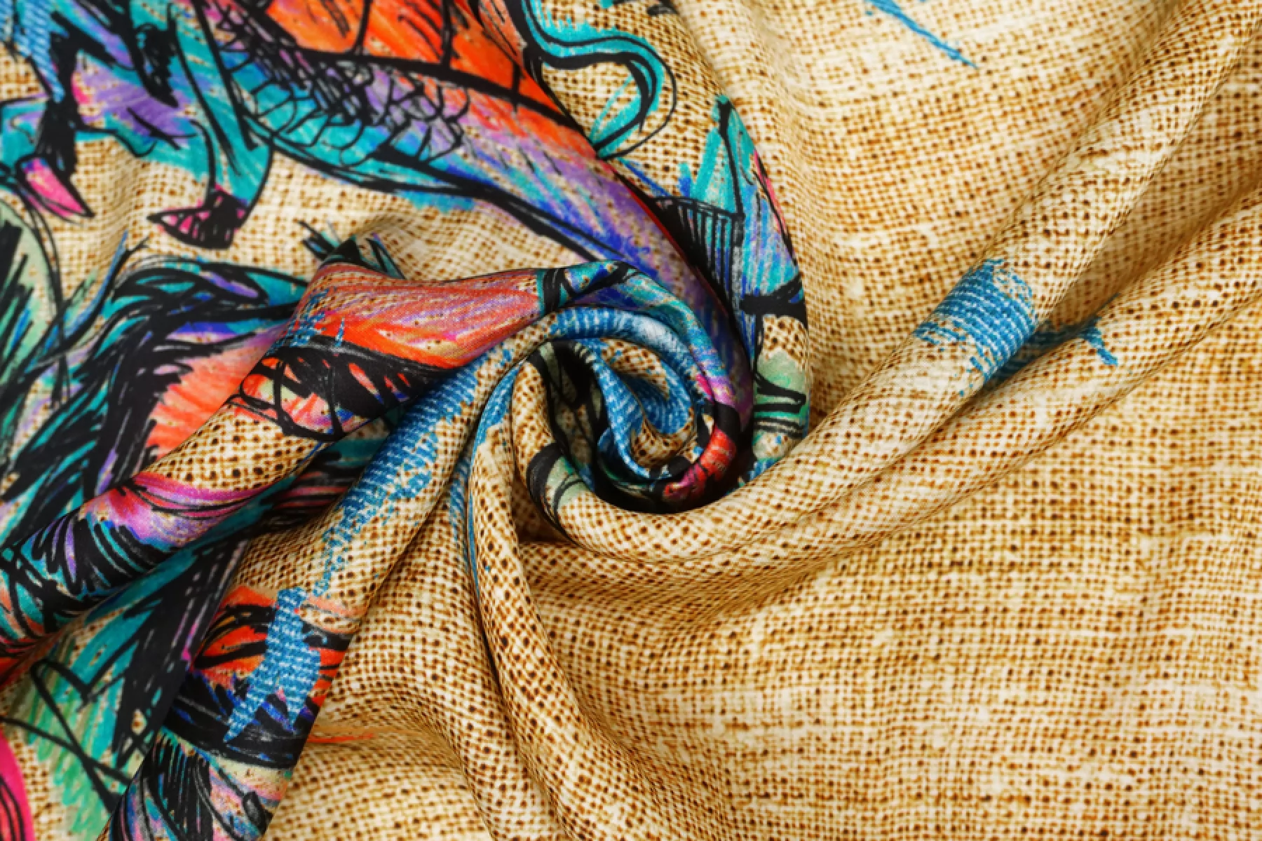 На отрезе маленькое пятнышко, в 20 см. от кромки. На лицо еле заметное! Ткань купонная, длина купона 158 см, цена за купон - 2.986 руб. Атласная вискоза DOLCE & GABANNA с купонным принтом имитирующем соломенное плетение и двумя красными драконам, с эффектами состаривания. Скользящий, мягкий материал, тактильно очень приятный. Сминается, но не слишком сильно. Не тянется. Не просвечивает, довольно плотная. Красиво струится и смотрится в складке и пластике. Отлично подойдет на кимоно, костюмы, платья, юбки, блузки и одежду в бельевом стиле. При необходимости используйте подкладочный материал. Обязательно учитывайте усадку 5-10%.