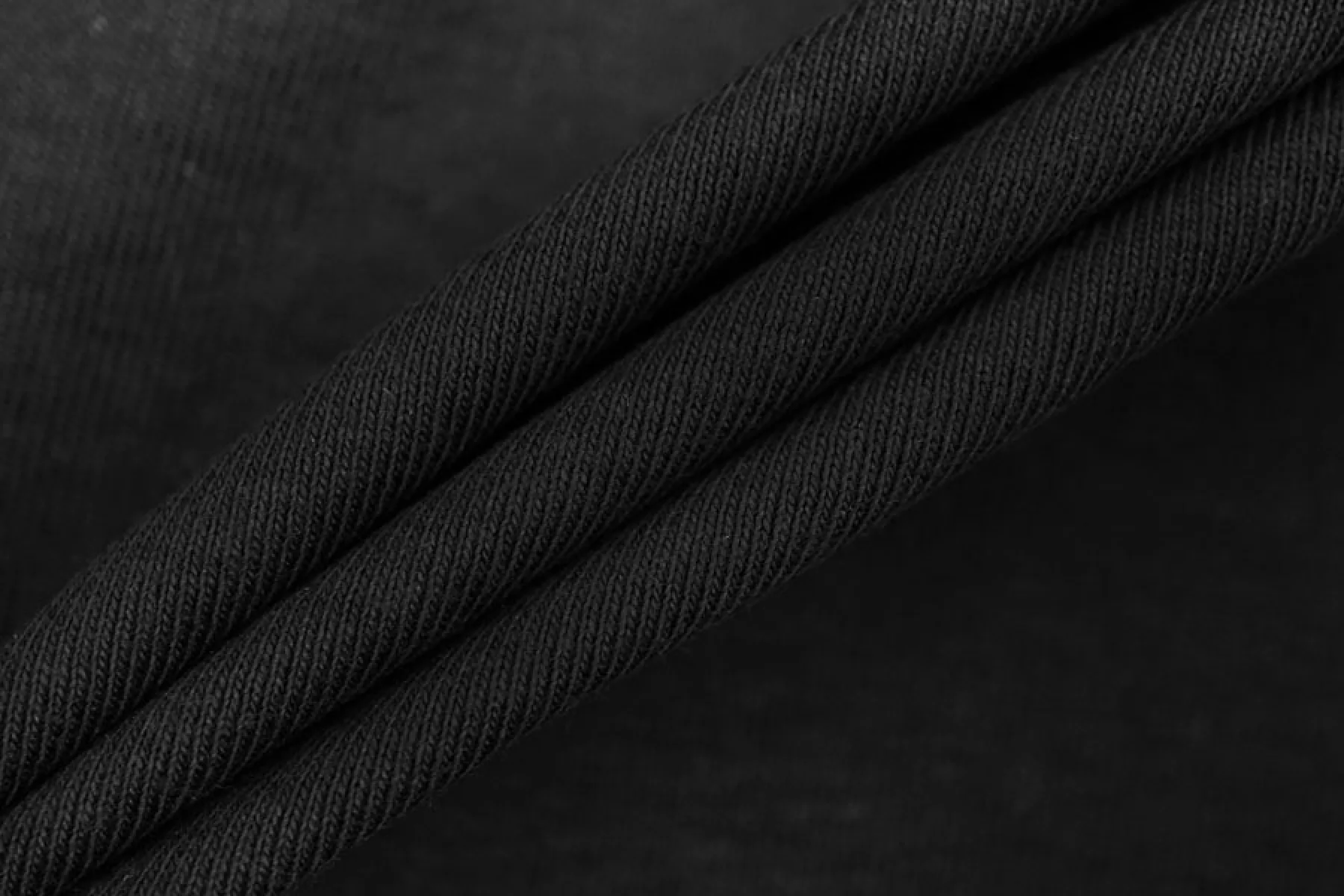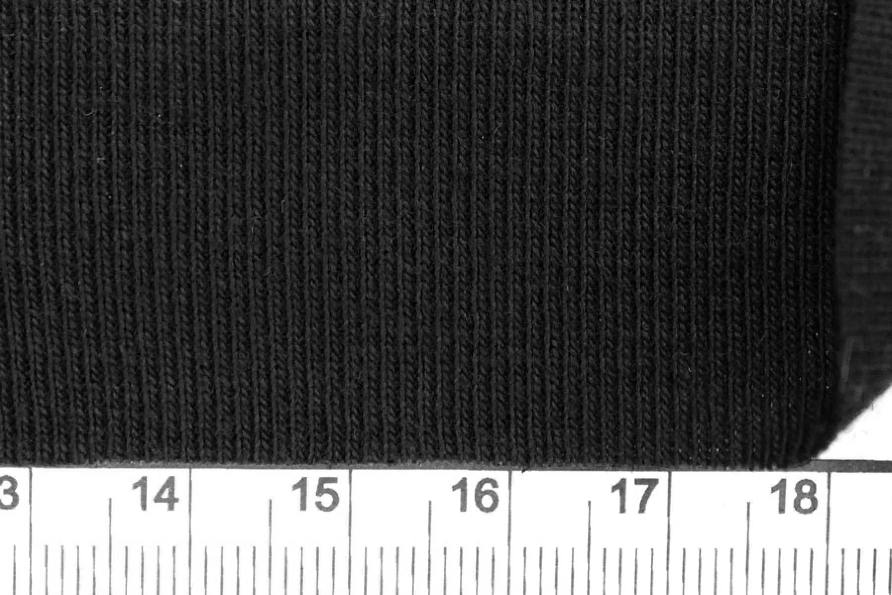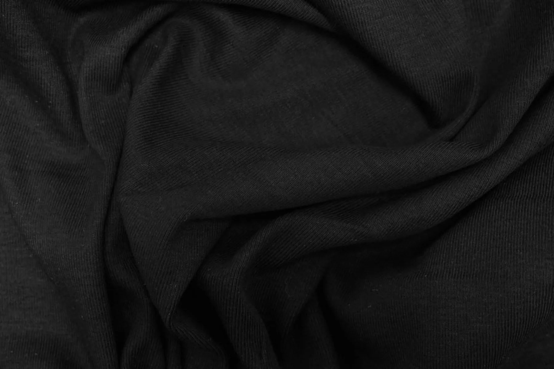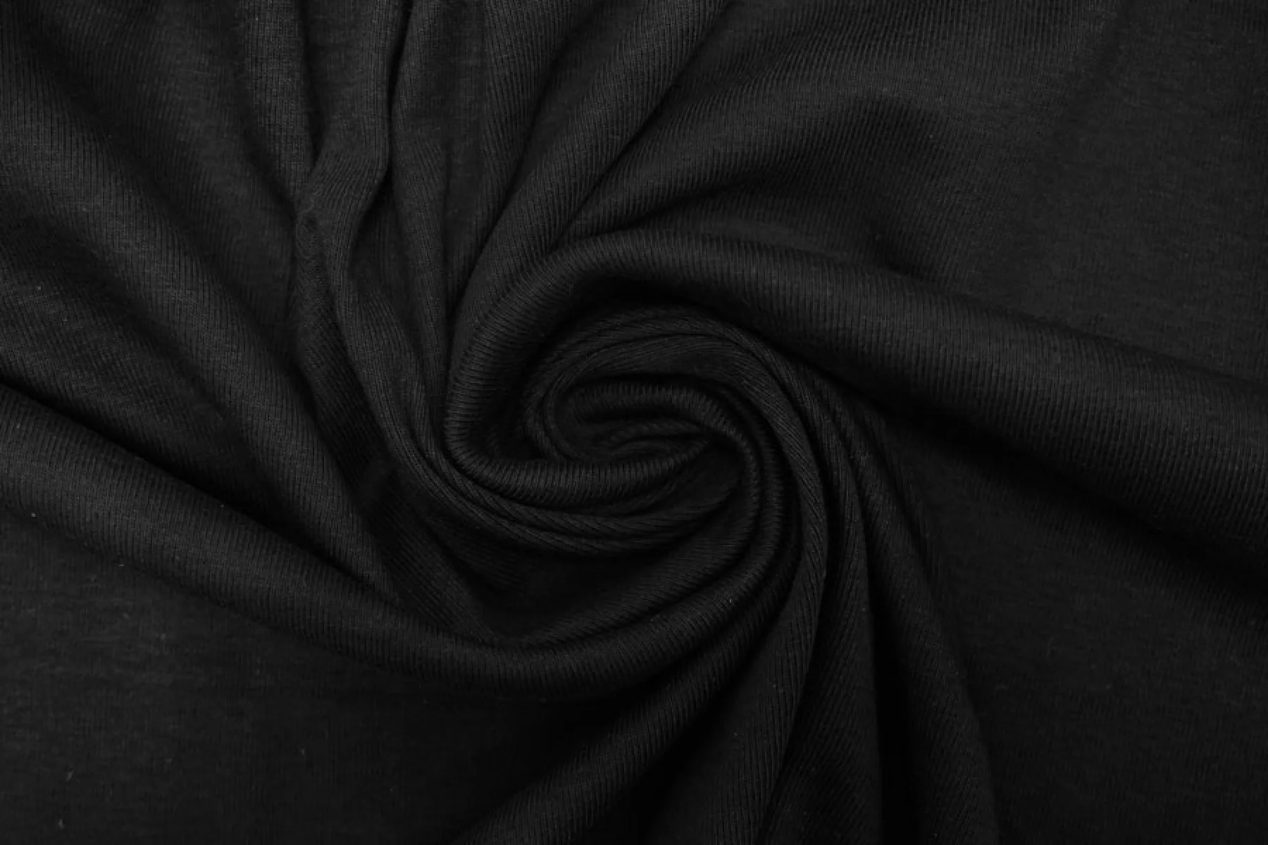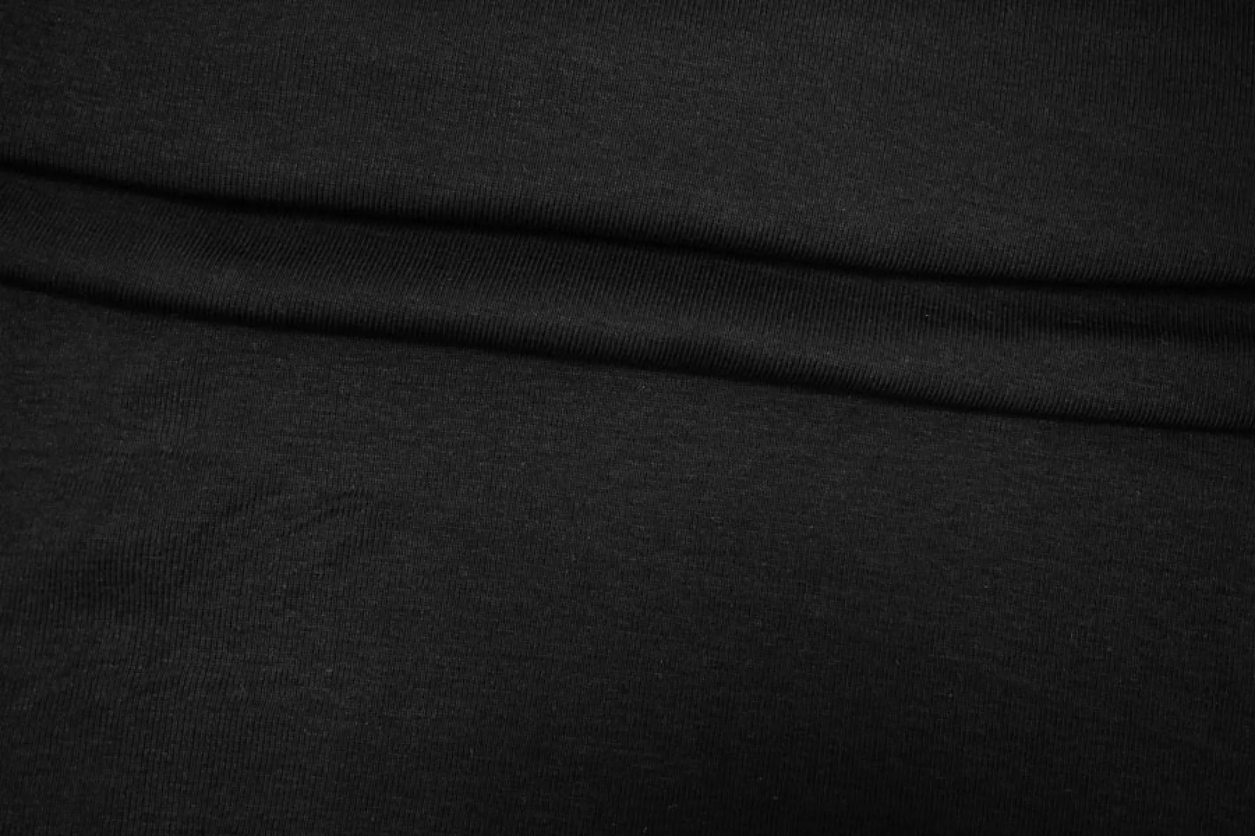 ЦЕНА УКАЗАНА ЗА ОТРЕЗ! (При заказе в метраже указывать 1) Итальянский хлопковый трикотаж в черном цвете, по вязке между рибаной и кашкорсе. Материал пластичный, мягкий, гладкий. Средней плотности. Мнется слабо, просвечивает при растяжении. Хорошо тянется. Подойдет для пошива майки, футболки, топа.
