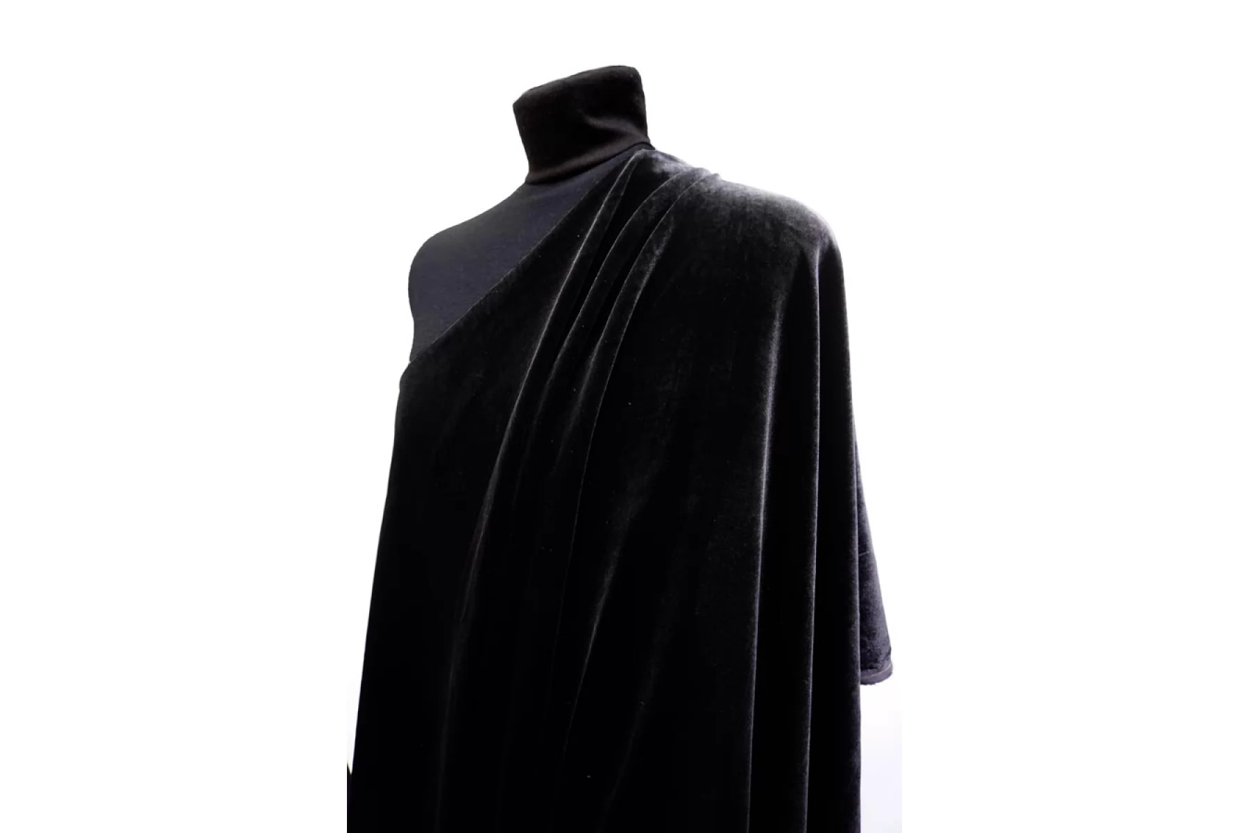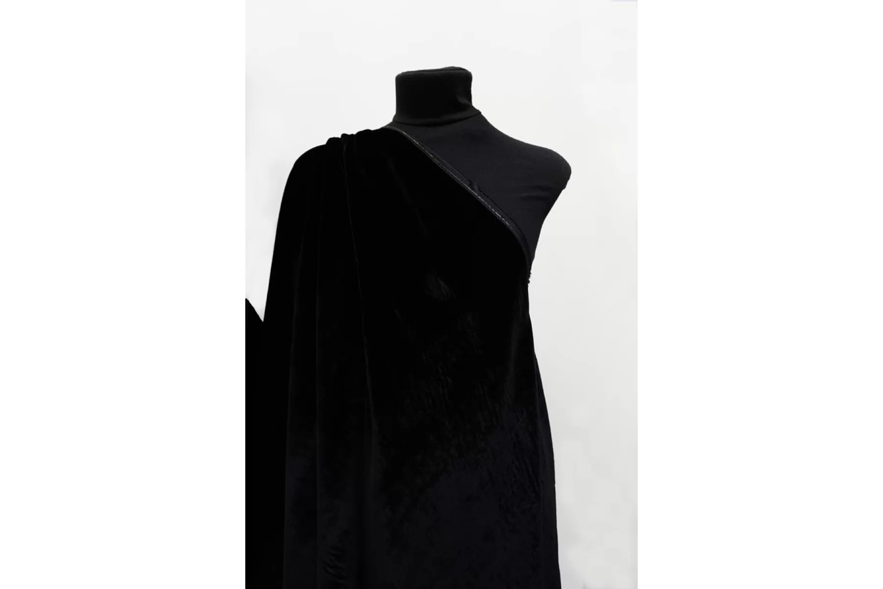 ЦЕНА УКАЗАНА ЗА ОТРЕЗ! (При заказе в метраже указывать 1) ВНИМАНИЕ! Присутствуют белесые полосы на полотне, заметно только под определенным углом и освещением. см. последнее фото. Шикарный вискозный бархат на шелковой основе в глубоком чёрном цвете. Ворс достаточно короткий, а сам материал тонкий, но пластичный. Тактильно приятный, мягкий. Совсем немного виден силуэт насквозь, но в изделии заметно не будет. Красиво выглядит в драпировках и обладает прекрасным лоском. Не тянется. Подойдет на платья, юбки, мягкие жакеты и не только. При необходимости используйте подкладочный материал. Уход деликатный.