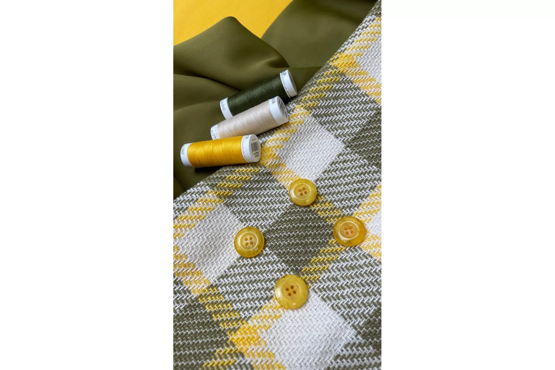 ЦЕНА УКАЗАНА ЗА ОТРЕЗ! (При заказе в метраже указывать 1) Хлопковый твид-шанель в клетку из переплетения нитей оттенков молочного, оливкового и желтого. Тактильно материал мягкий, ощущается фактура плетения - слегка рыхловатое. Не тянется. Совсем слегка просвечивает силуэт, если смотреть прямо на просвет. Неплохо держит форму. Сминается, но восстанавливается практически полностью . Классный вариант на облегченные пальто, жакеты, костюмные варианты.