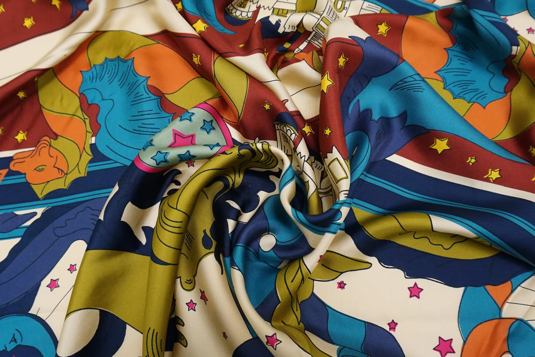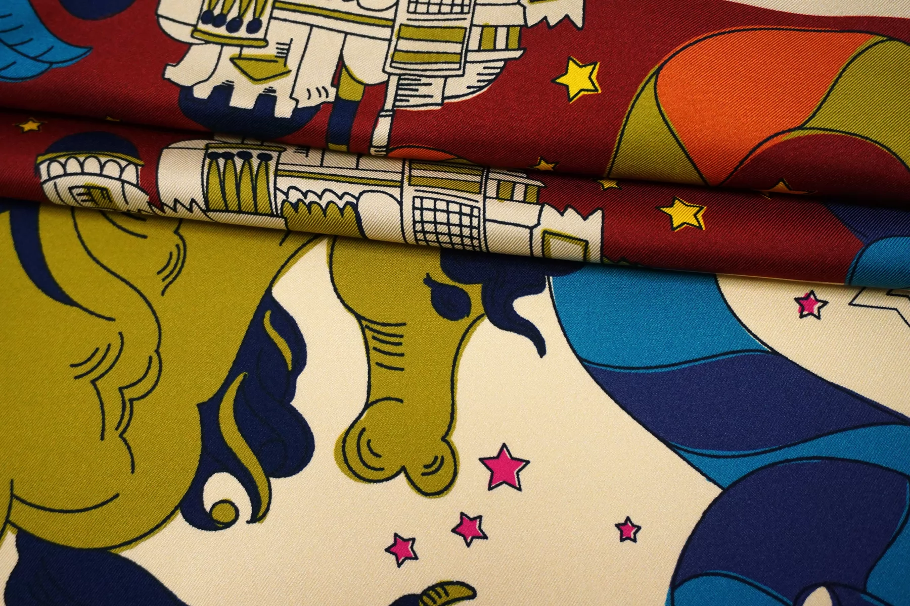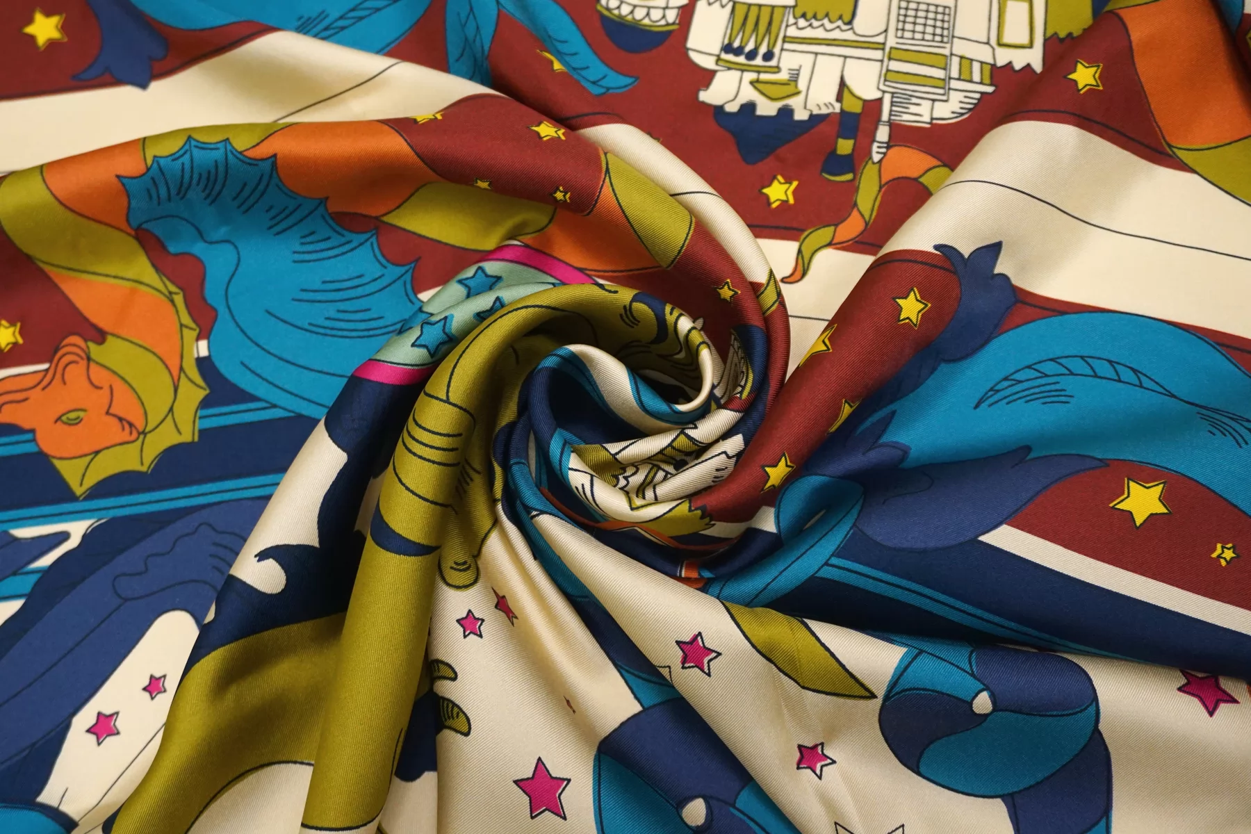 ЦЕНА УКАЗАНА ЗА ОТРЕЗ! (При заказе в метраже указывать 1) Второй купон не полный! ВНИМАНИЕ! Ткань продаётся по купонам, длина купона 88 см, цена за купон -4 440 руб. Твиловый шёлк от Max Mara с ярким фантазийным принтом в виде морских коньков. Очень приятный и мягкий, гладкий. Достаточно плотный, пластичный, струящийся, легкий. Обладает красивым шелковым лоском. Не тянется. Не просвечивает. Не мнется. Форму не держит, но красиво смотрится в драпировке. Прекрасный легкий вариант на блузки, платья и юбки. Уход за шёлком деликатный.