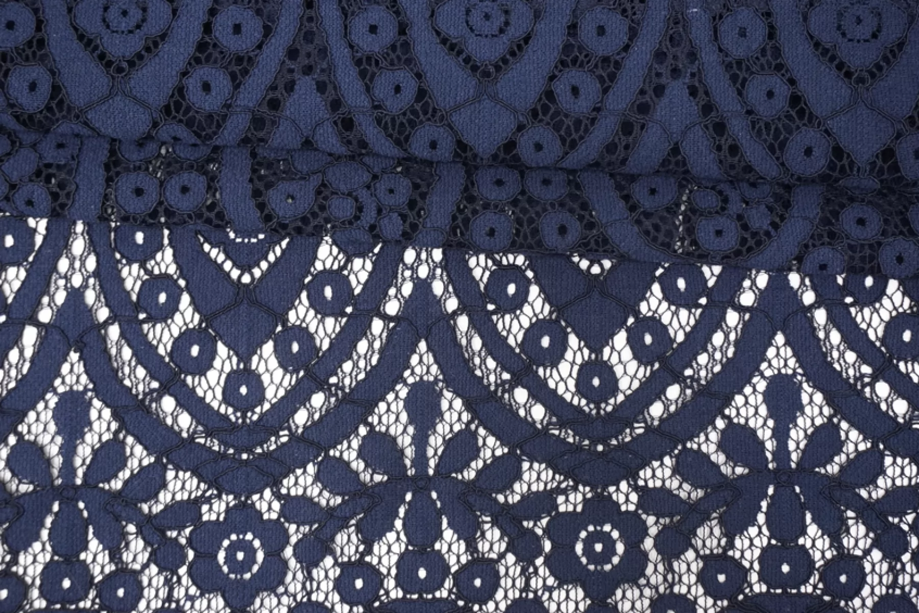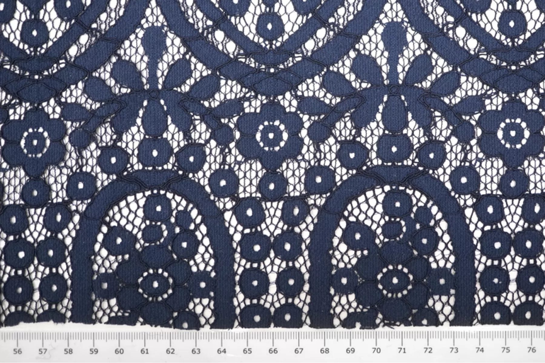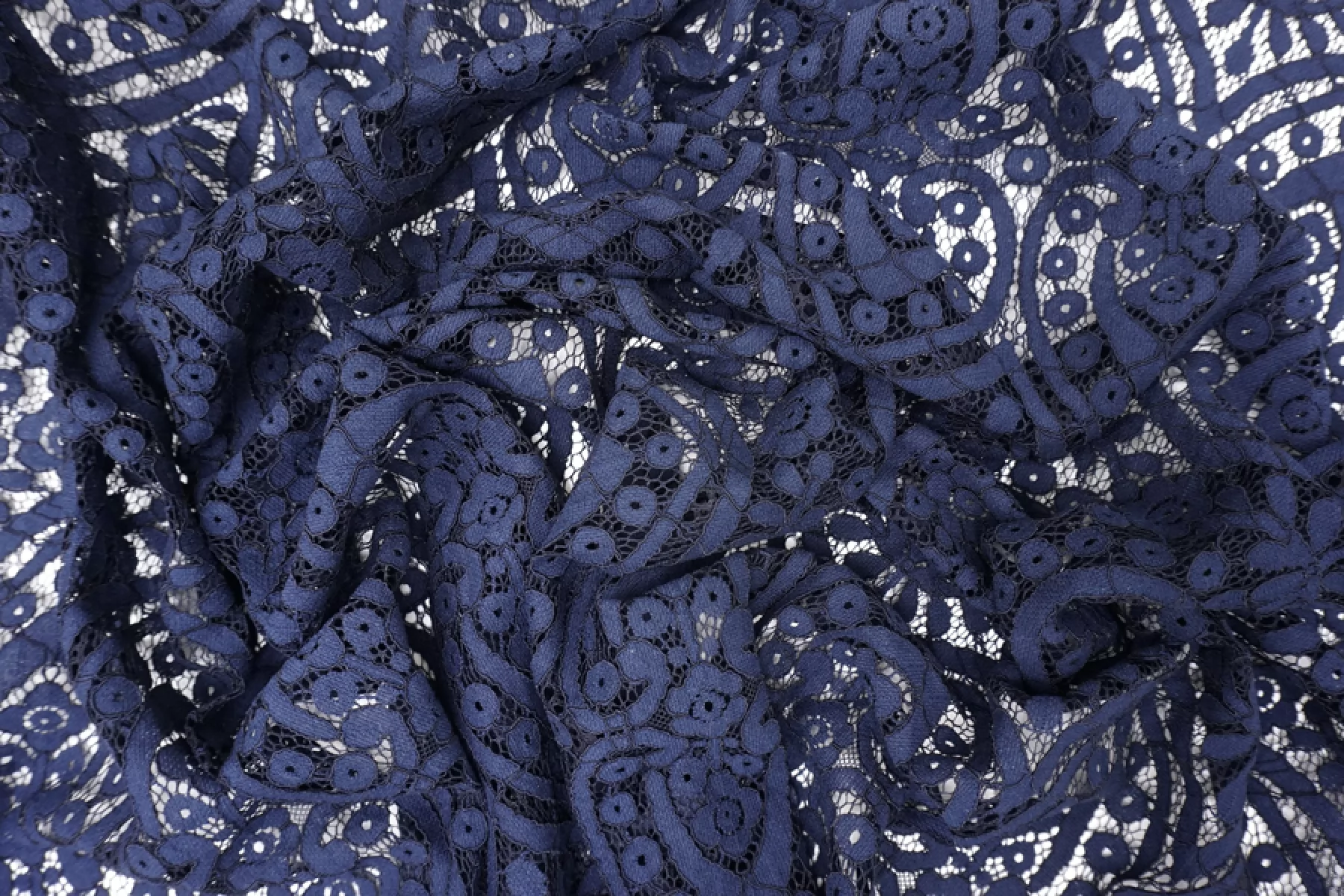 ЦЕНА УКАЗАНА ЗА ОТРЕЗ! (При заказе в метраже указывать 1) Итальянское хлопковое кружево глубокого синего оттенка с цветочно-орнаментальной выработкой. Основа материала из нейлона с выработанными элементами из хлопка, которые по контуру обработаны более объемной нитью с красивым лоском. Элементы среднего размера. Смотрится красиво! Тактильно материал приятный, ощущается фактура. Подойдет для пошива нарядного самостоятельного изделия (на подкладе ) или отделки отдельных элементов одежды.