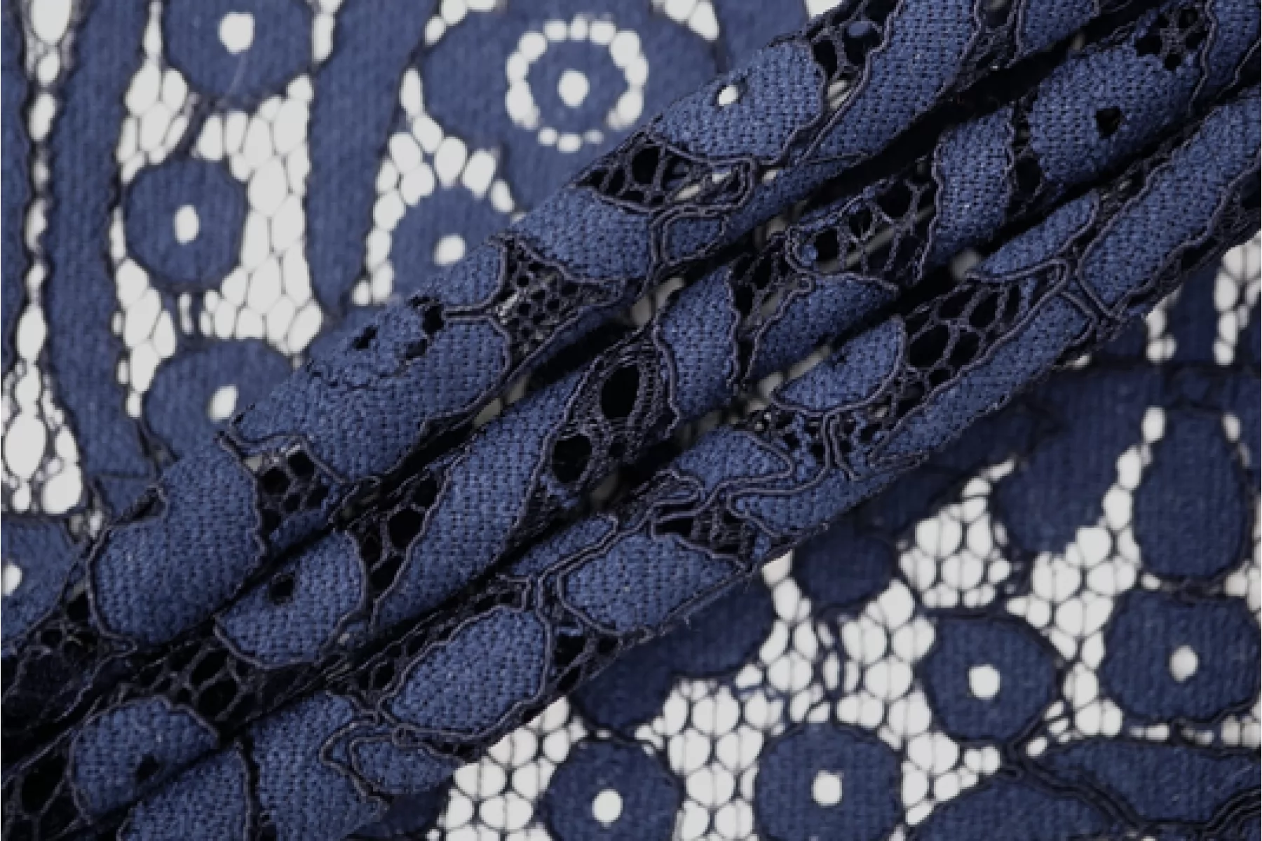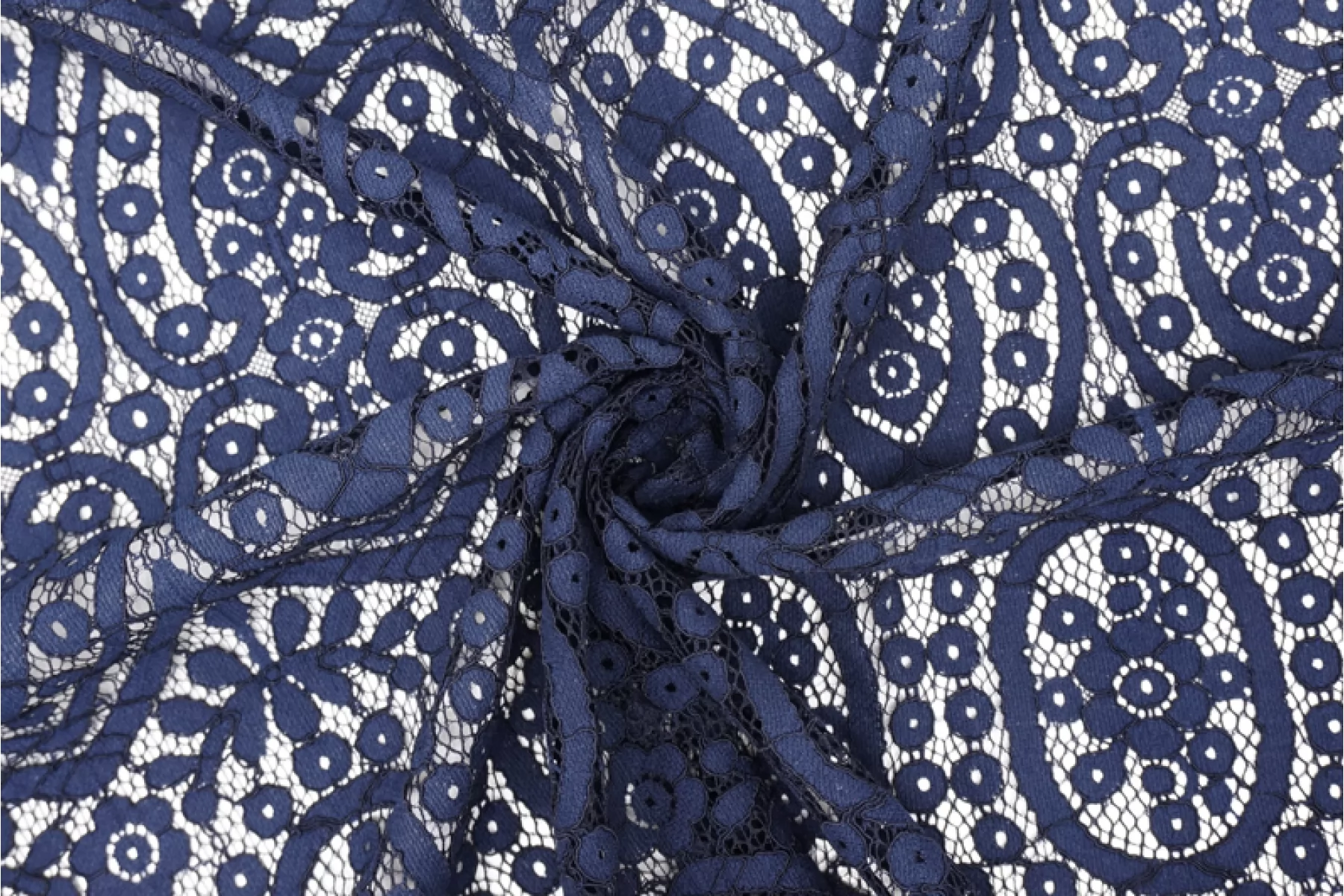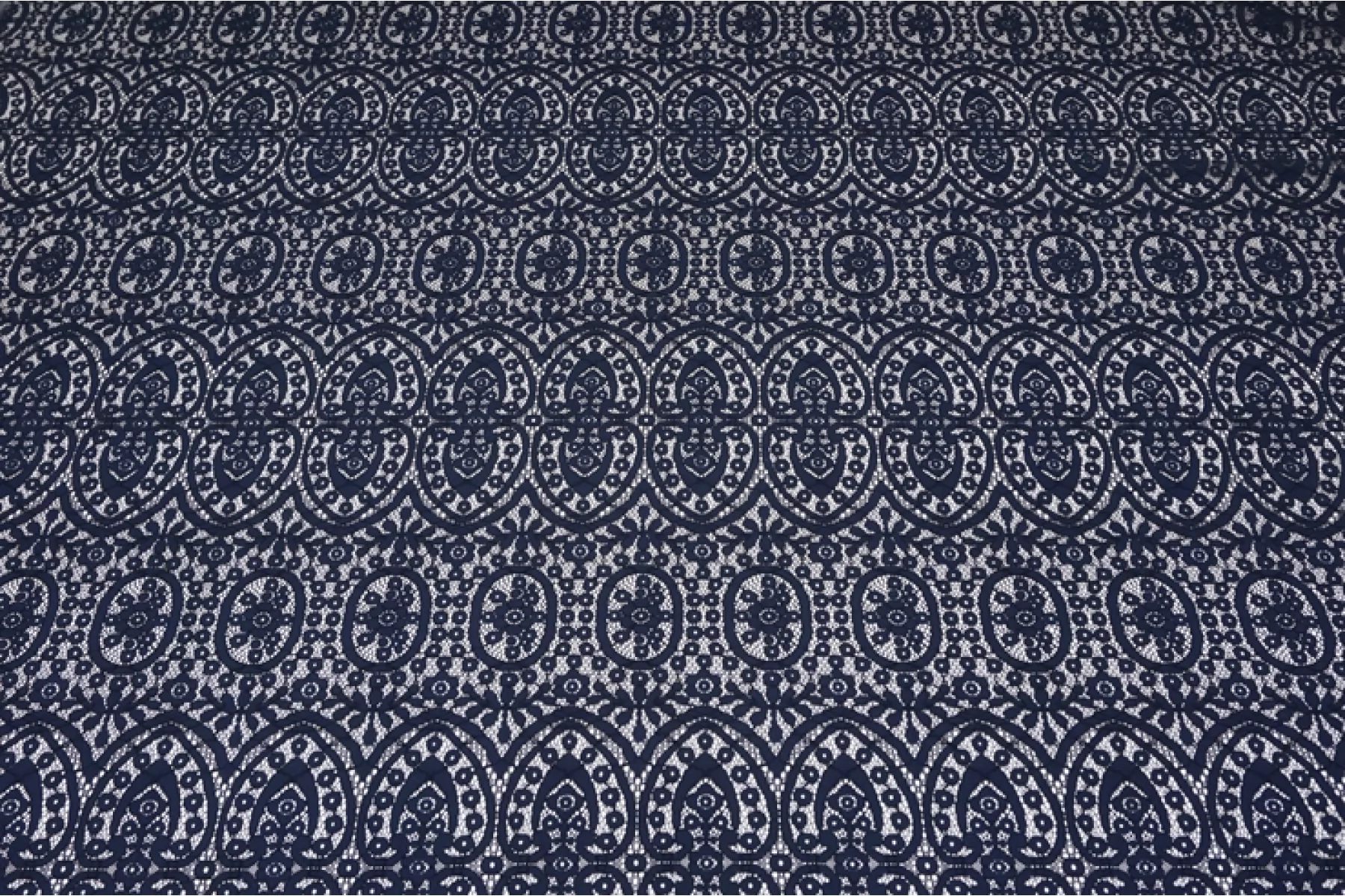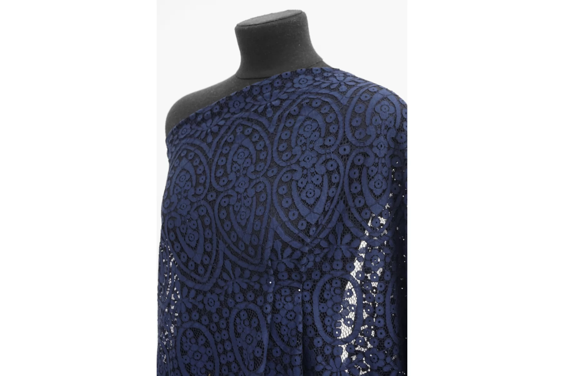 ЦЕНА УКАЗАНА ЗА ОТРЕЗ! (При заказе в метраже указывать 1) Итальянское хлопковое кружево глубокого синего оттенка с цветочно-орнаментальной выработкой. Основа материала из нейлона с выработанными элементами из хлопка, которые по контуру обработаны более объемной нитью с красивым лоском. Элементы среднего размера. Смотрится красиво! Тактильно материал приятный, ощущается фактура. Подойдет для пошива нарядного самостоятельного изделия (на подкладе ) или отделки отдельных элементов одежды.