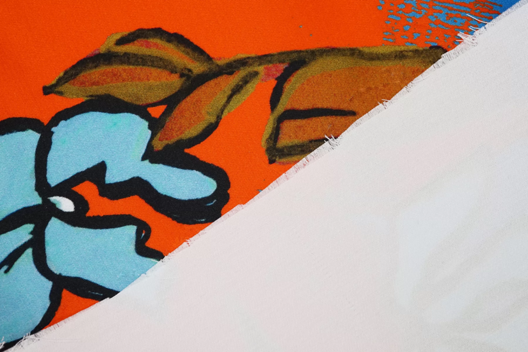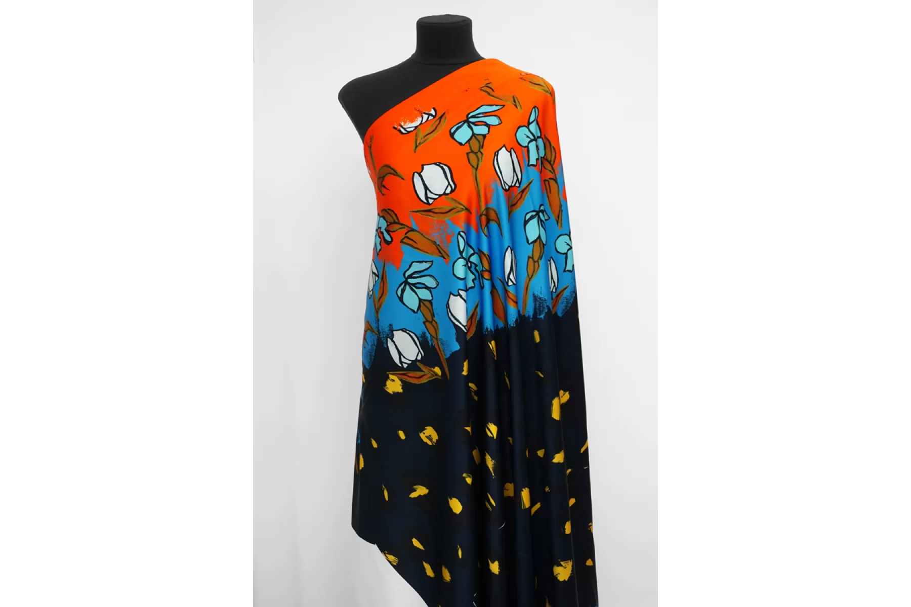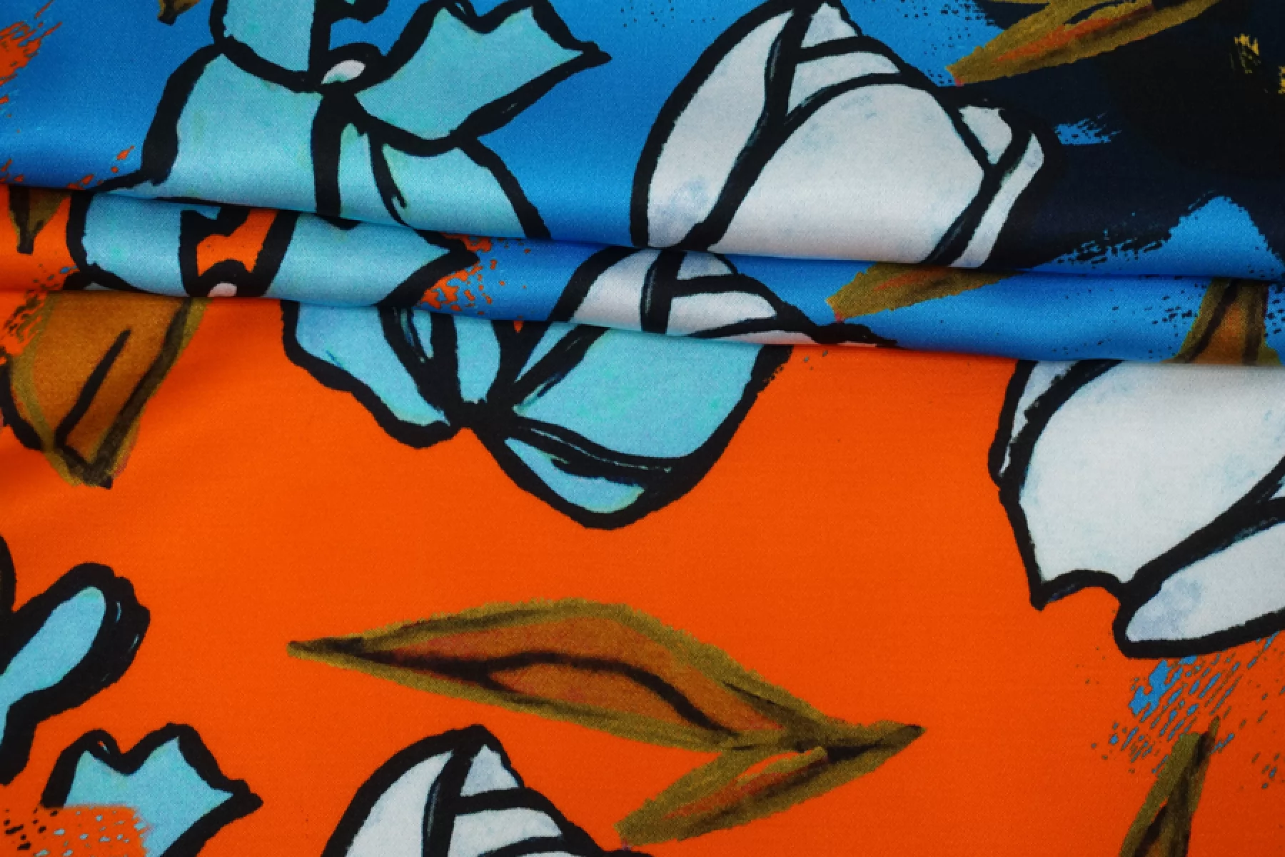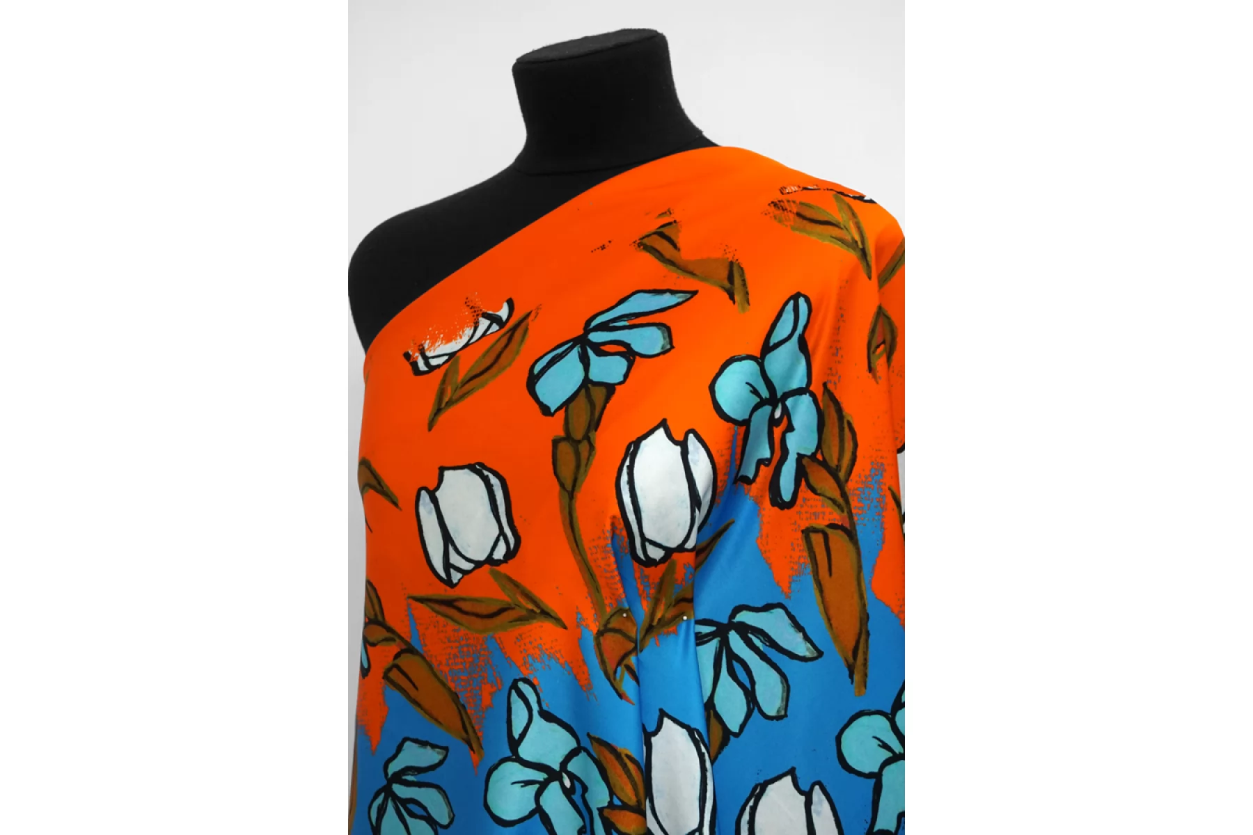 На отрезе полоса непрокраса , по середине купона! ВНИМАНИЕ! Ткань купонная, длина купона 195 см, цена за купон -3 100 руб. Очень красивый вискозный атлас в оранжево-синих и молочных цветовых сочетаниях с цветочным принтом выполненным под раскрой. Тактильно материал плотный, мягкий и очень приятный. Не просвечивает. Не тянется. Сминается, но восстанавливается. Форму практически не держит. С красивым блеском на лицевой стороне. Шикарнейший вариант на платья, юбки, костюмы, мягкие жакеты и другое. Обязательно учитывайте усадку 5-10%.