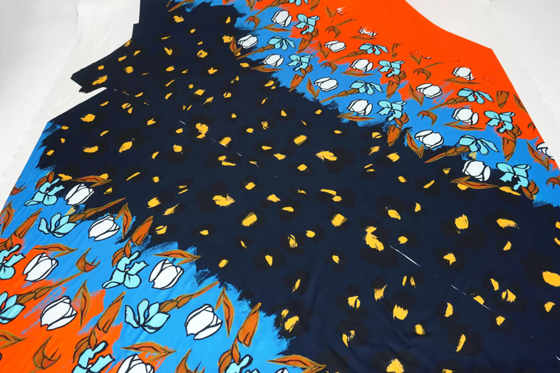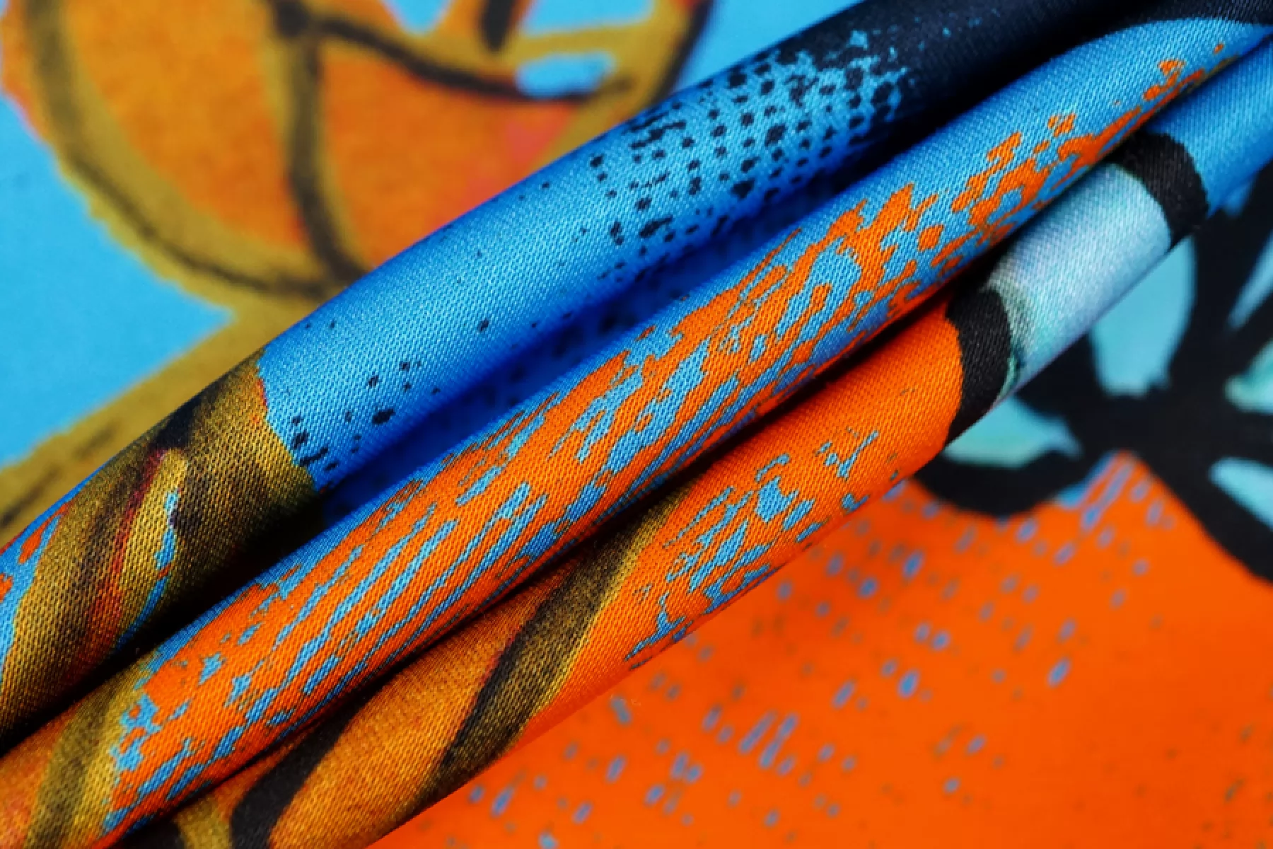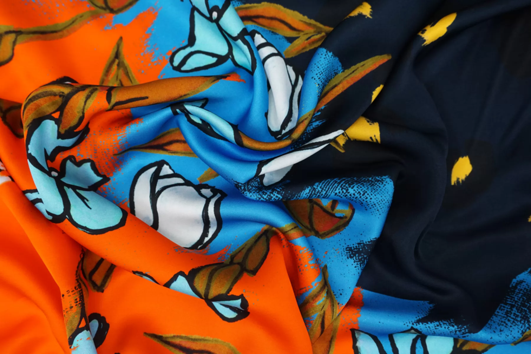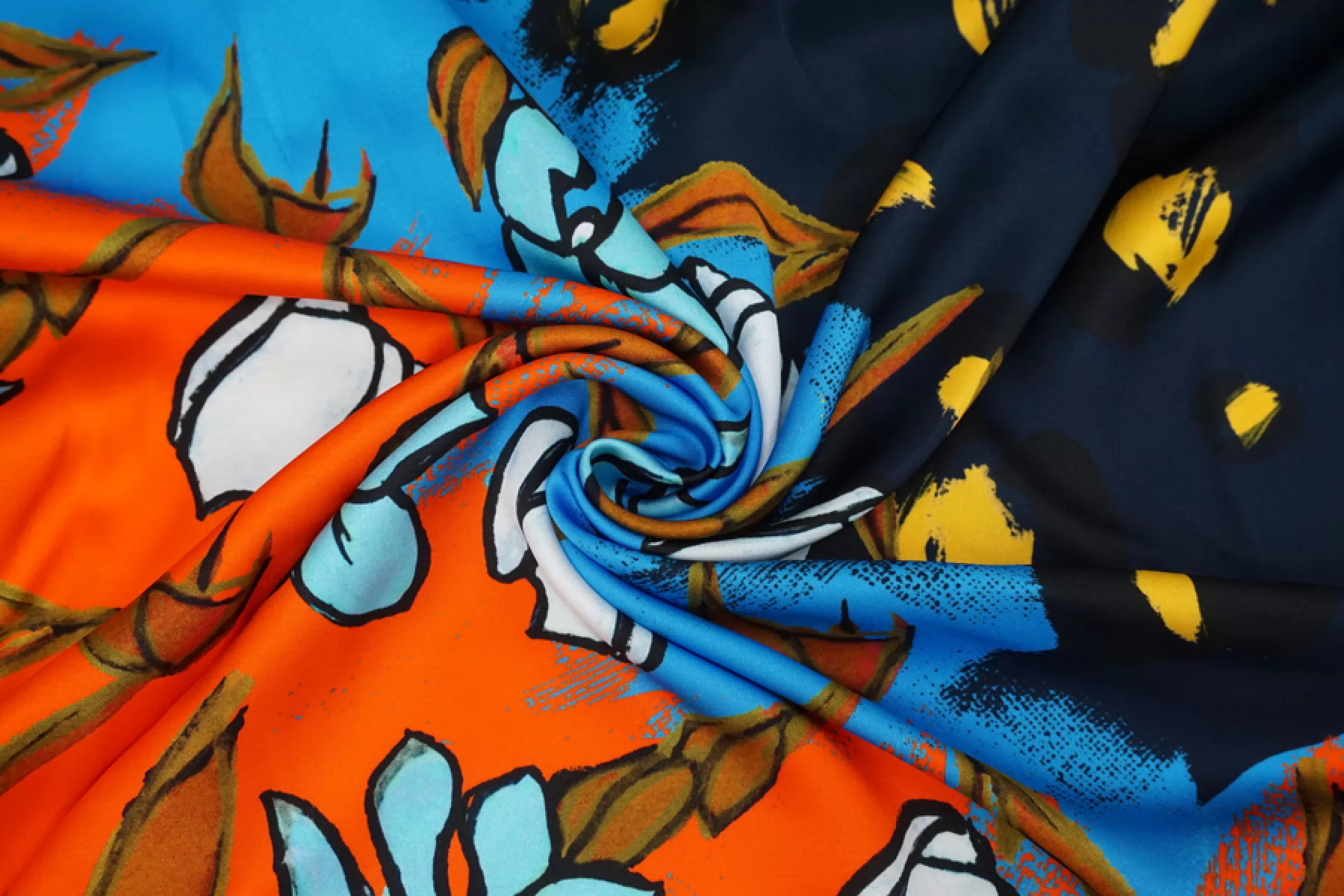 На отрезе полоса непрокраса , по середине купона! ВНИМАНИЕ! Ткань купонная, длина купона 195 см, цена за купон -3 100 руб. Очень красивый вискозный атлас в оранжево-синих и молочных цветовых сочетаниях с цветочным принтом выполненным под раскрой. Тактильно материал плотный, мягкий и очень приятный. Не просвечивает. Не тянется. Сминается, но восстанавливается. Форму практически не держит. С красивым блеском на лицевой стороне. Шикарнейший вариант на платья, юбки, костюмы, мягкие жакеты и другое. Обязательно учитывайте усадку 5-10%.