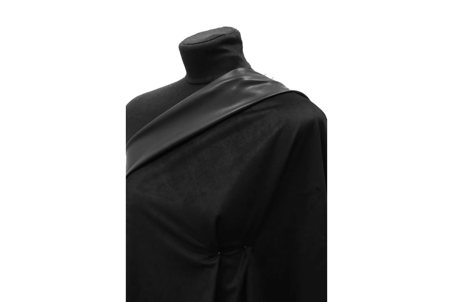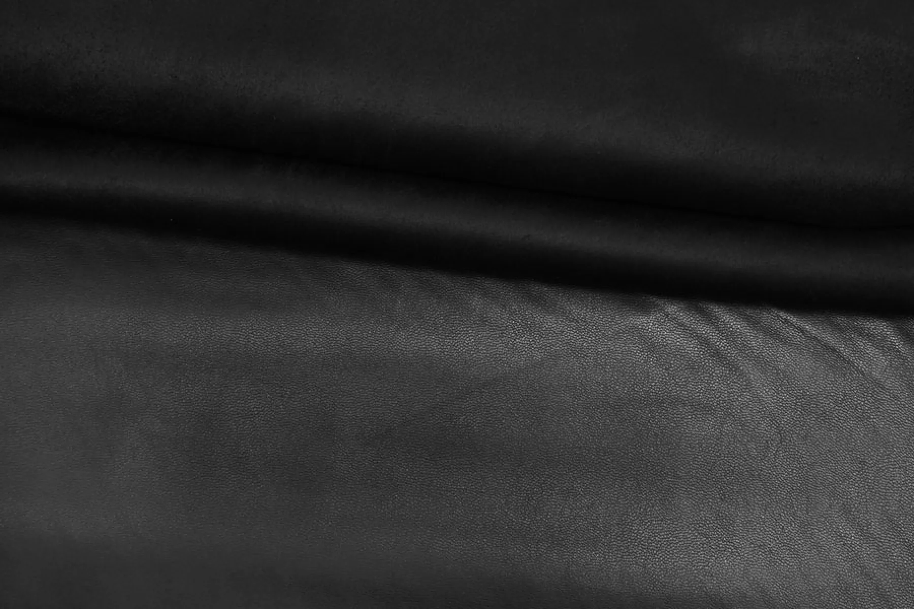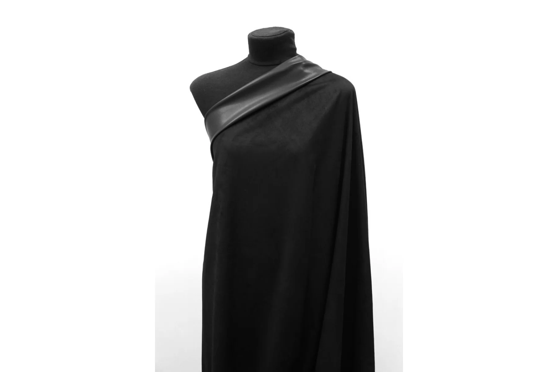 ЦЕНА УКАЗАНА ЗА ОТРЕЗ! (При заказе в метраже указывать 1) Итальянская двусторонняя экокожа с замшей, чёрного цвета. Сторона с экокожей, гладкая, скользящая, с красивым лоском и мелким тиснением, замшевая сторона с коротким ворсом. Слои склеены междый собой, не разделяются. Материал очень пластичный и эластичный. Тянется. Форму держит, а также очень красив в складках. Не просвечивает. Слегка мнется, но восстанавливается. Отличный вариант на демисезонные юбки, брюки, платья, куртки-рубашки.