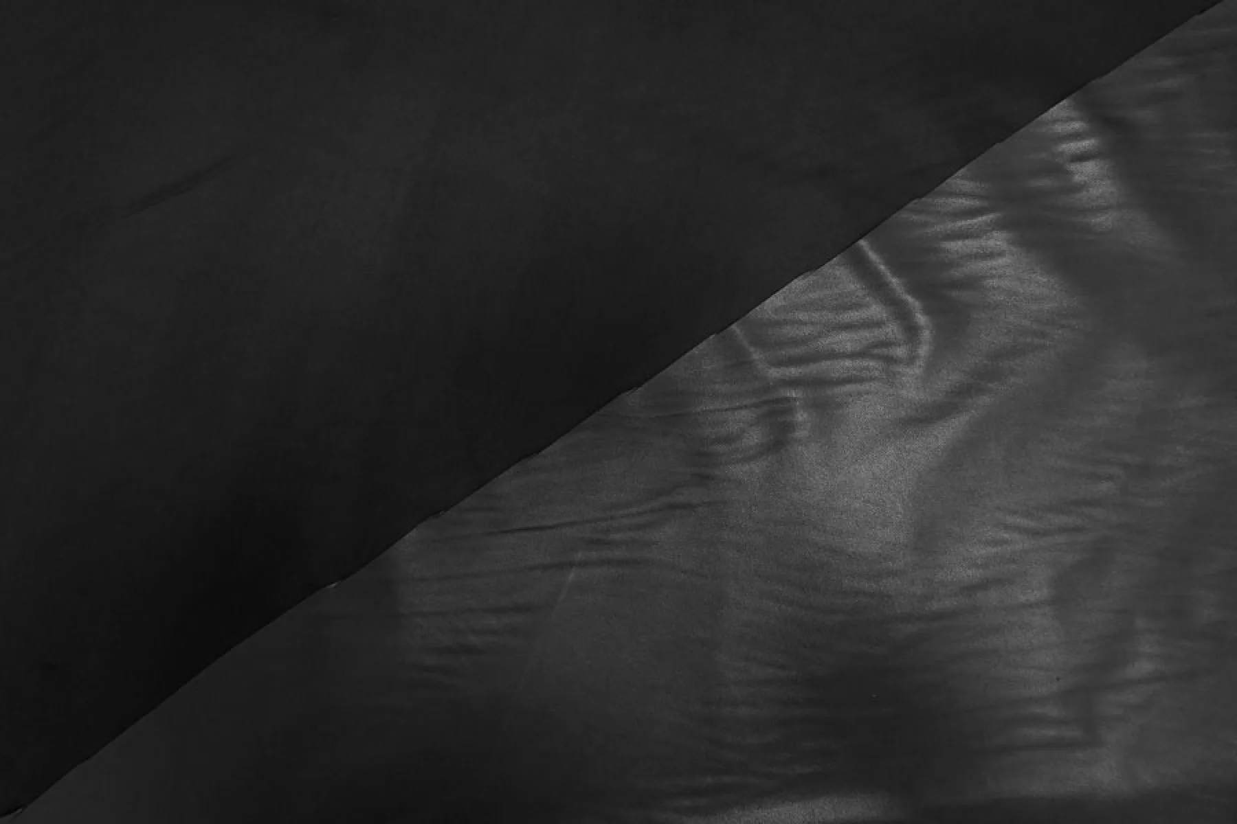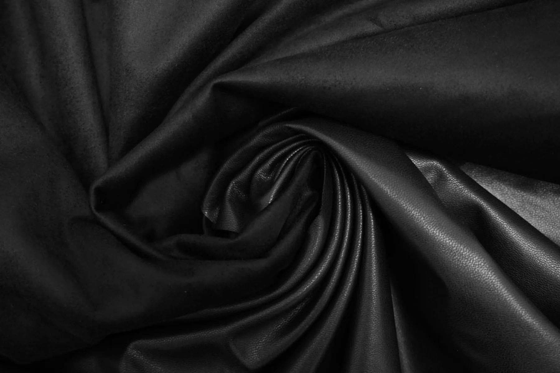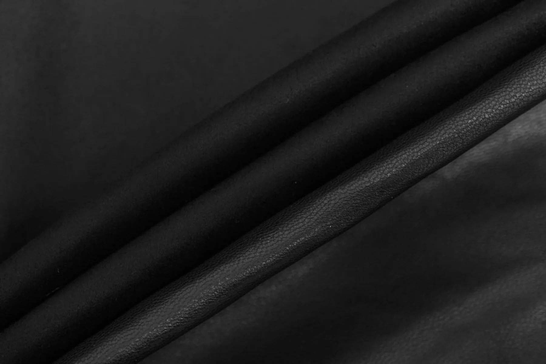 ЦЕНА УКАЗАНА ЗА ОТРЕЗ! (При заказе в метраже указывать 1) Итальянская двусторонняя экокожа с замшей, чёрного цвета. Сторона с экокожей, гладкая, скользящая, с красивым лоском и мелким тиснением, замшевая сторона с коротким ворсом. Слои склеены междый собой, не разделяются. Материал очень пластичный и эластичный. Тянется. Форму держит, а также очень красив в складках. Не просвечивает. Слегка мнется, но восстанавливается. Отличный вариант на демисезонные юбки, брюки, платья, куртки-рубашки.