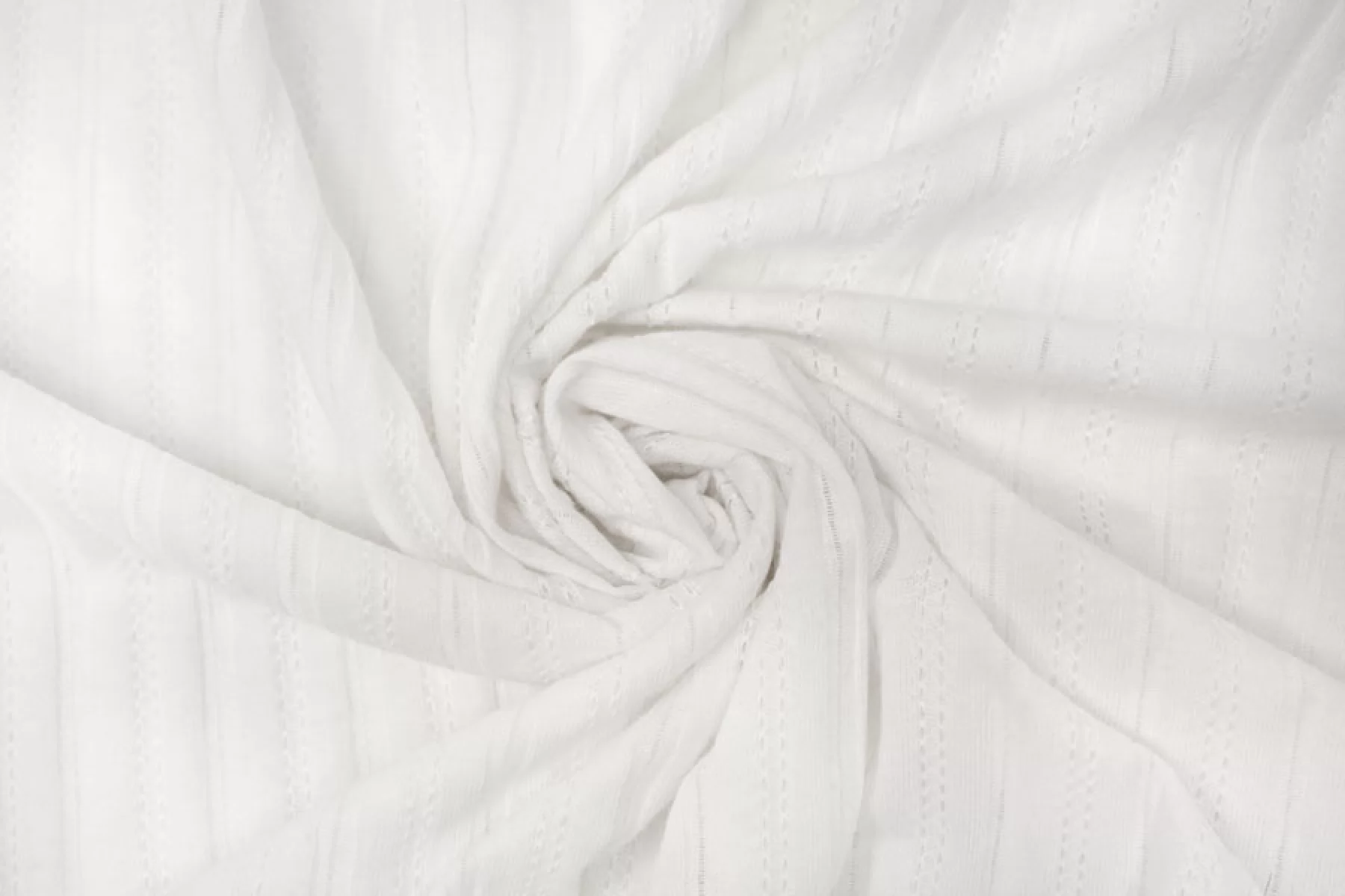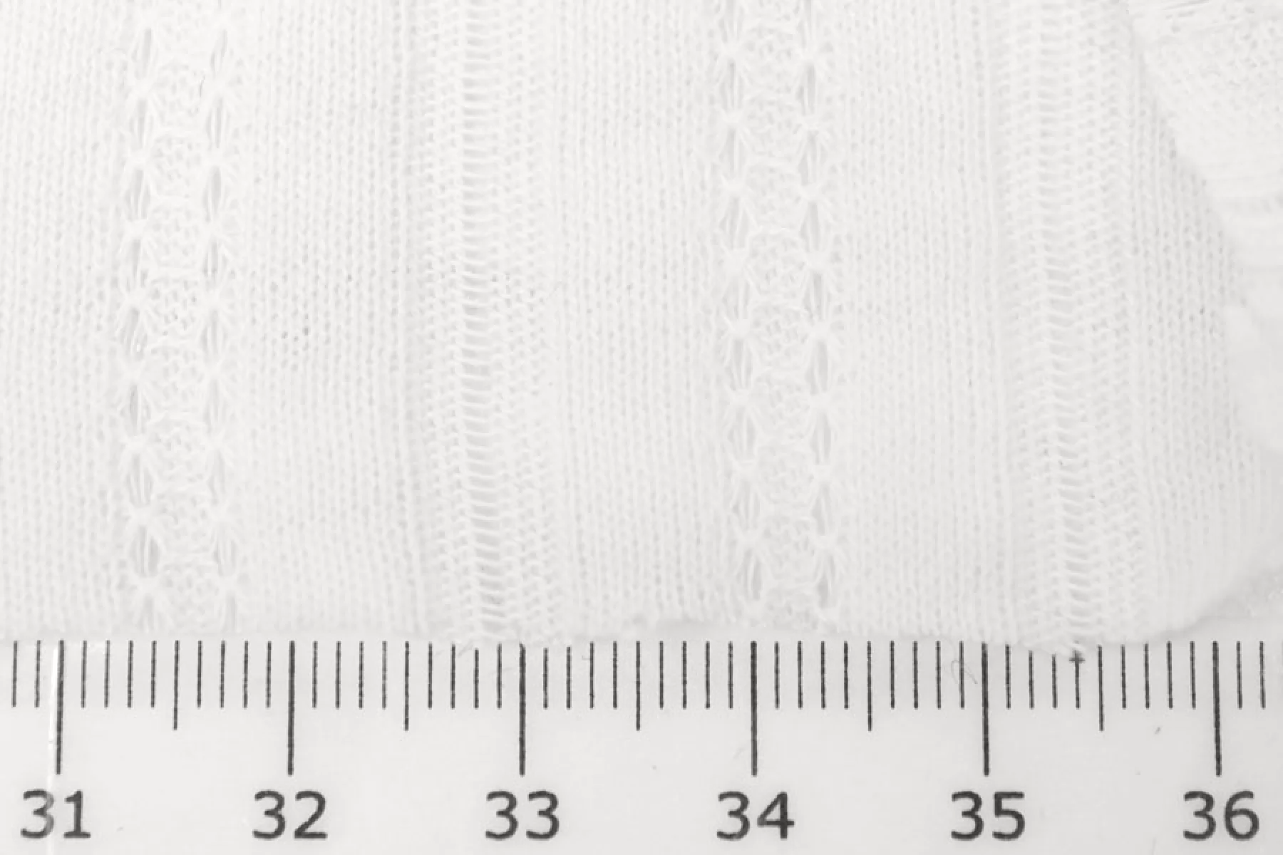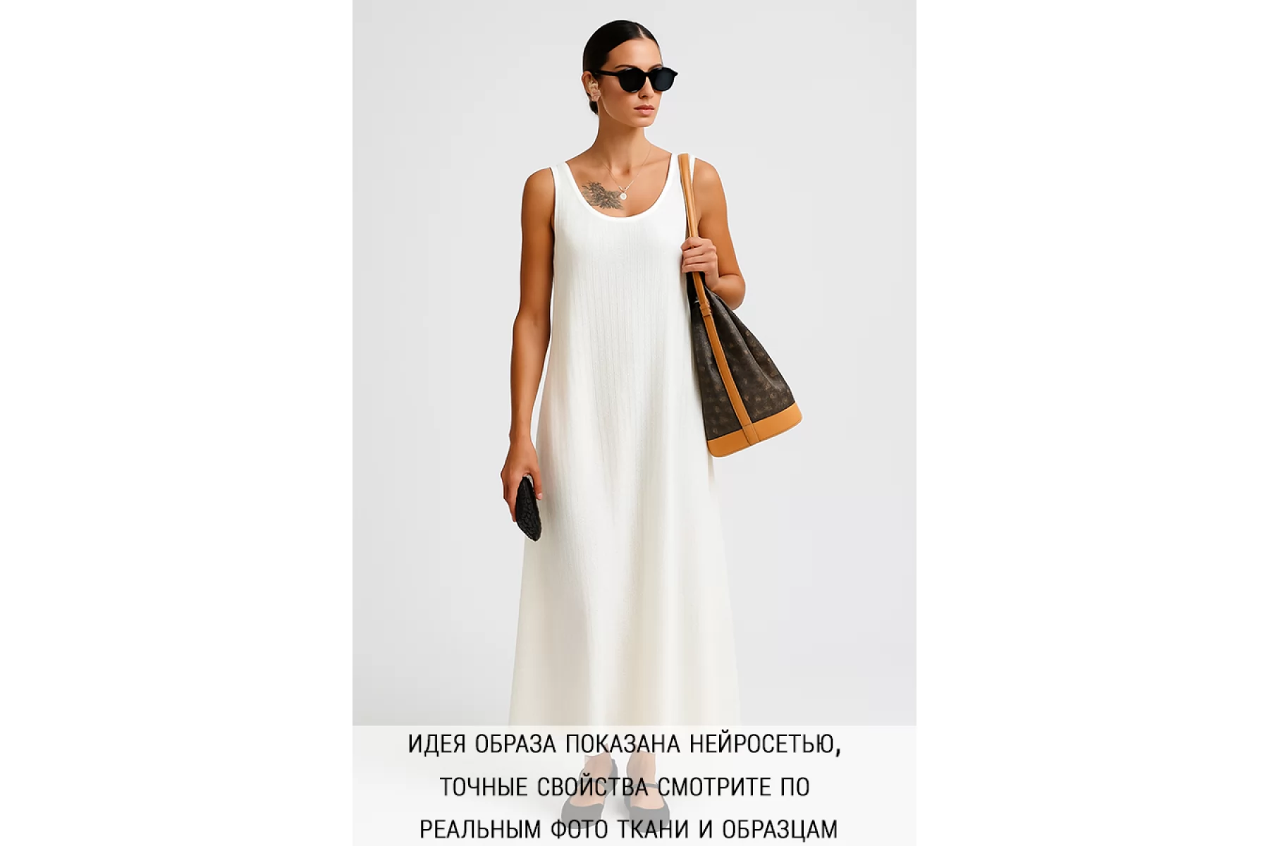 Внимание! Присутствуют стрелки, дыры, пятна и уплотнения см. фото. Классный хлопковый трикотаж фактурный с перфорацией молочного оттенка. На ощупь очень приятный и мягкий. Просвечивает силуэт. Сминается. Отлично тянется за счет плетения. Форму держит. Шьем платья, юбки, сарафаны и туники. Для однослойных изделий при необходимости используйте подкладочный материал. Обязательно учитывайте усадку 5-10%.
