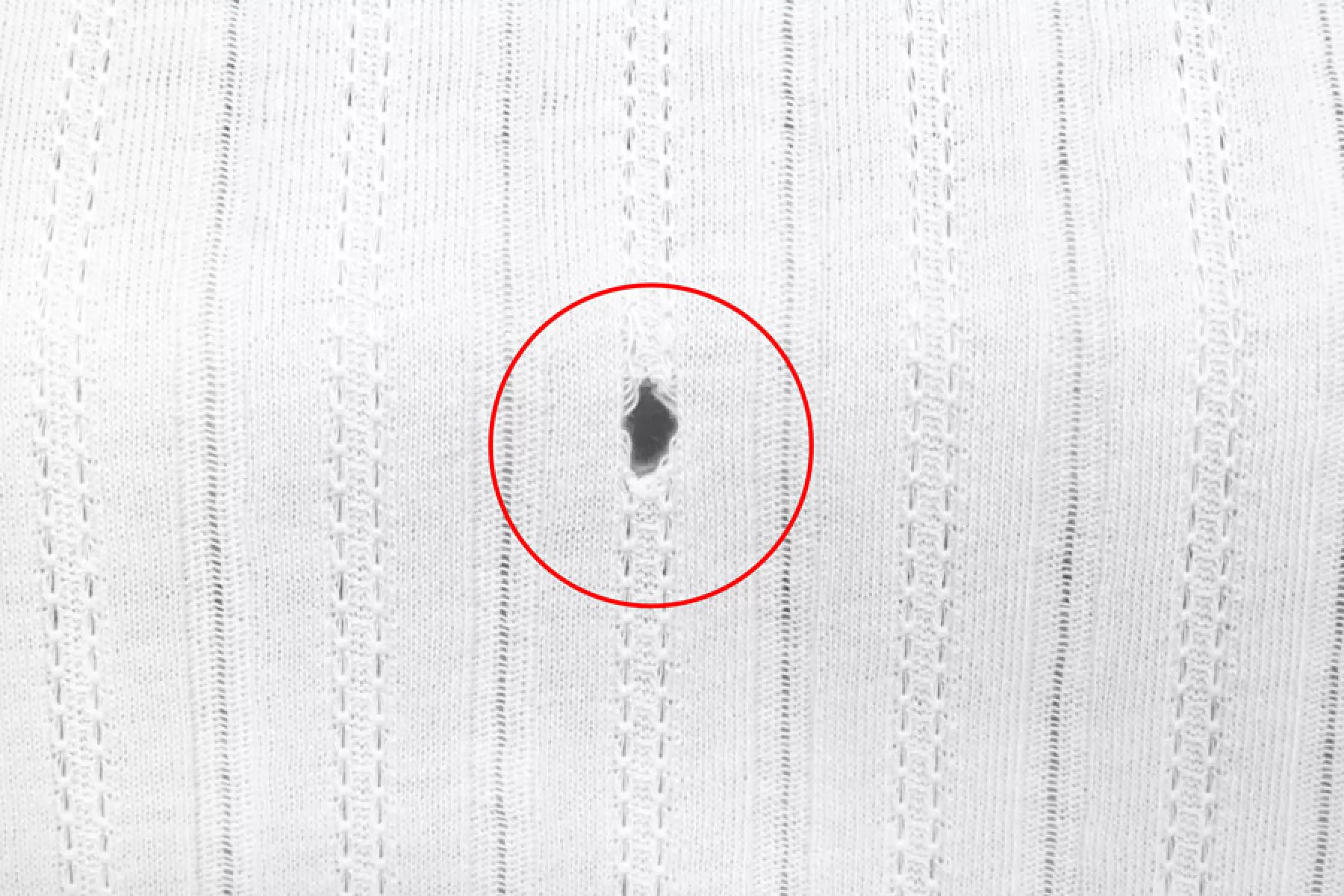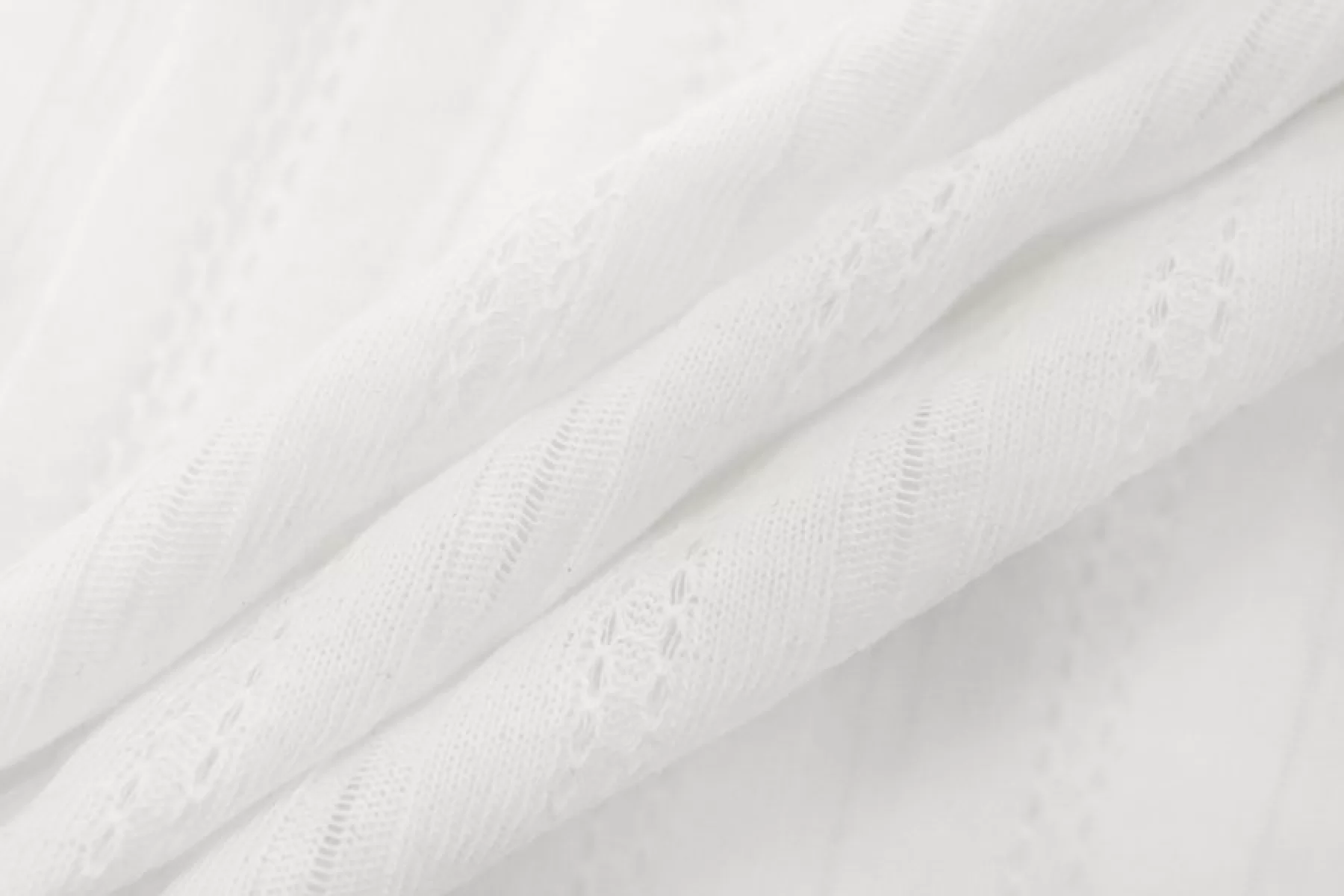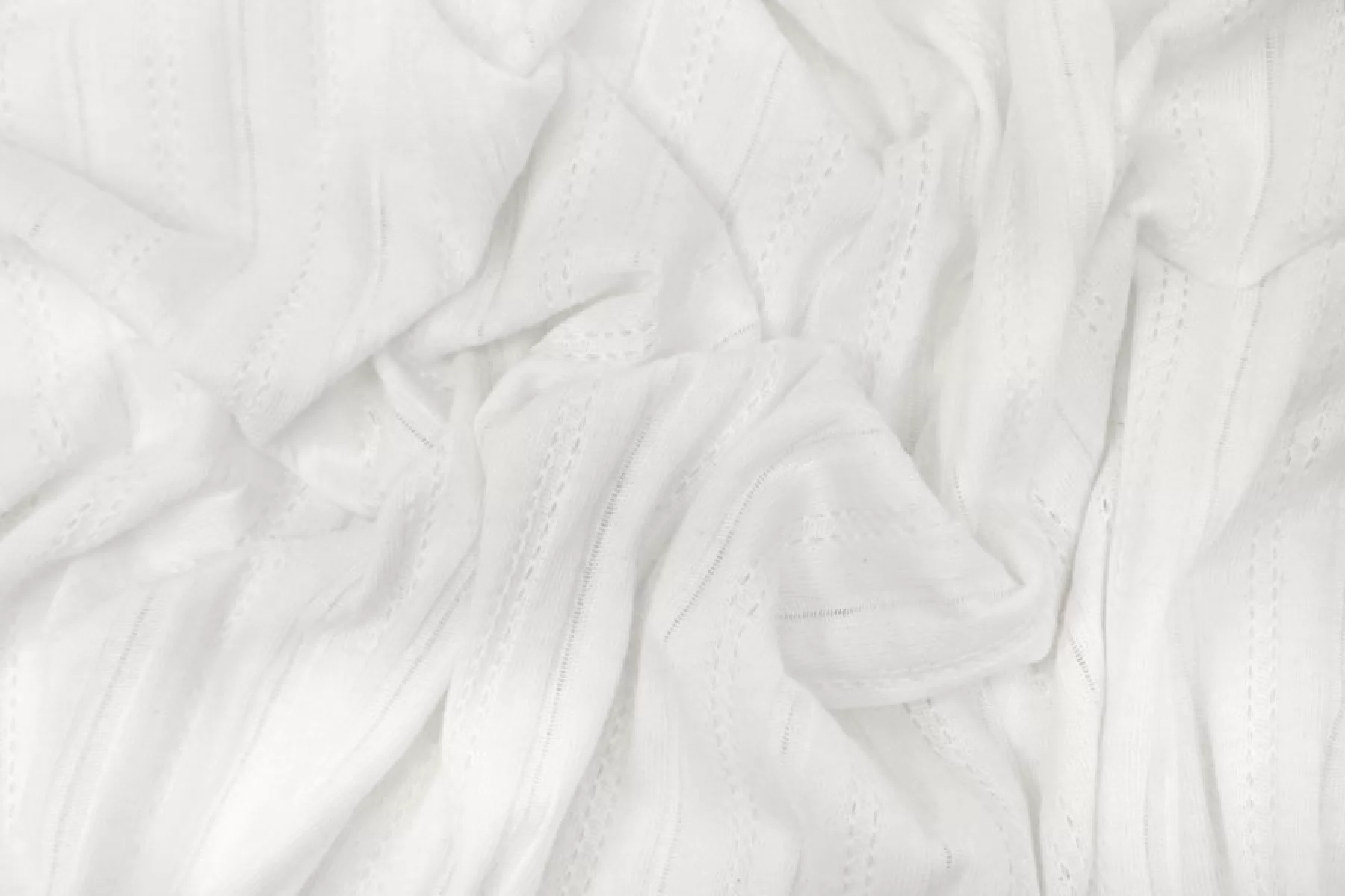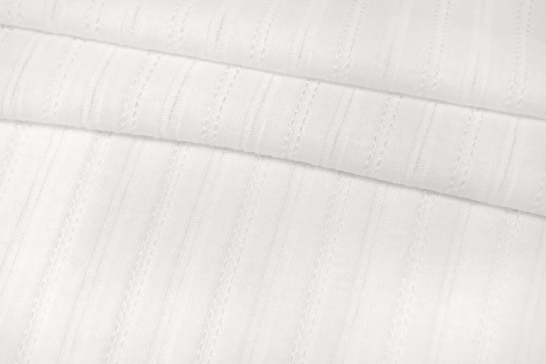 Внимание! Присутствуют стрелки, дыры, пятна и уплотнения см. фото. Классный хлопковый трикотаж фактурный с перфорацией молочного оттенка. На ощупь очень приятный и мягкий. Просвечивает силуэт. Сминается. Отлично тянется за счет плетения. Форму держит. Шьем платья, юбки, сарафаны и туники. Для однослойных изделий при необходимости используйте подкладочный материал. Обязательно учитывайте усадку 5-10%.