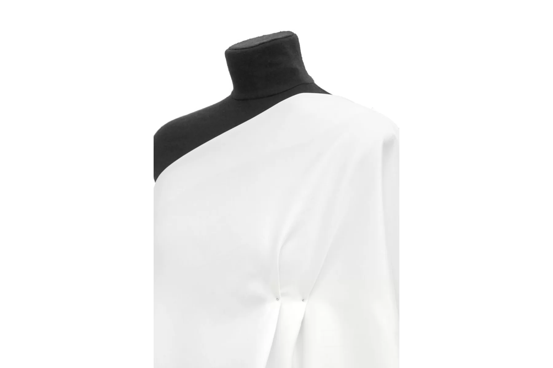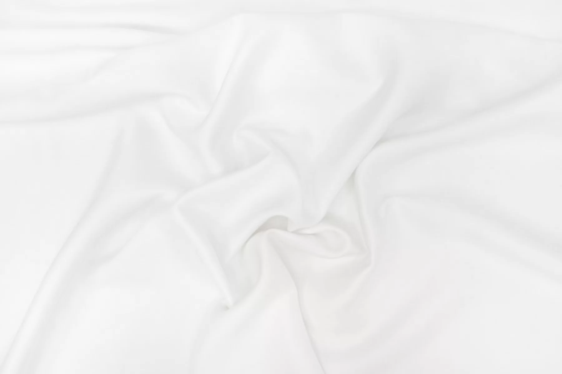 На отрезе черные точки! Костюмно-плательная вискоза, двусторонняя, с ацетатом диагонального плетения!Обе стороны белого оттенка. Вторая сторона может быть использована в работе! Тактильно приятная, мягкая, гладкая, блестящая. Не тянется, не просвечивает. Плотная, тяжеленькая. Красиво смотрится в складках, форму не держит. Немного мнется, частично восстанавливается. Шьем платья, костюмы, юбки. Обязательно учитывайте усадку 5-10%.