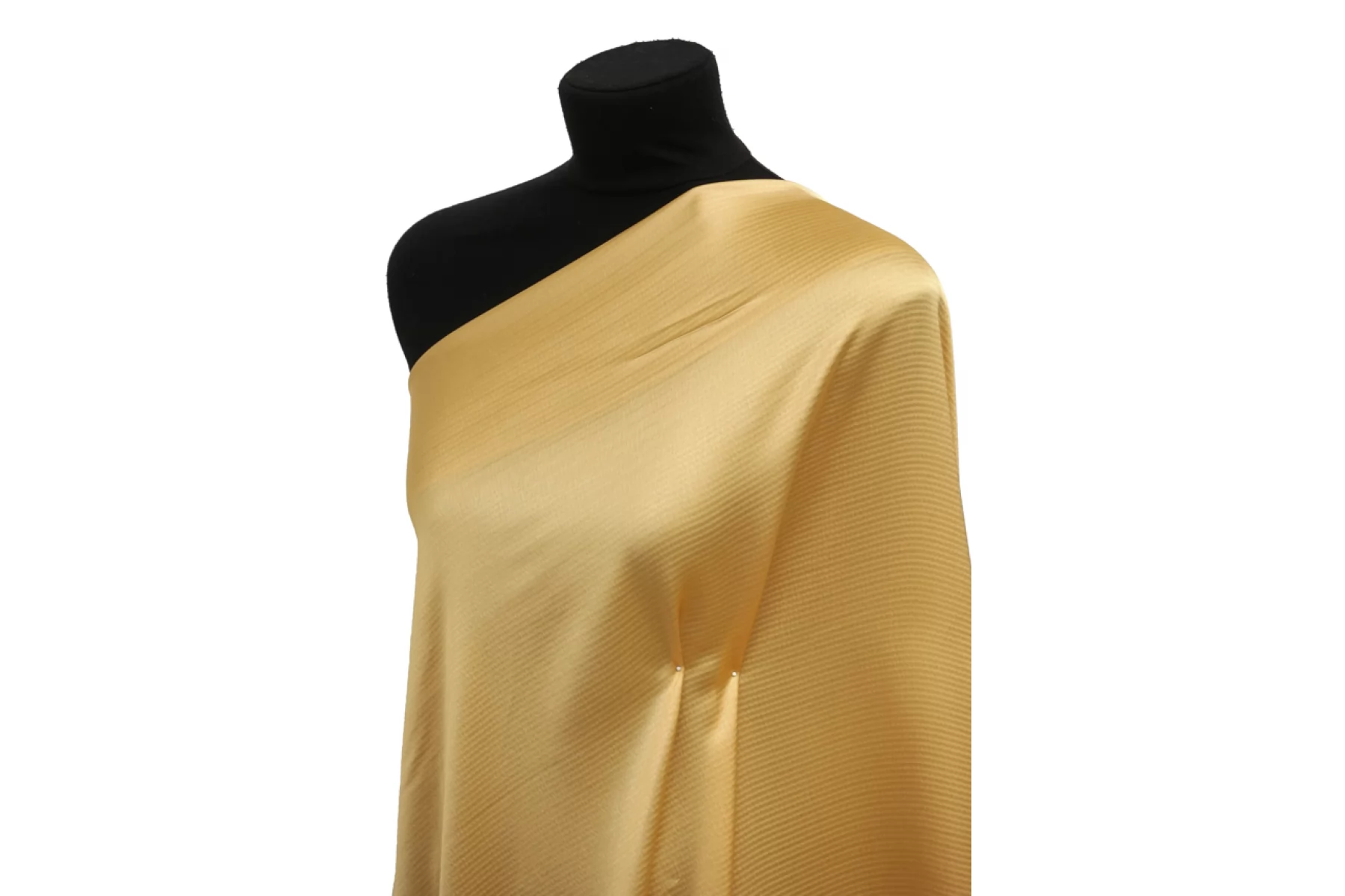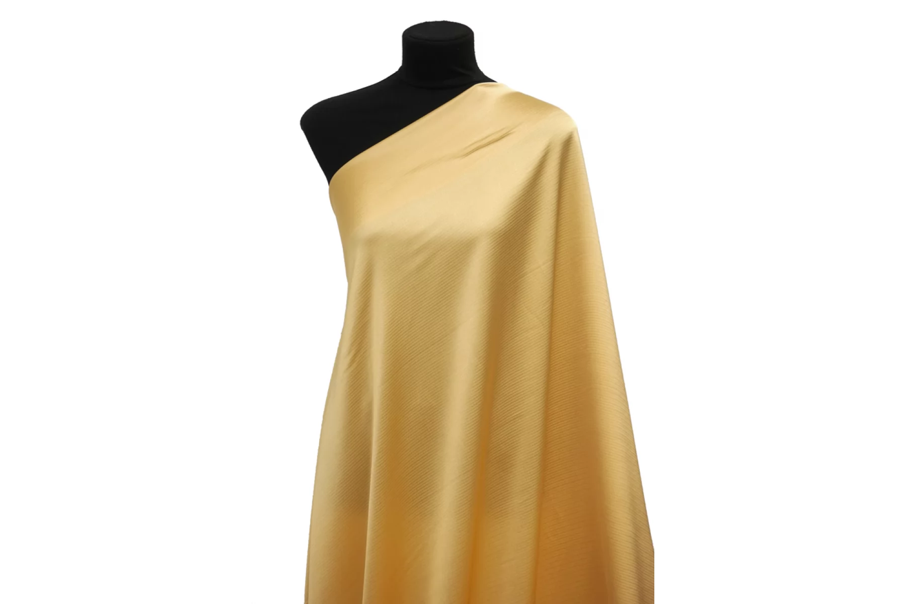 ЦЕНА УКАЗАНА ЗА ОТРЕЗ! (При заказе в метраже указывать 1) Шикарная плательная вискоза FORTE FORTE пастельного желтого оттенка с выработкой тонкой полоски, что создает фактуру. С лицевой стороны поверхность с атласным блеском и гладкостью, а обратная сторона матовая и шероховатая. Тактильно приятная и мягкая. Пластичная, красиво струится и смотрится в складке. Просвечивает силуэт. Сминается. Не тянется, совсем слегка пружинит за счет плетения. Прекрасно подойдет на платья, юбки, рубашки, а также на одежду в бельевом стиле. Обязательно учитывайте усадку 5-10%
