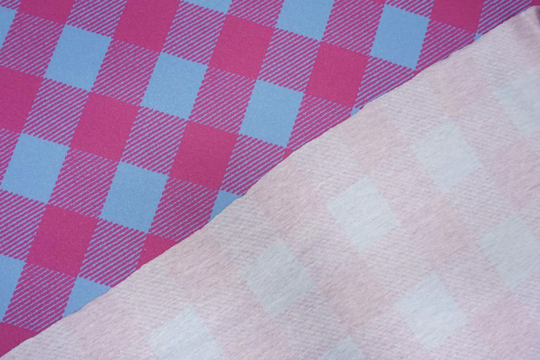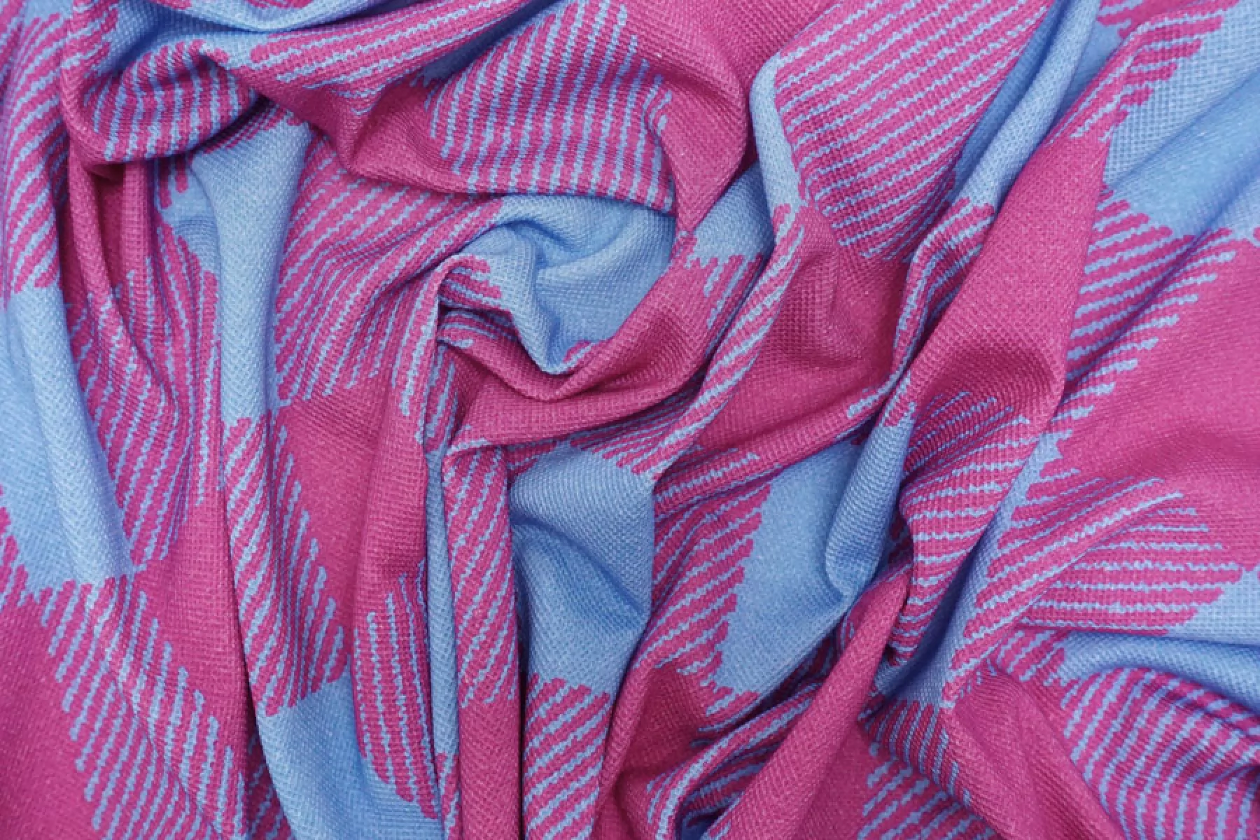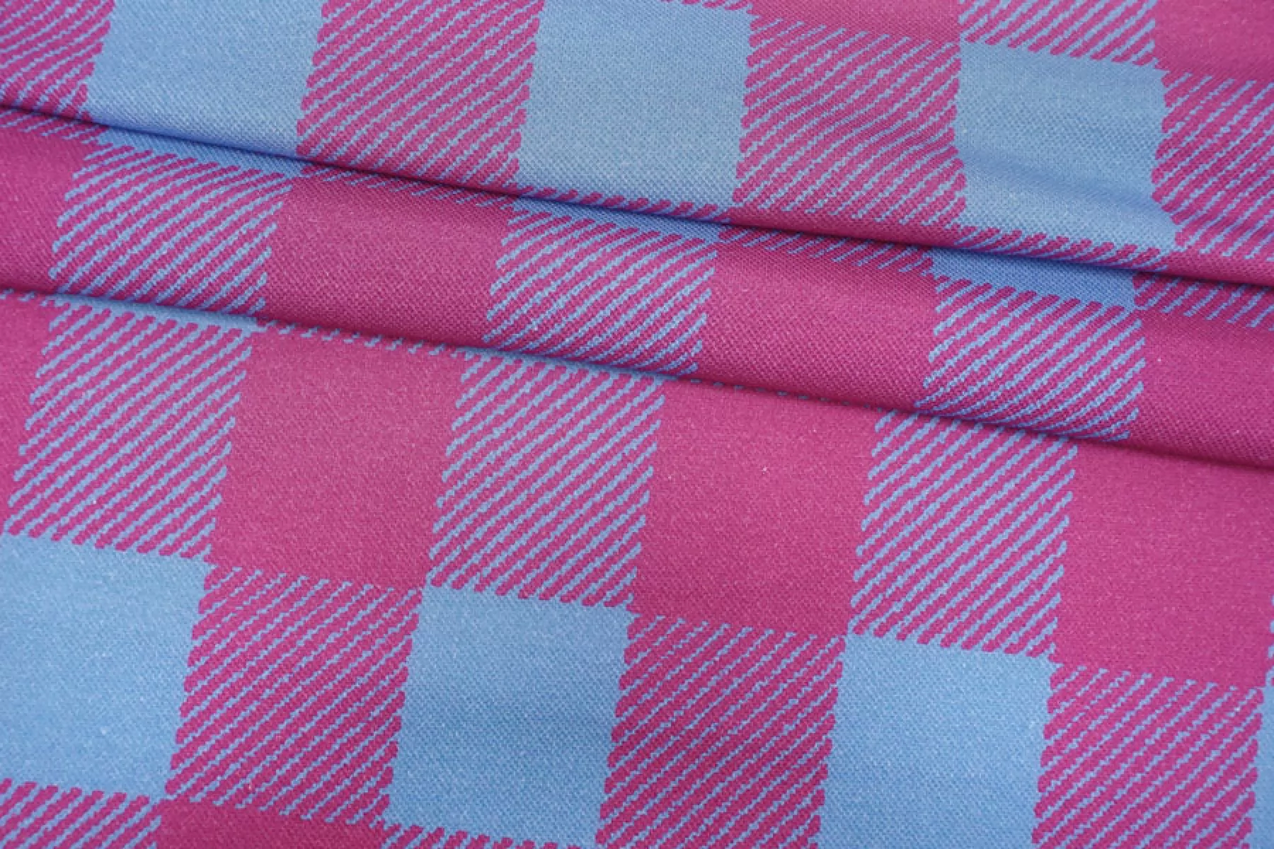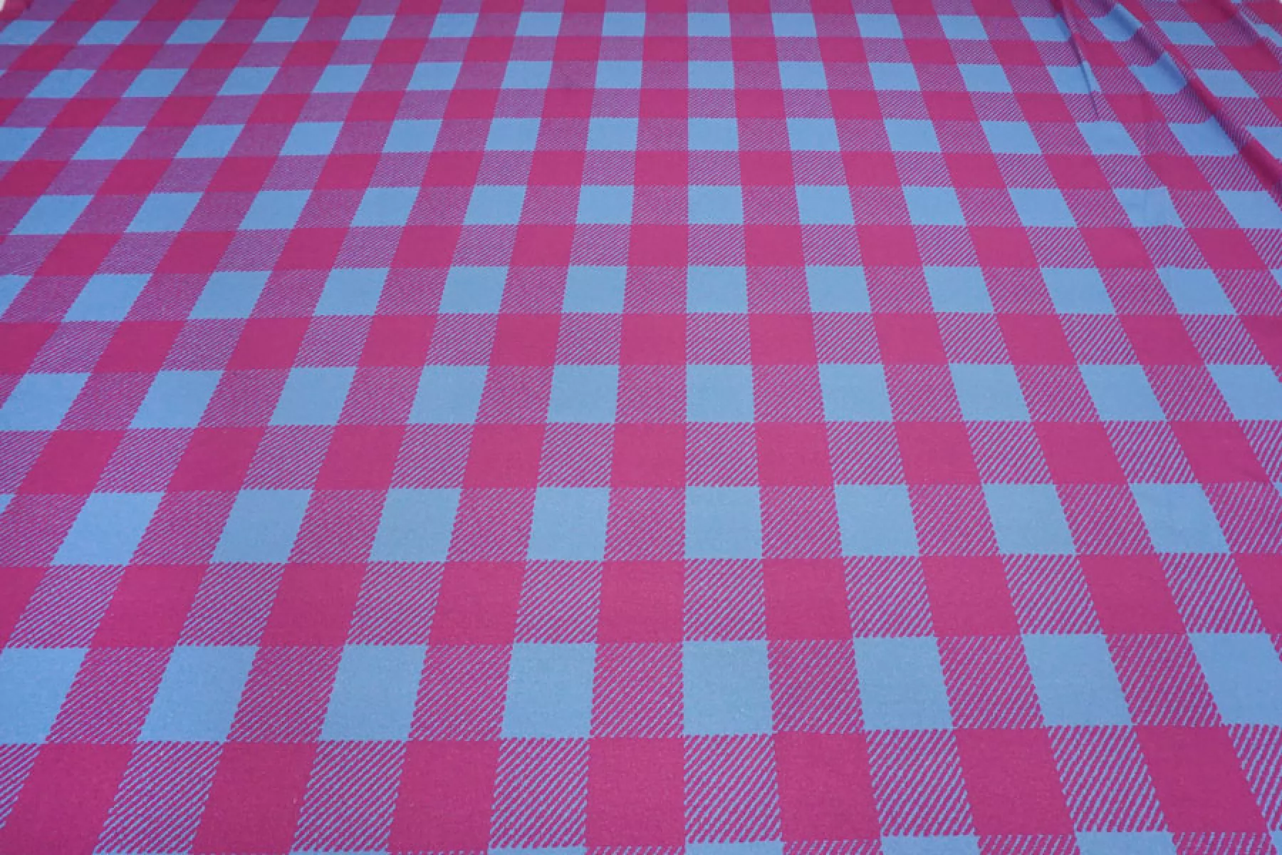 Внимание! Присутствуют белые точки (непрокрас)! Трикотаж пике из хлопка в интересной яркой расцветке в виде крупной розово-голубой клетки. Материал тактильно очень приятный, немного суховатый, ощущается фактура плетения с лицевой стороны, с изнанки ткань гладкая и скользящая. Тоненький, просвечивает силуэт на просвет. Хорошо тянется благодаря плетению. Материал имеет очень хорошую пластику, красиво драпируется и держит форму. Сминается, но быстро восстанавливается. Идеальный вариант для пошива рубашек и футболок-поло.